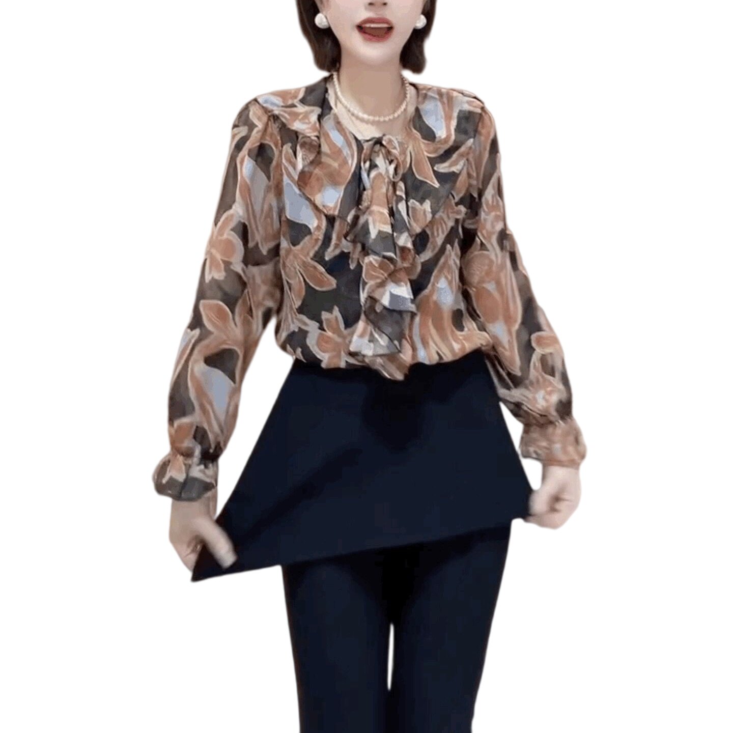 女洋气轻奢宽松系带上衣荷叶边小衫 衬衫 复古碎花雪纺V领长袖 法式