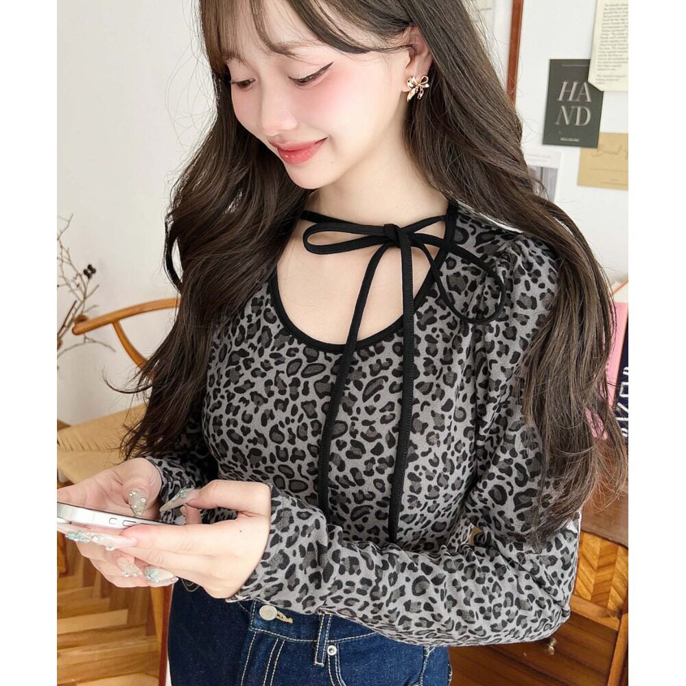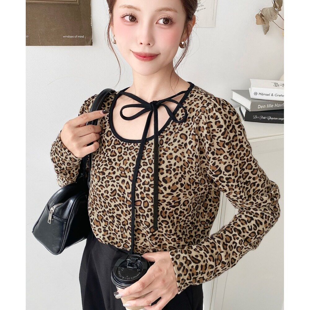 女装 领结设计 豹纹印花U领泡泡袖 女衫 mt07 长袖 日本直邮moment