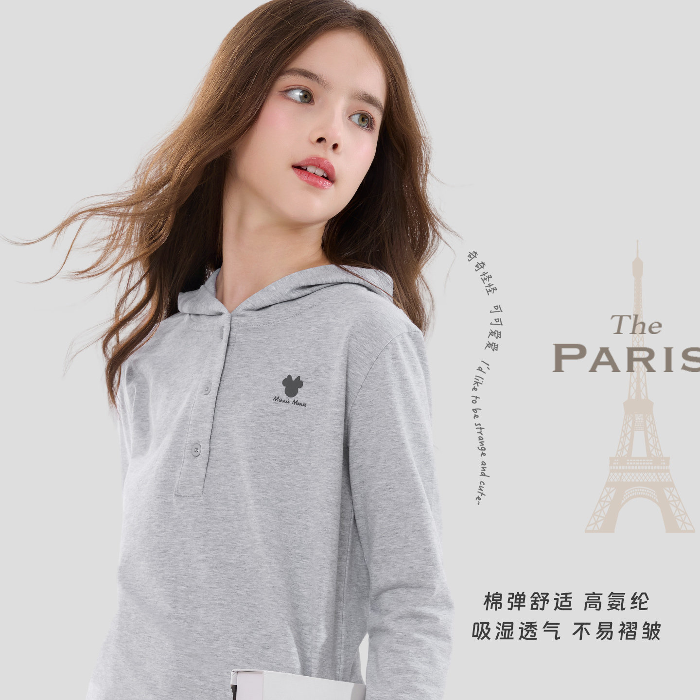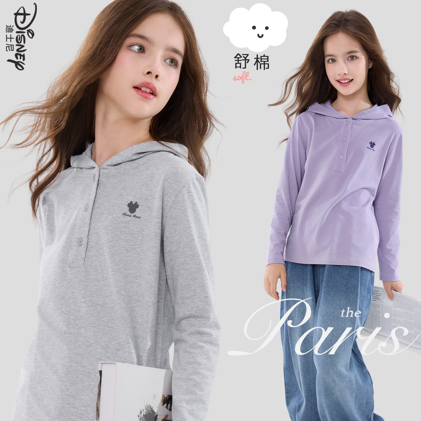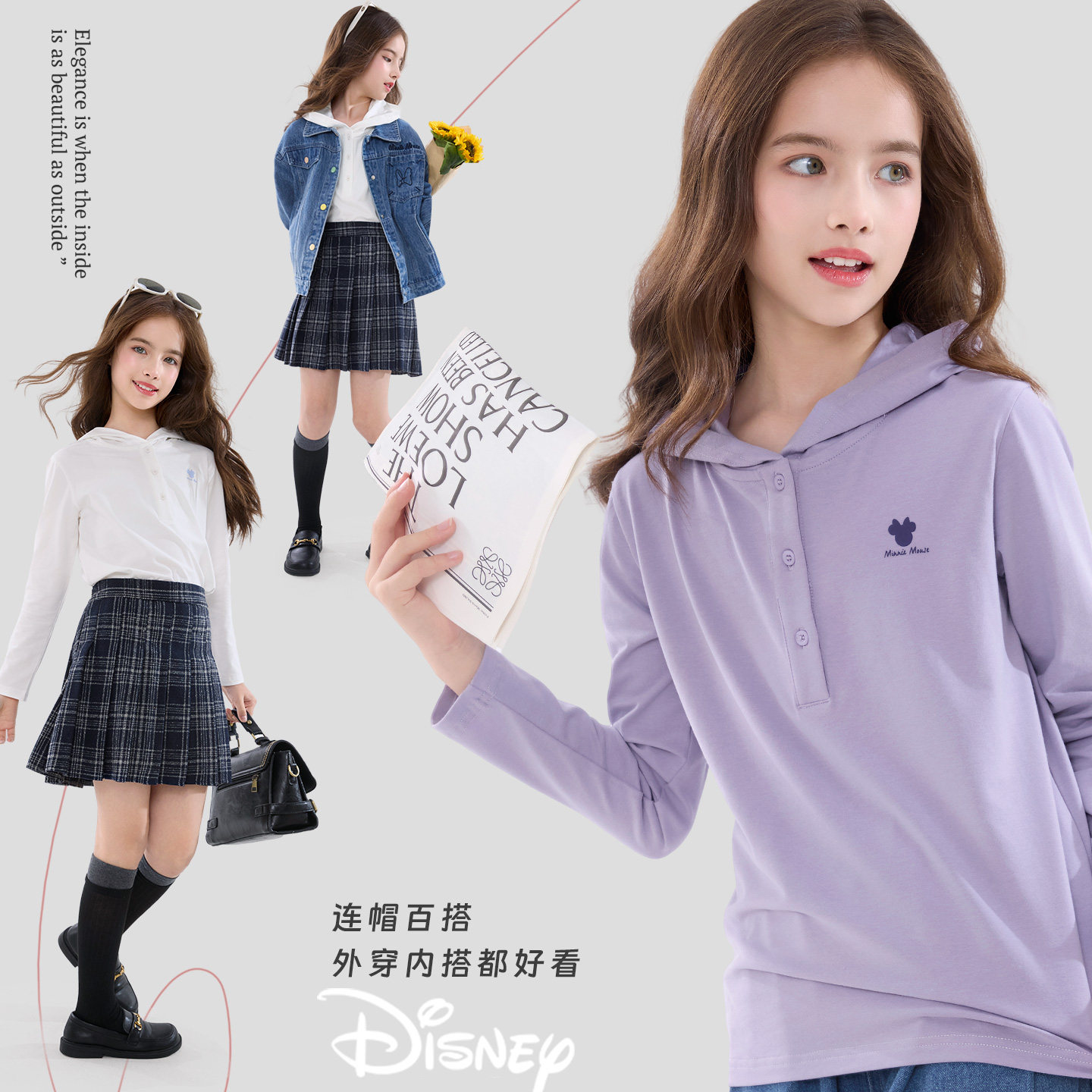 洋气大童青少年装 迪士尼女童T恤长袖 秋季 儿童连帽打底衫 2026春装