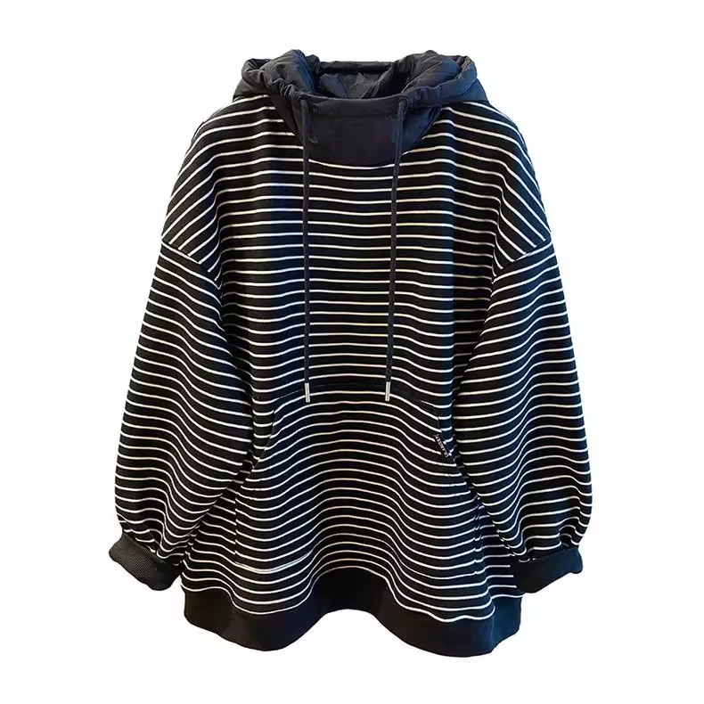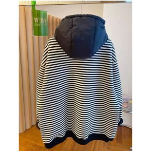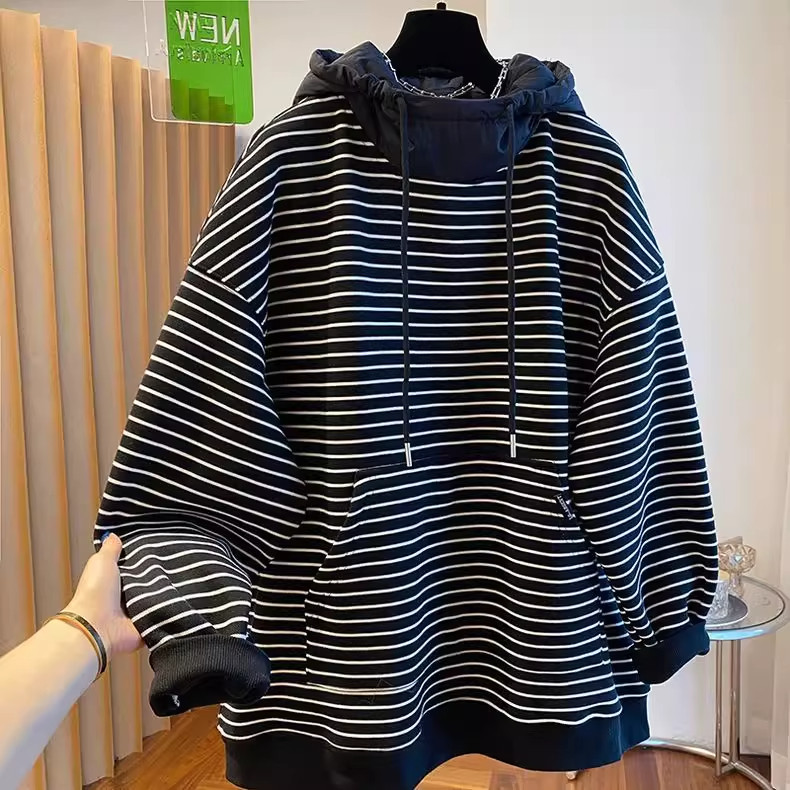 大码 复古宽松休闲上衣2 300斤慵懒风条纹连帽卫衣外套男女春秋美式
