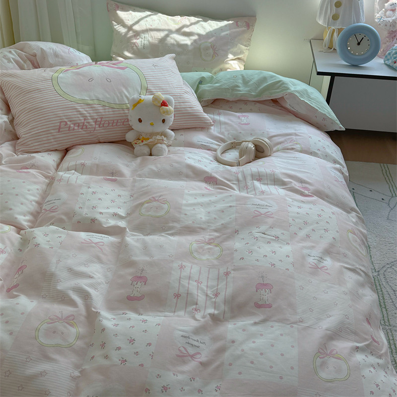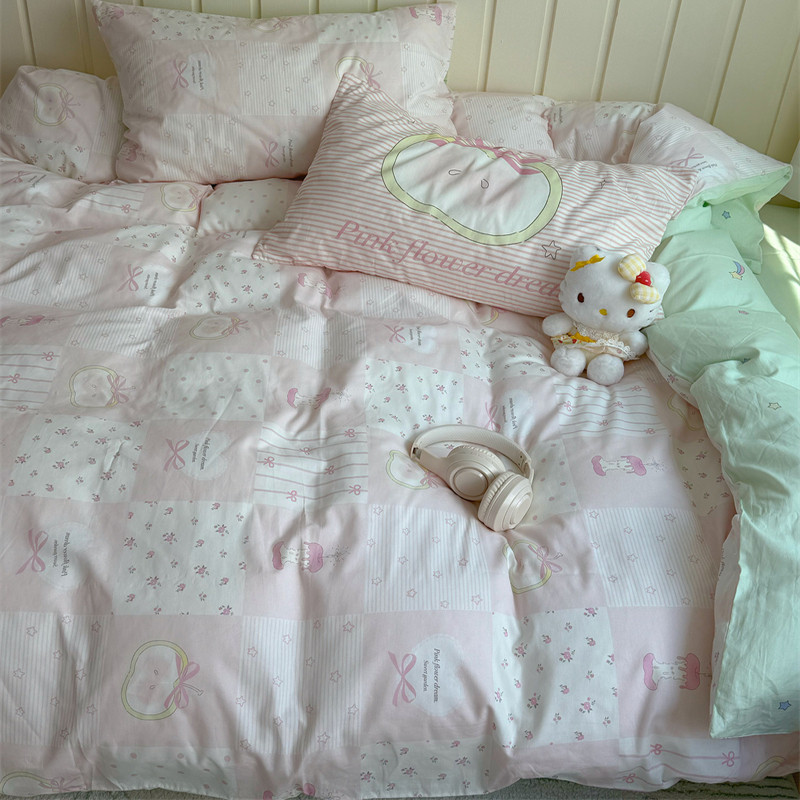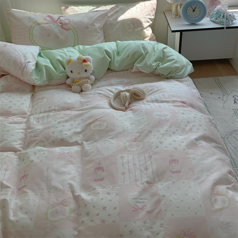 梨梦 可爱纯棉四件套全棉床单被套宿舍三件套床上用品 粉格苹果