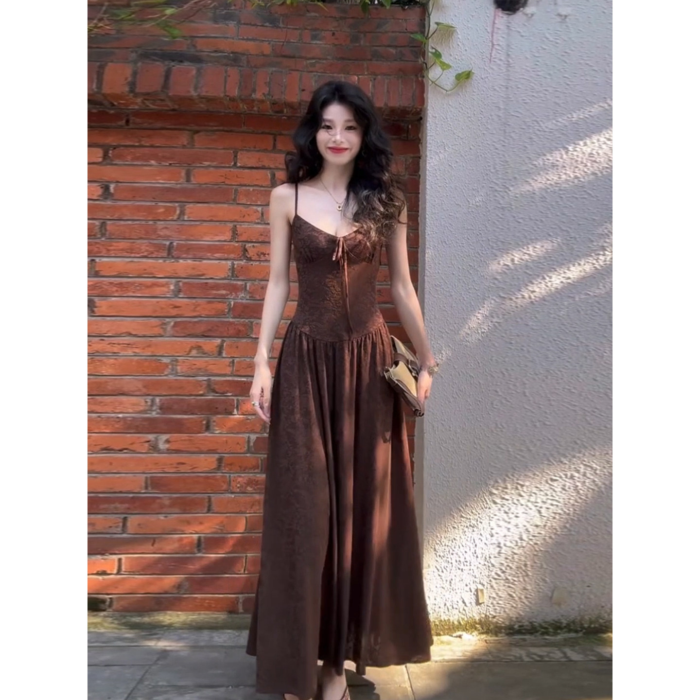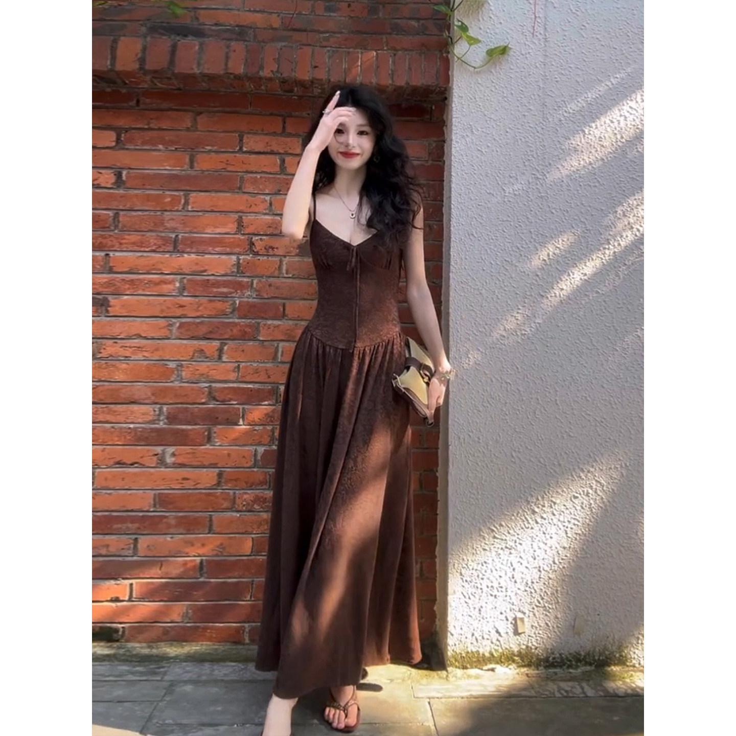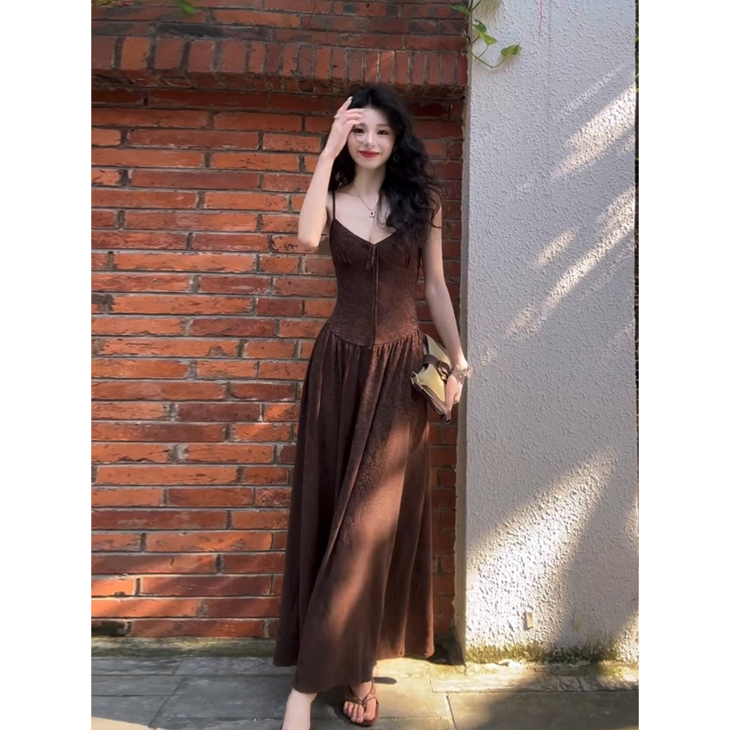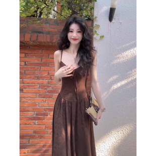 XZY 微胖港风复古棕色V领吊带连衣裙女26年夏高级感收腰大摆长裙