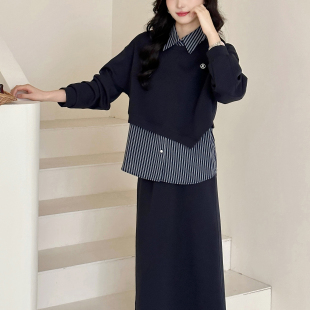 衬衫 糖安妮 条纹无袖 圆领卫衣 卫衣半身裙三件套组 减龄学院风