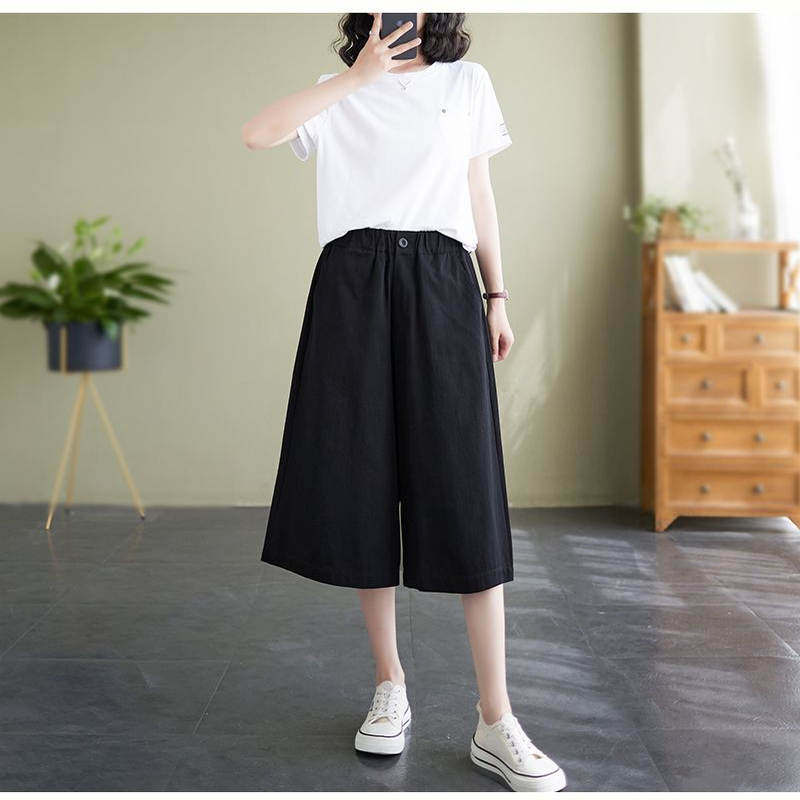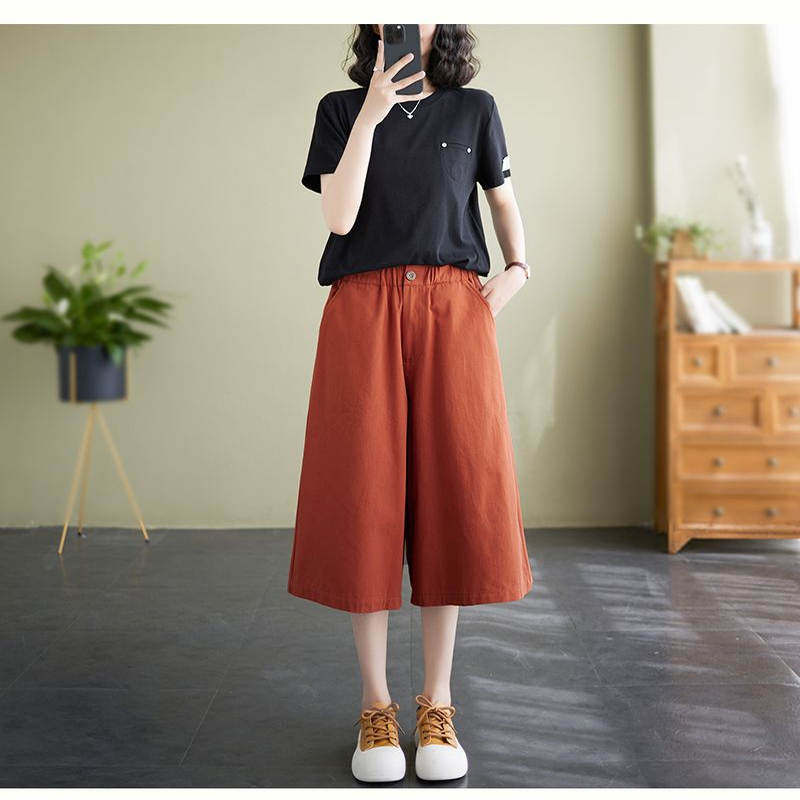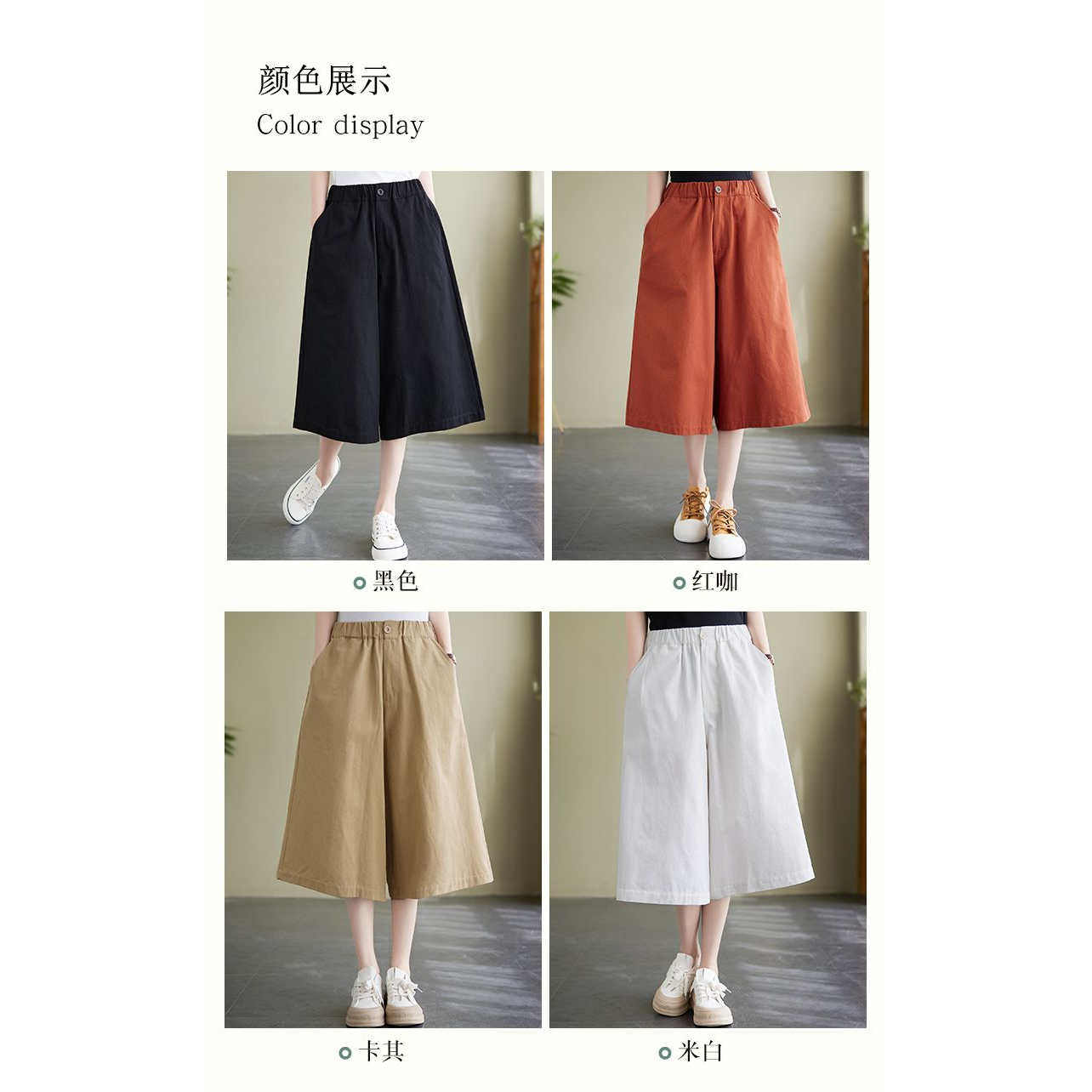显瘦休闲阔腿裤 夏季 松紧腰宽松百搭大码 妈妈纯棉高腰七分裤 女 新款