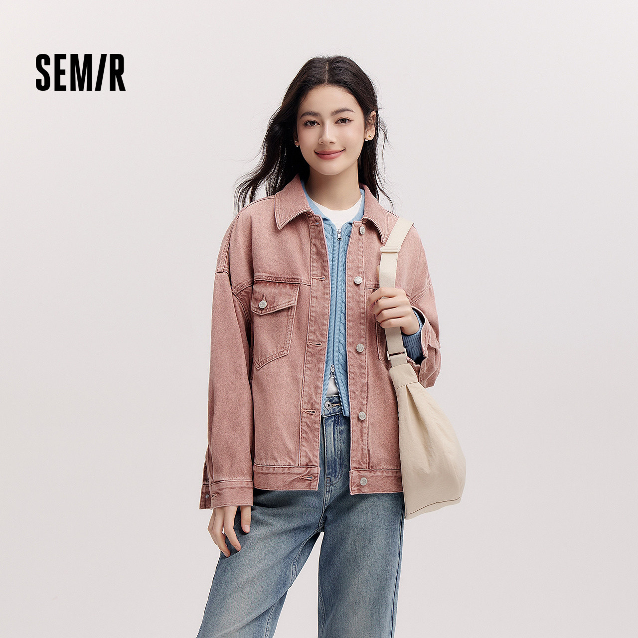 含莱赛尔夹克 翻领做旧宽松落肩衣服美式 森柔 森马牛仔外套女春季