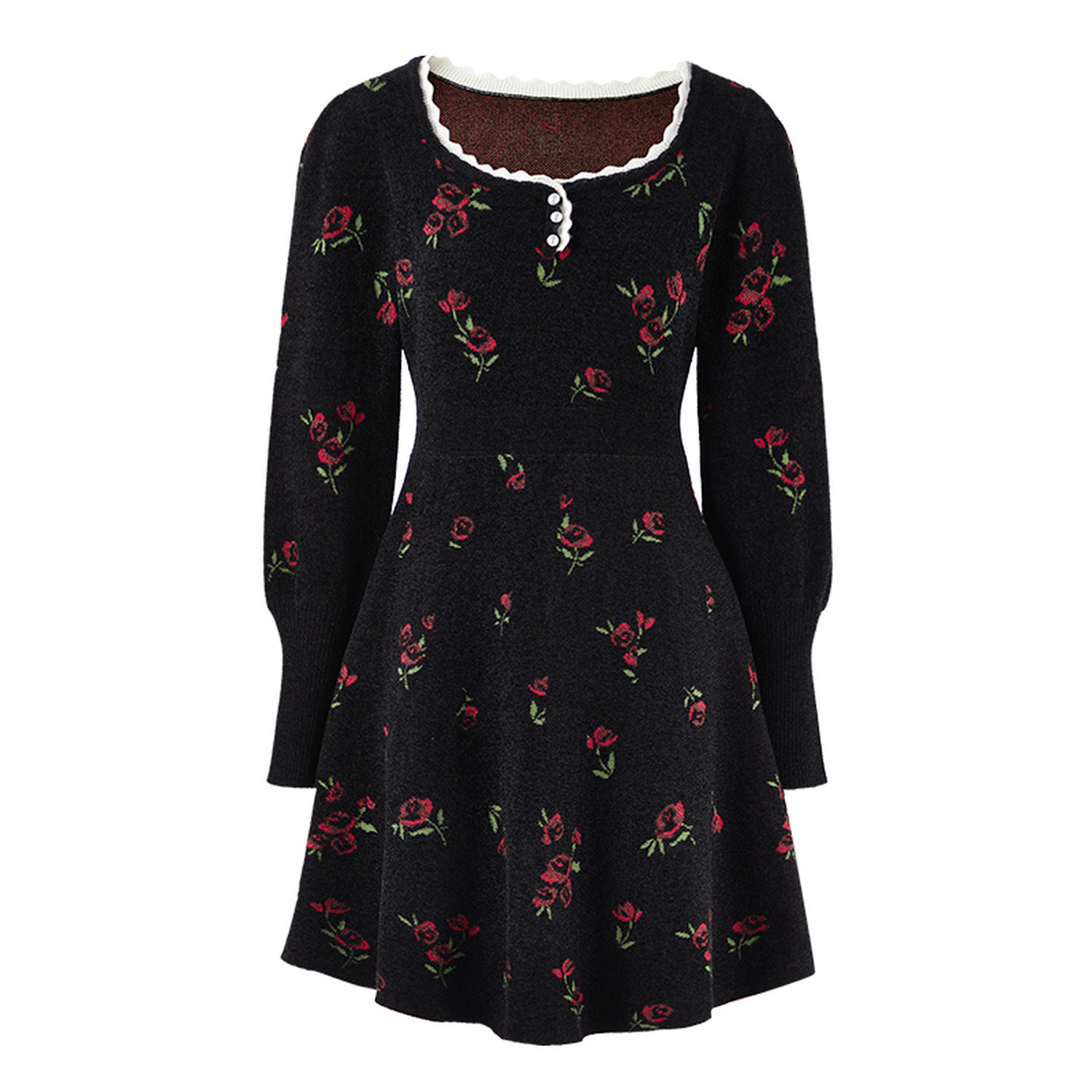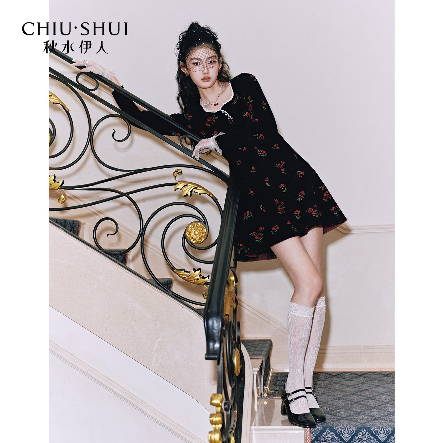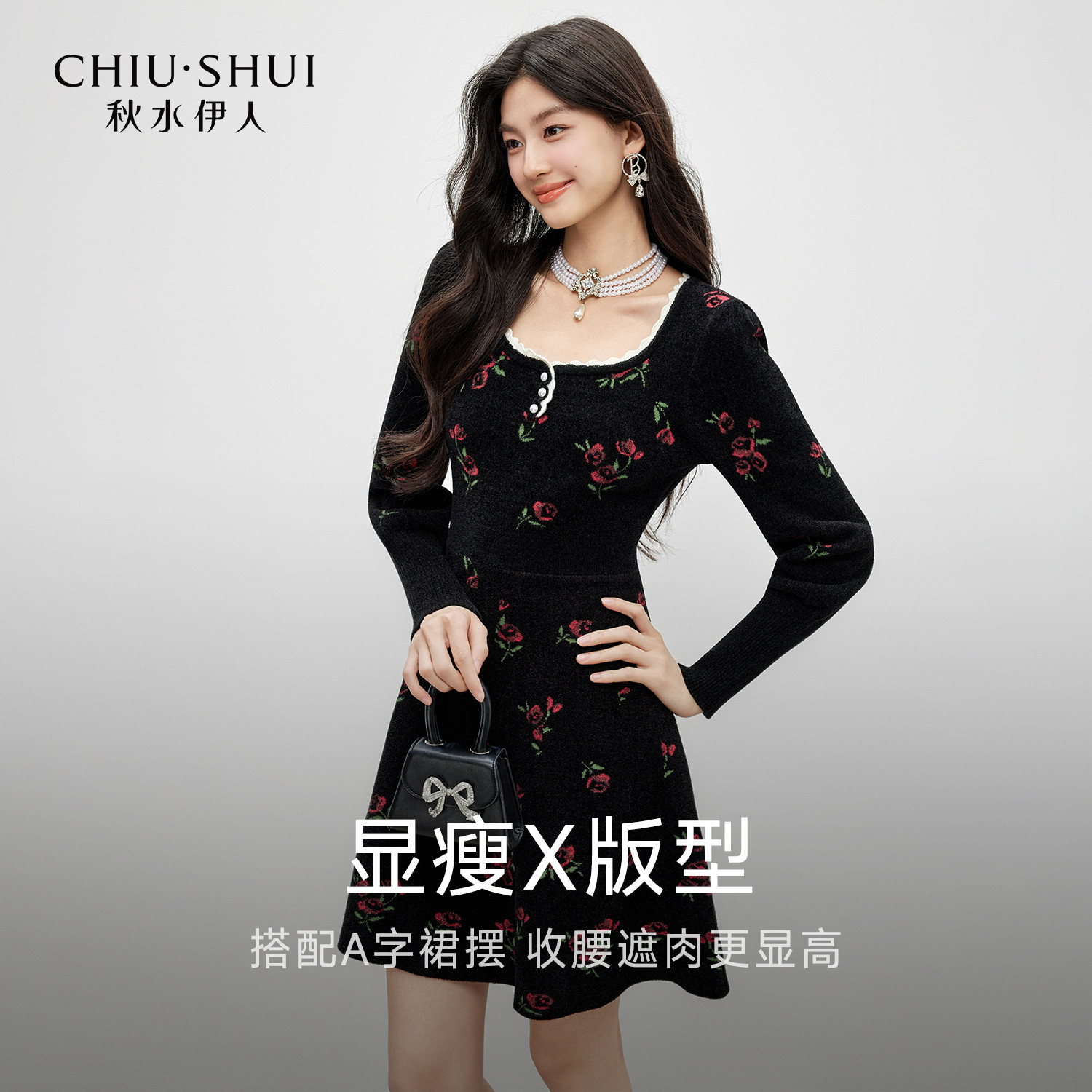 秋水伊人复古温柔风收腰裙子2026年春季 优雅蔷薇花方领连衣裙 新款