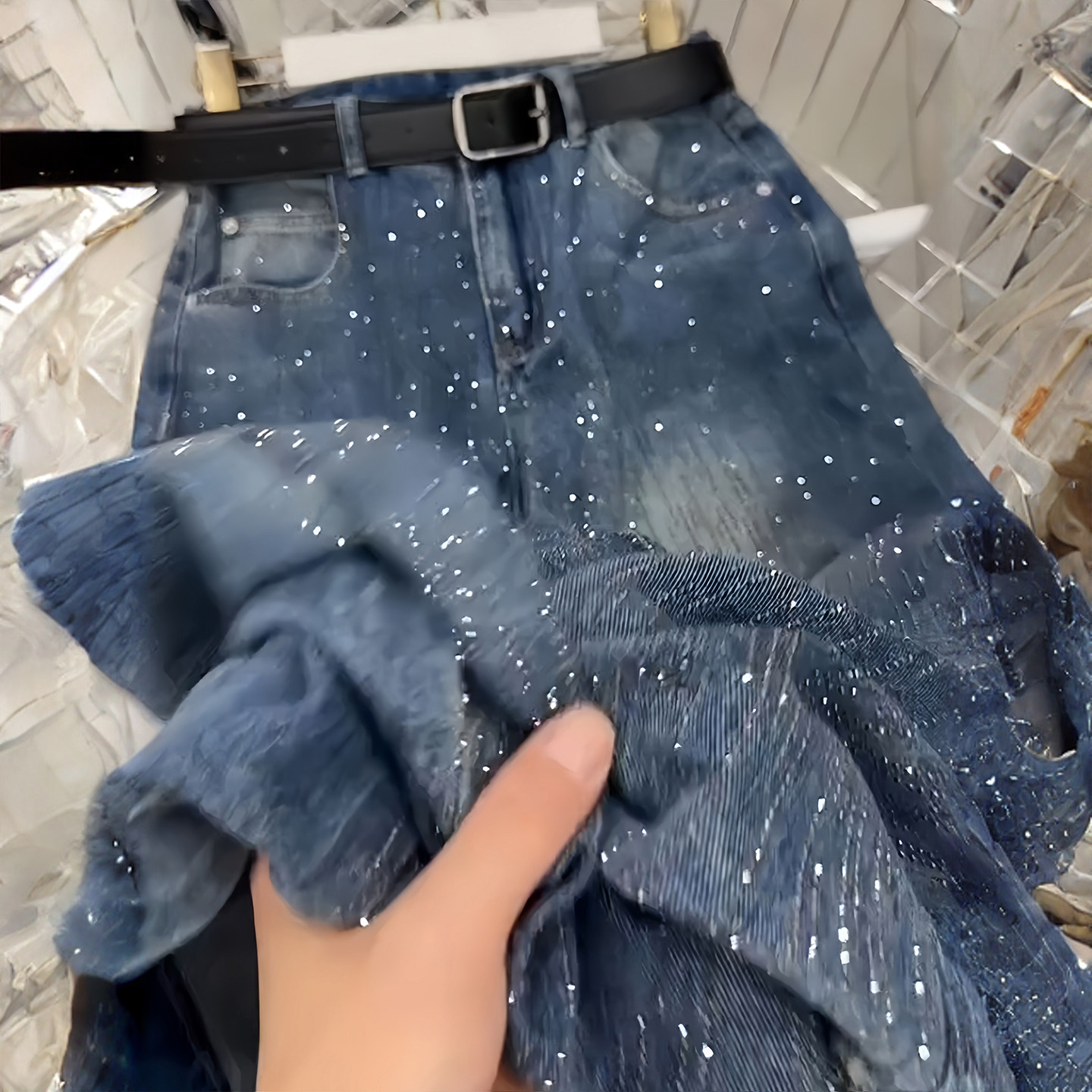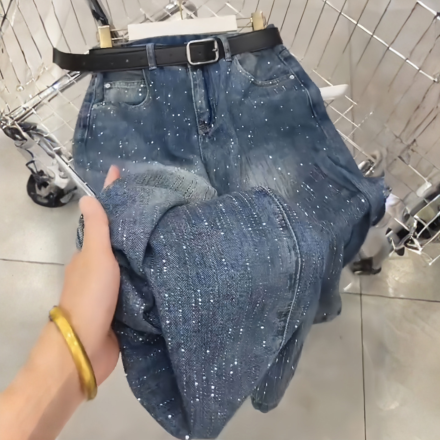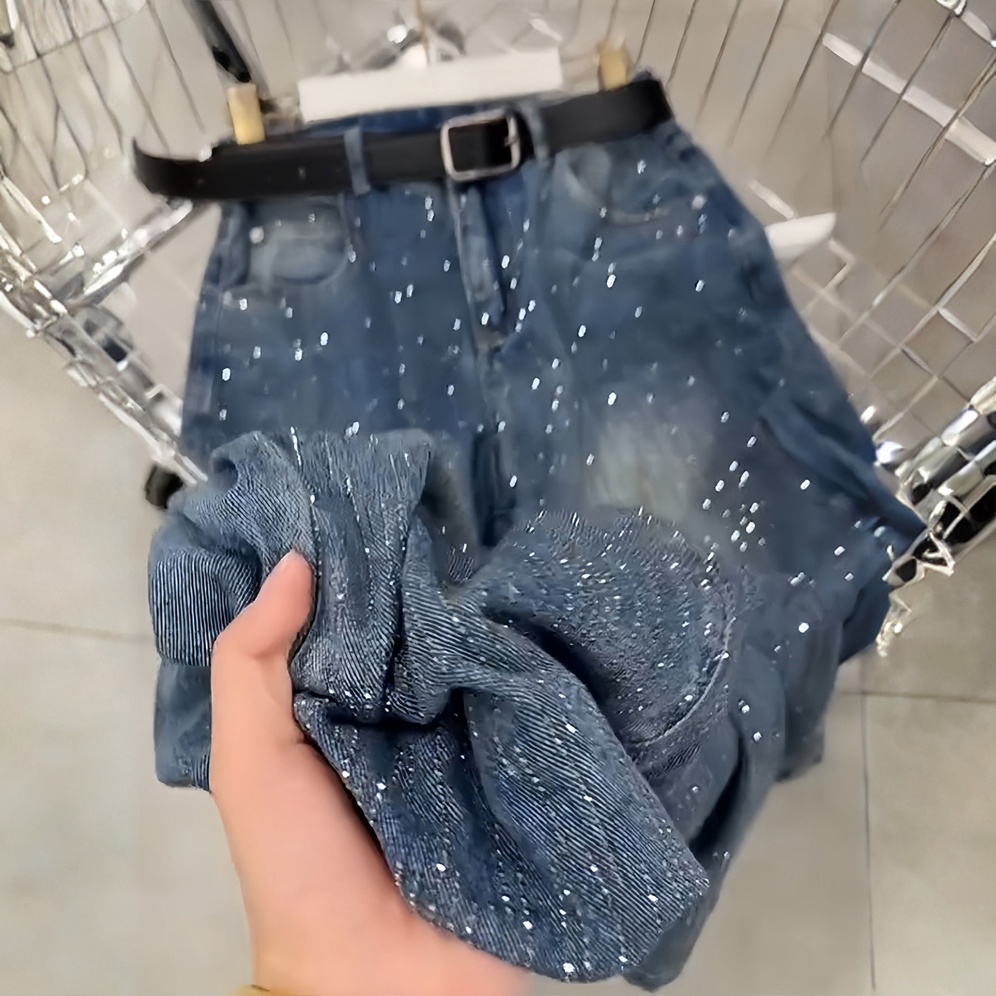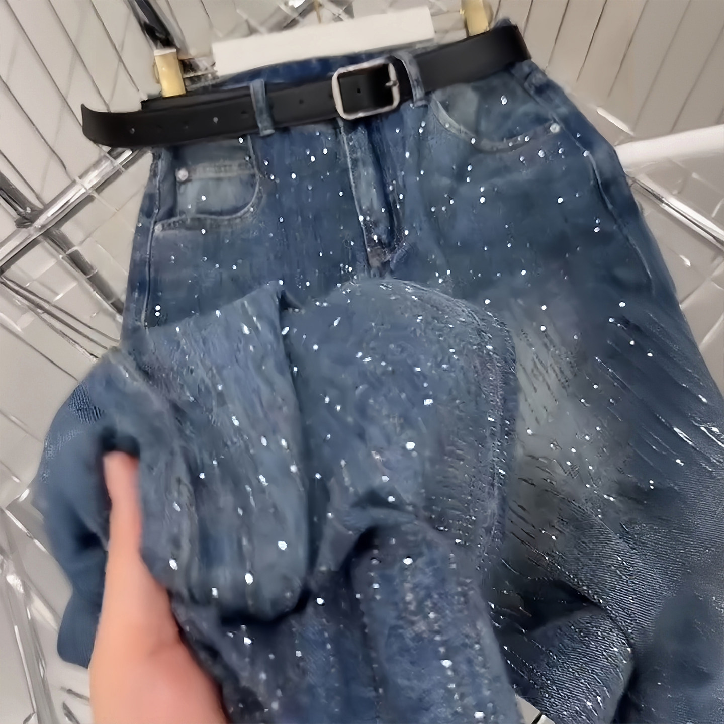 女胖mm设计感休闲直筒裤 300斤大码 复古烫钻蓝色牛仔裤 美式 子 女装