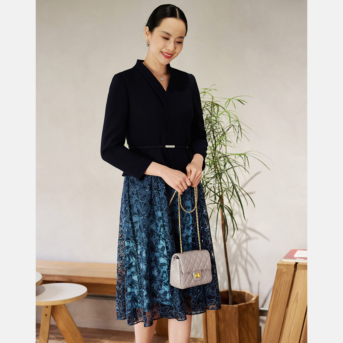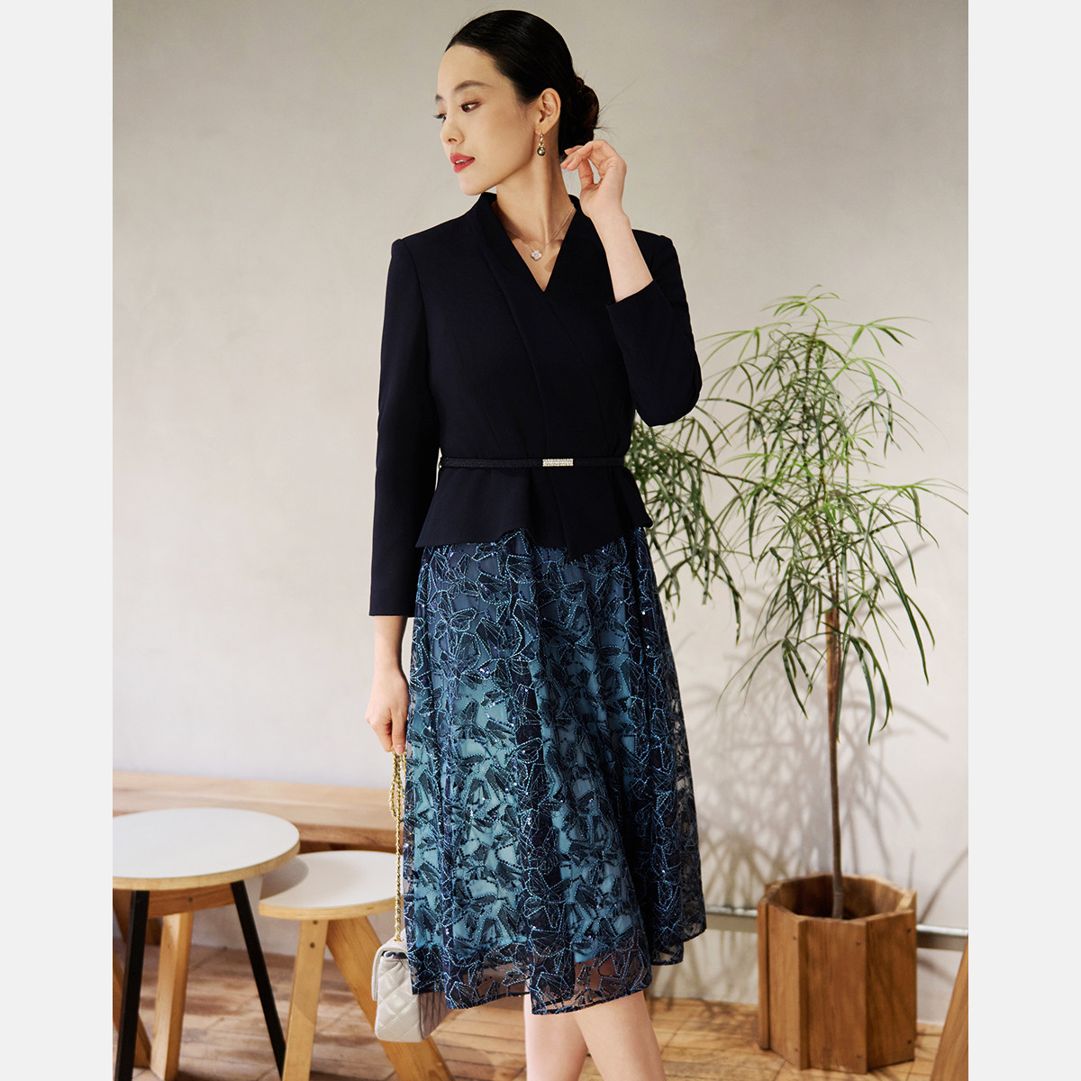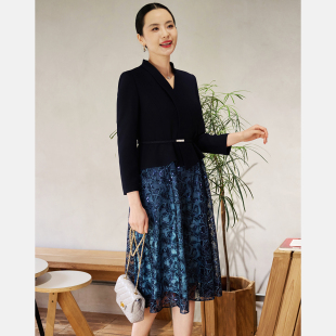 V领长袖 新款 蕾丝拼接假两件连衣裙P51197E5071N0 春季 皮尔卡丹女装