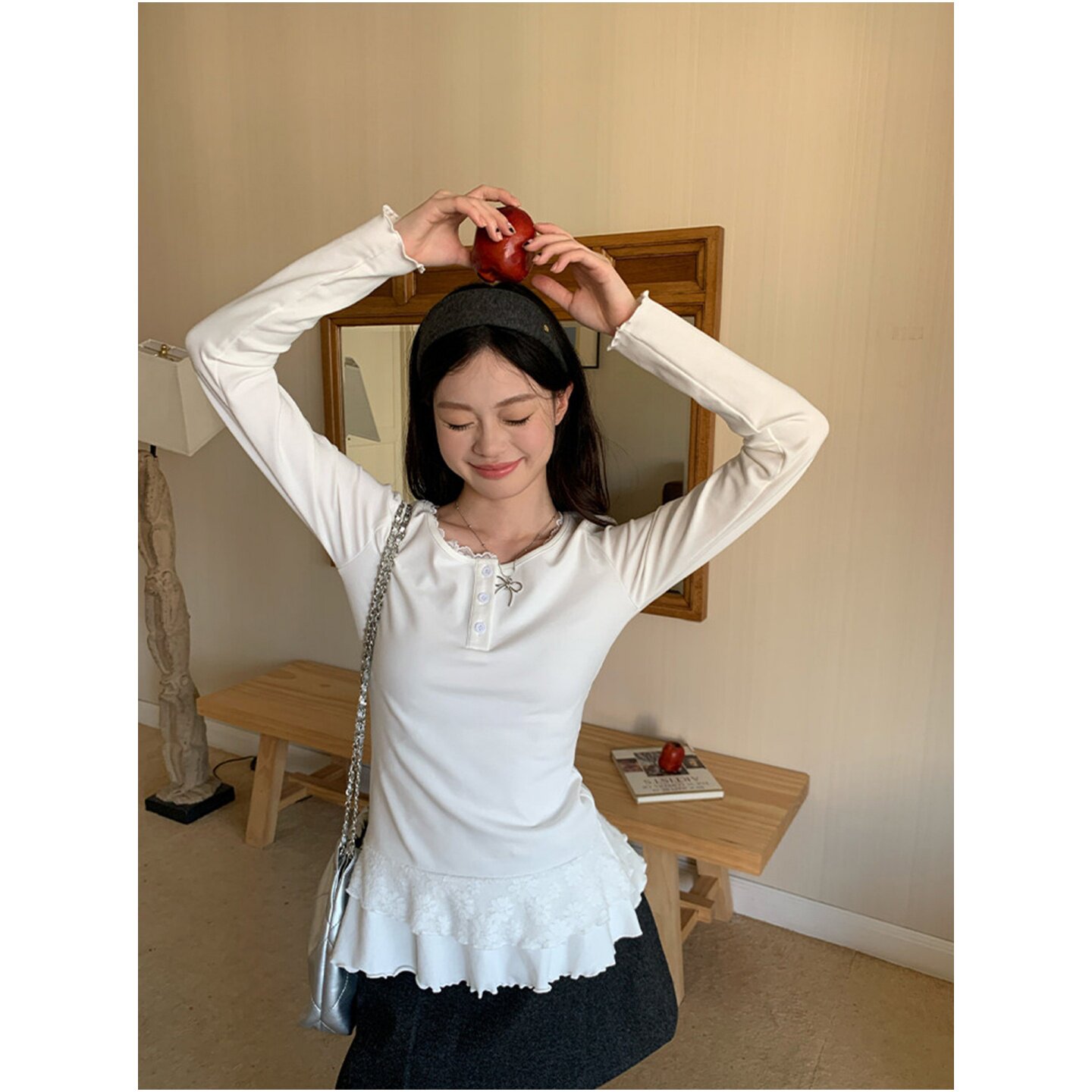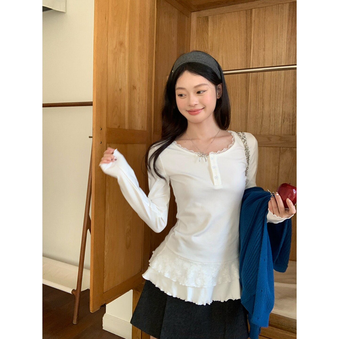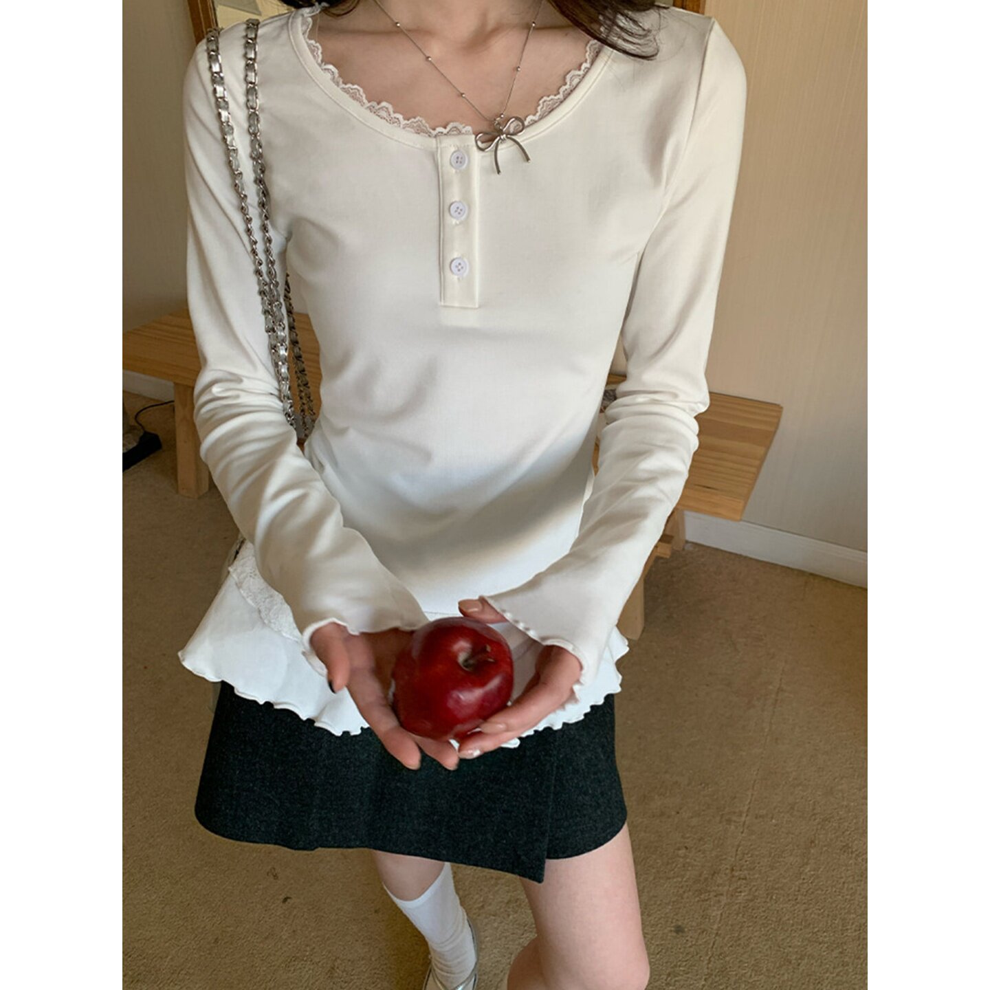 显瘦长袖 修身 t恤上衣 女早春季 纯欲米白色蕾丝花边圆领内搭打底衫