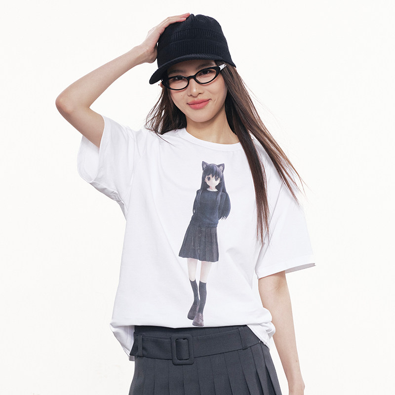 T恤女纯色宽松圆领落肩袖 猫耳少女印花短袖 上衣 BRAND二次元 RPB