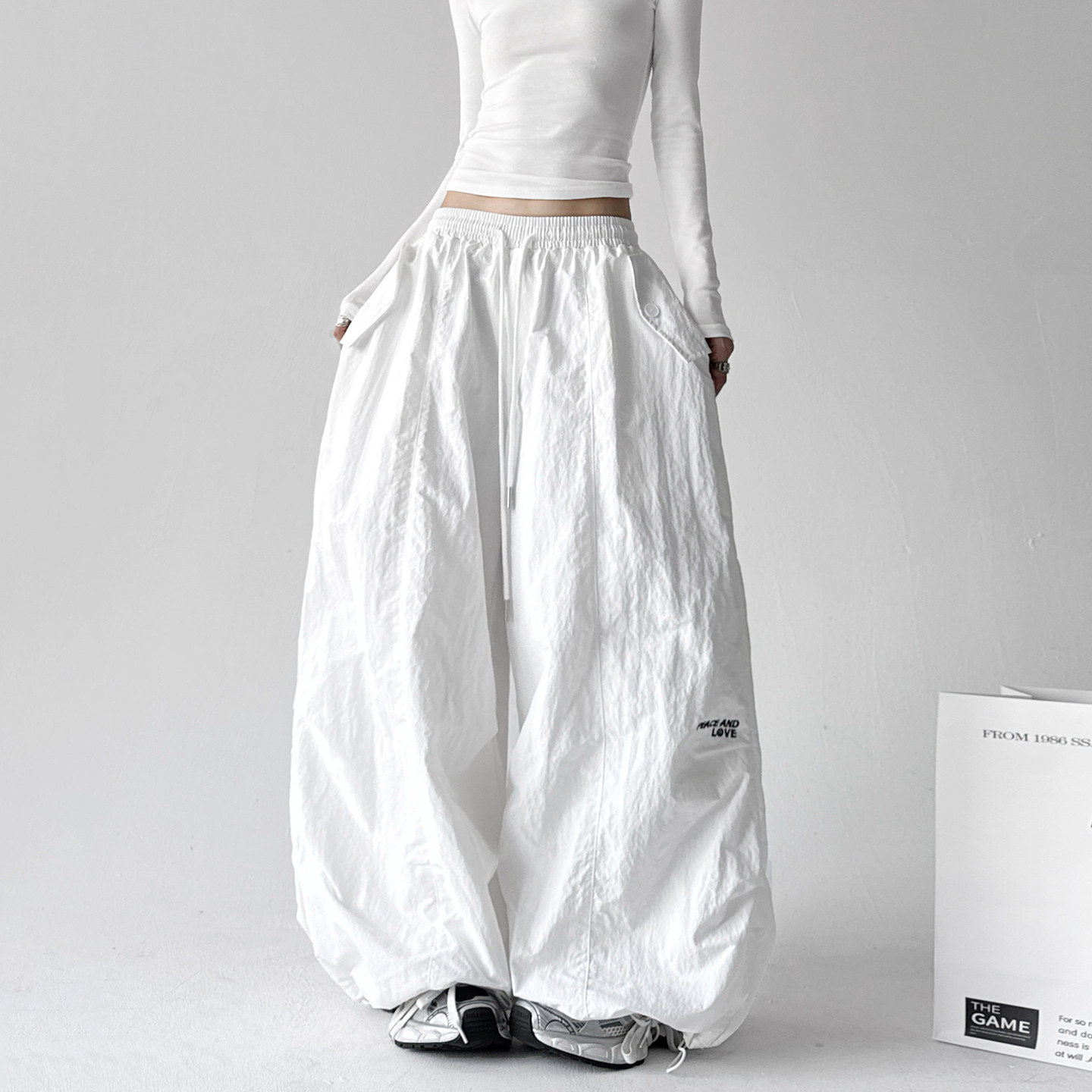 抽绳宽松皱褶口袋休闲裤 美式 女春季 裤 子 复古廓形松紧腰降落伞工装