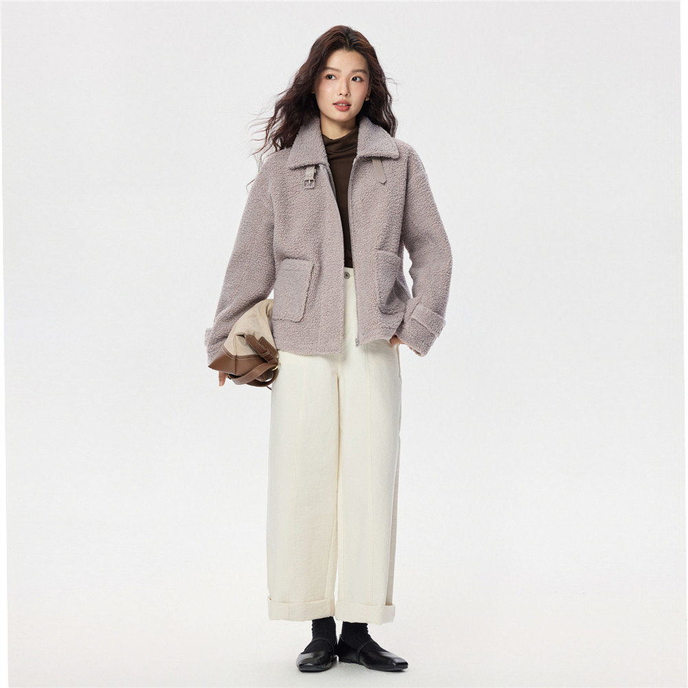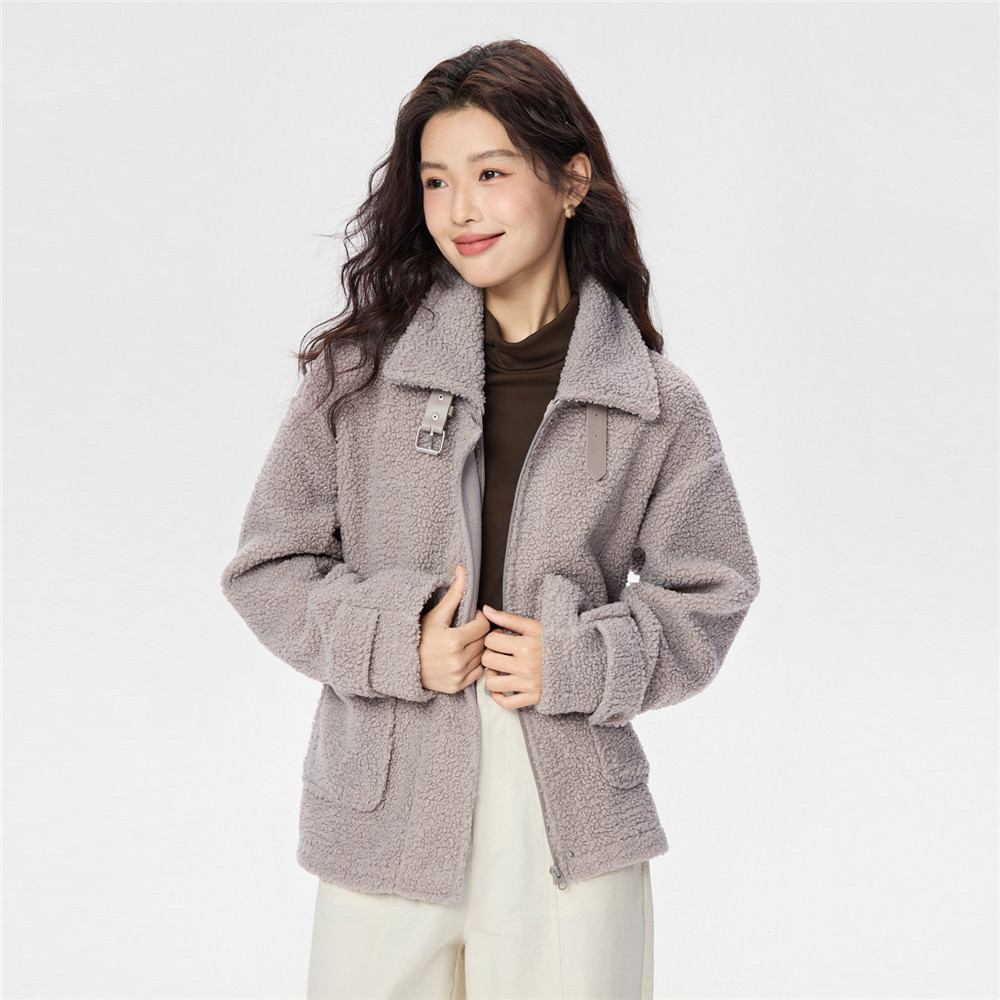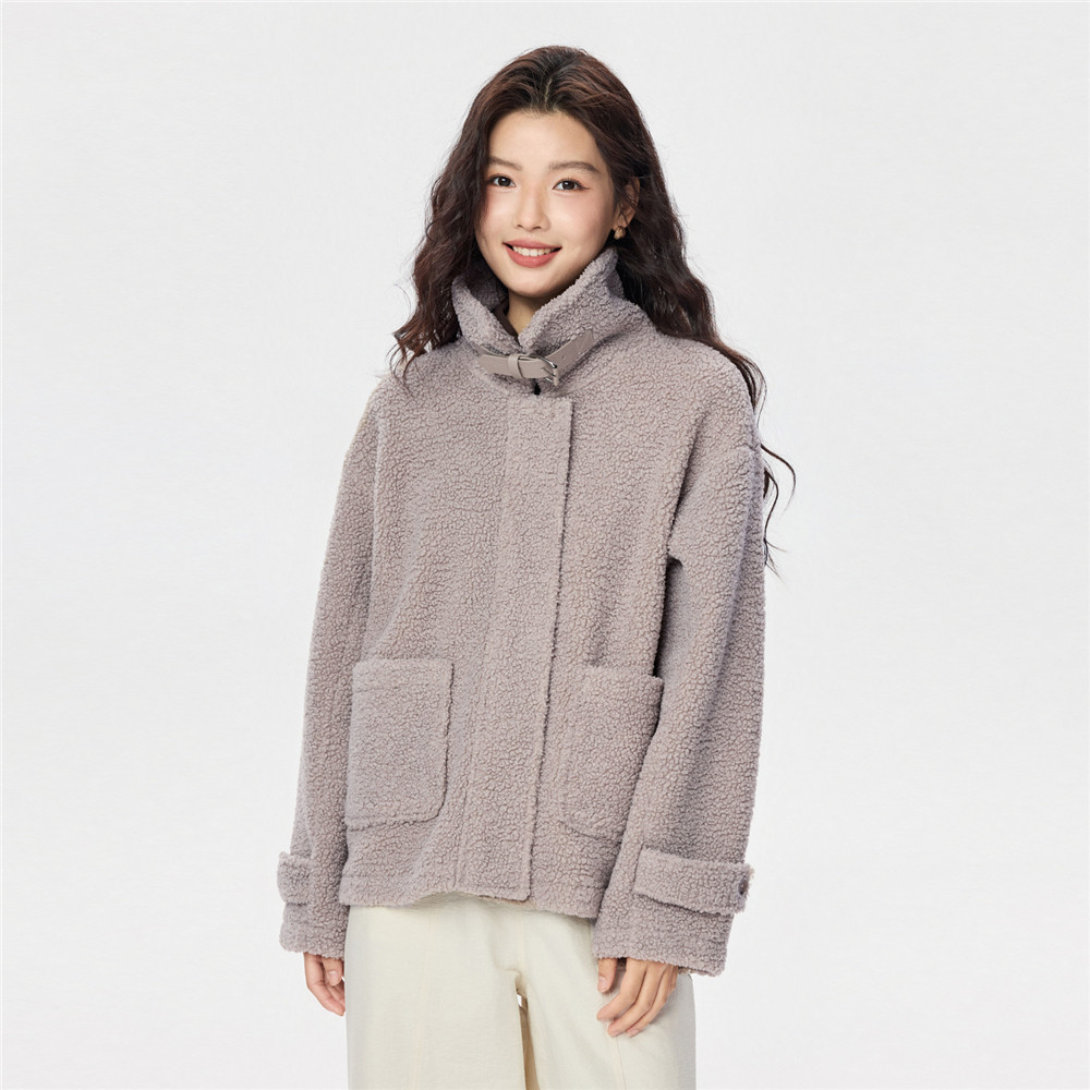 佐丹奴绒感夹克女新款 仿羊羔绒领口扣袢宽松翻领休闲外套13375782