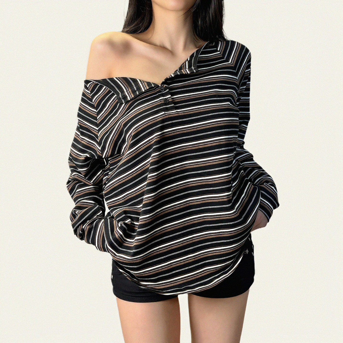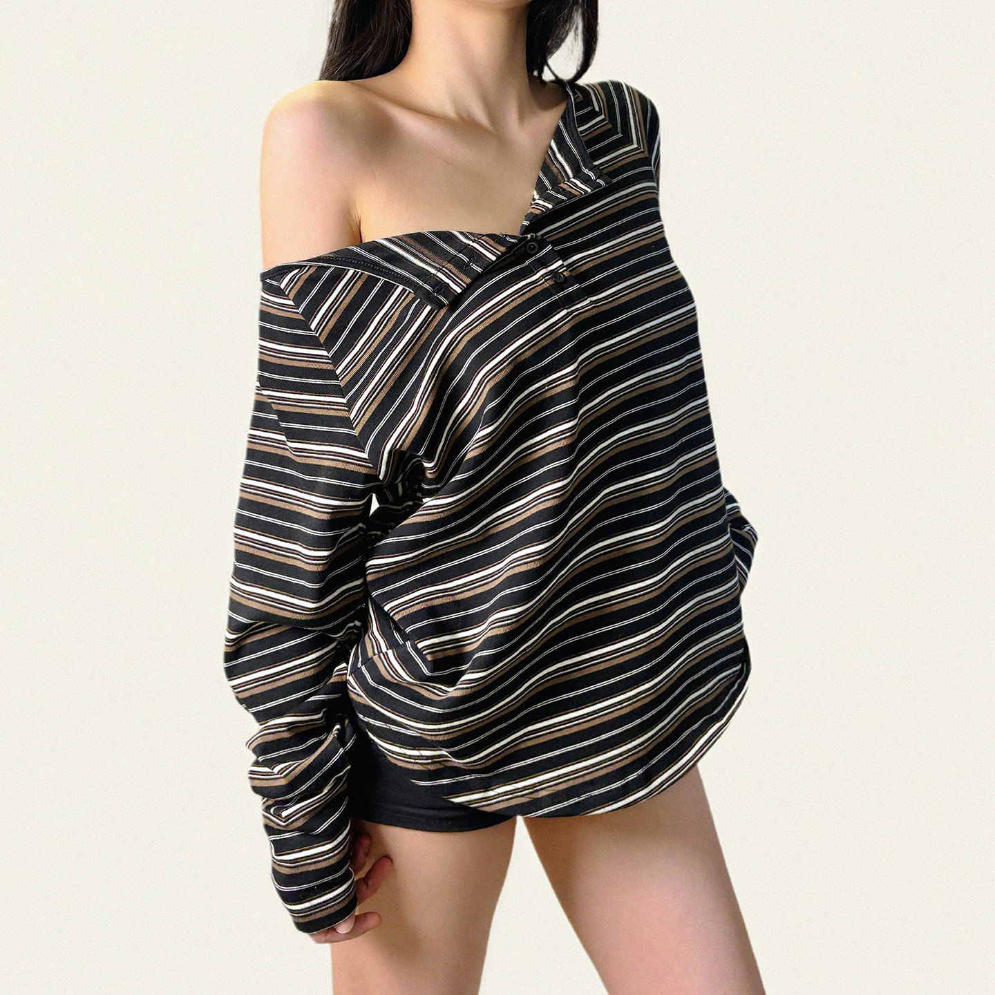 T恤秋简约百搭宽松居家上衣 复古棕色条纹排扣斜肩长袖 FUNOFF 美式