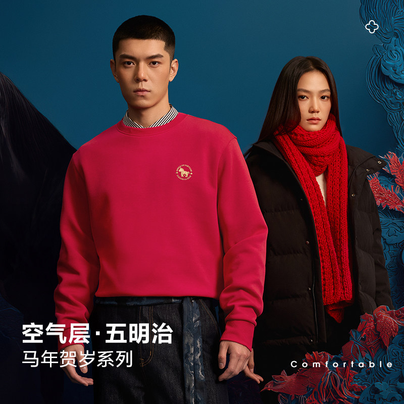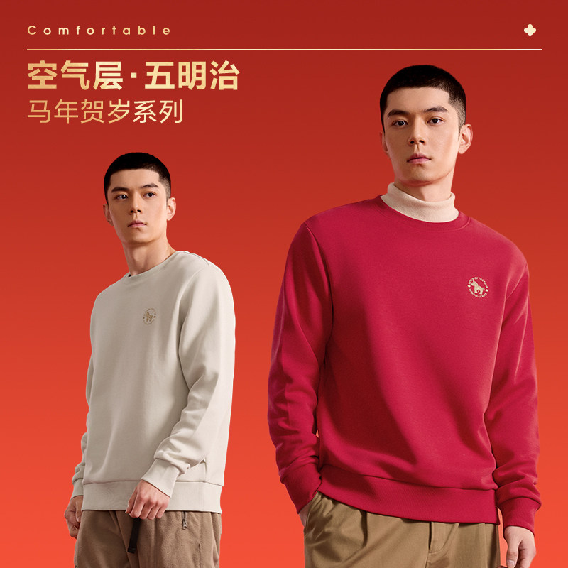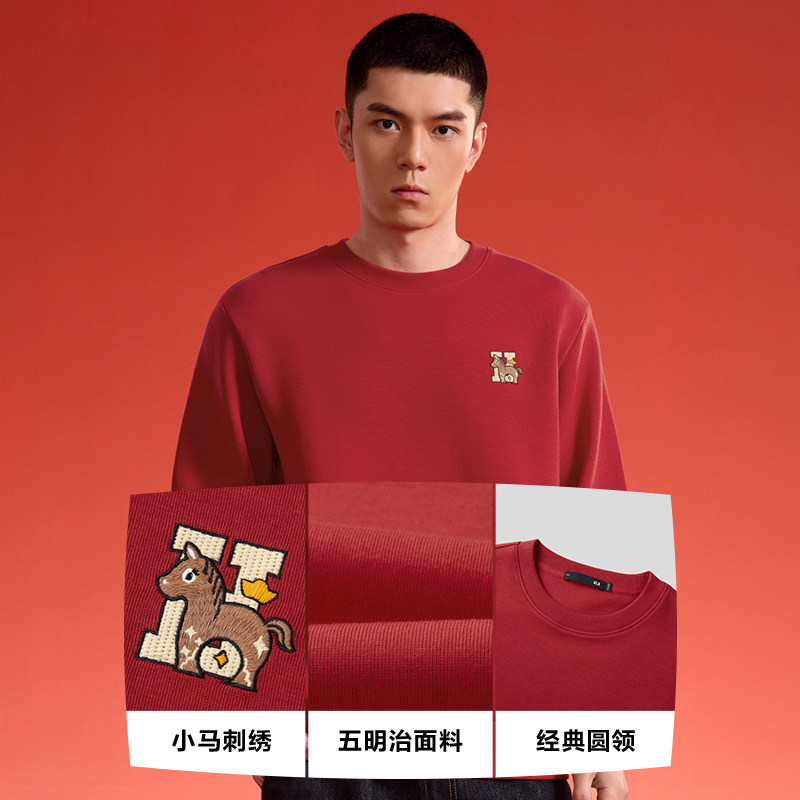 HLA 海澜之家马年贺岁26春夏新圆领刺绣微弹五明治红色上衣卫衣男