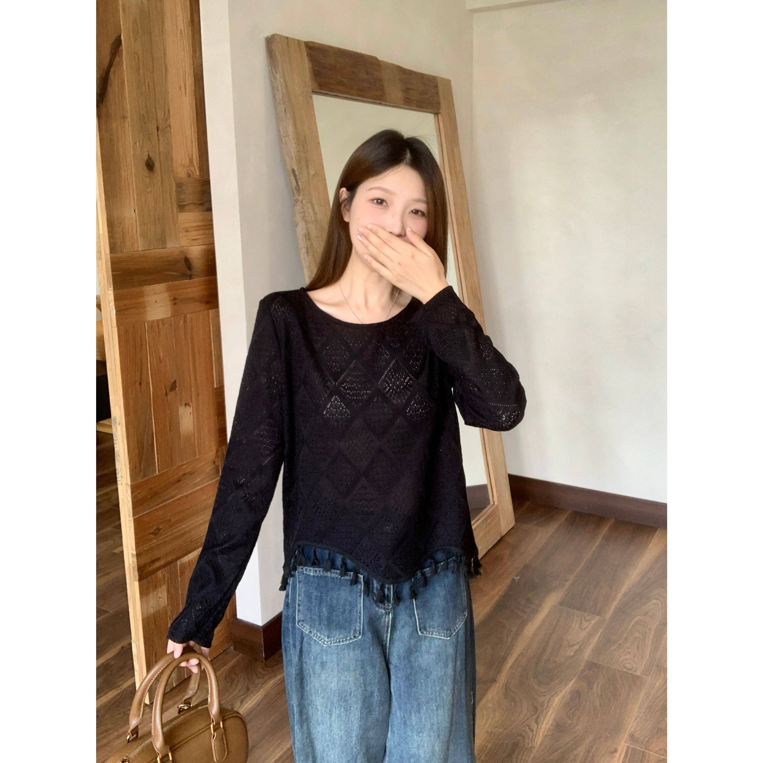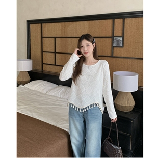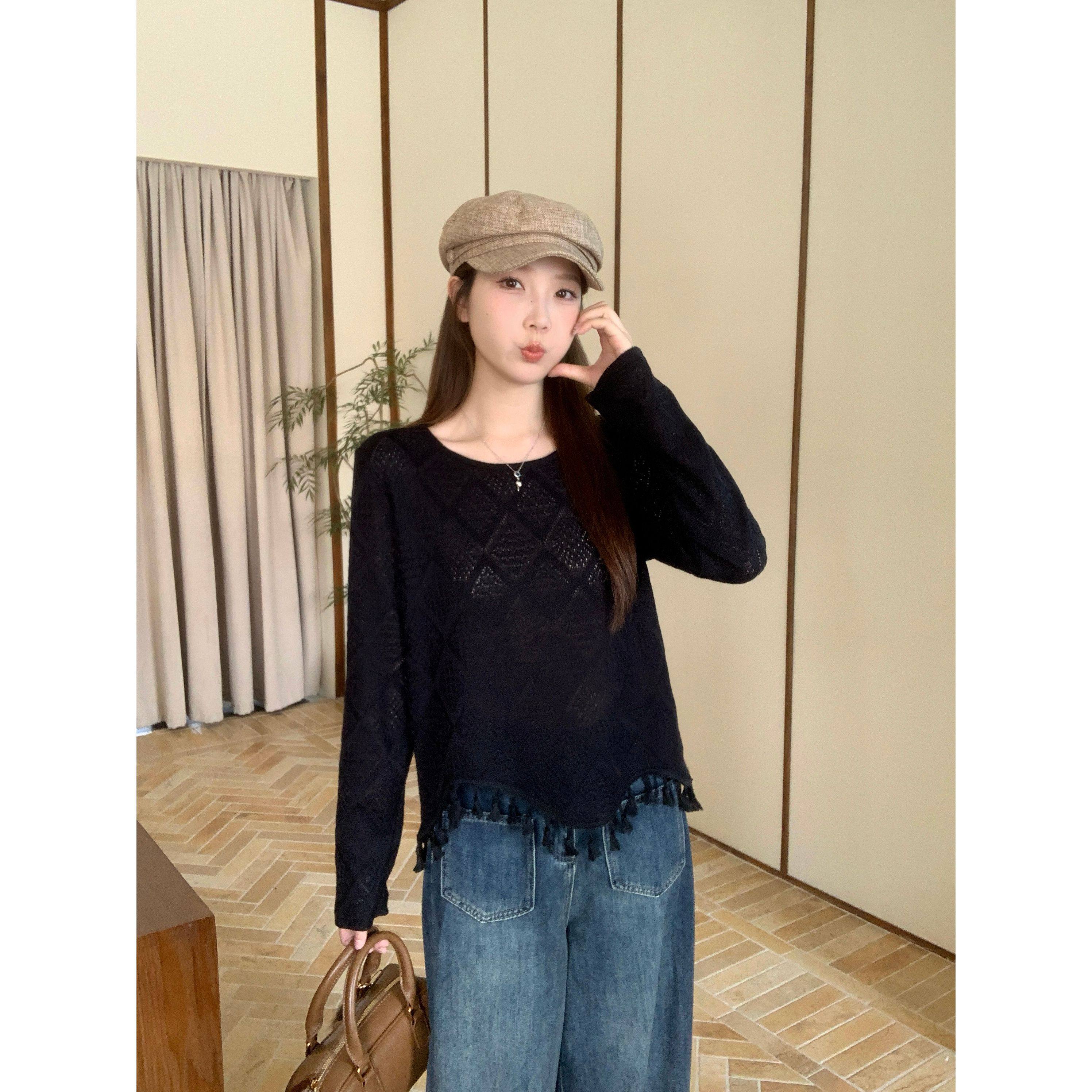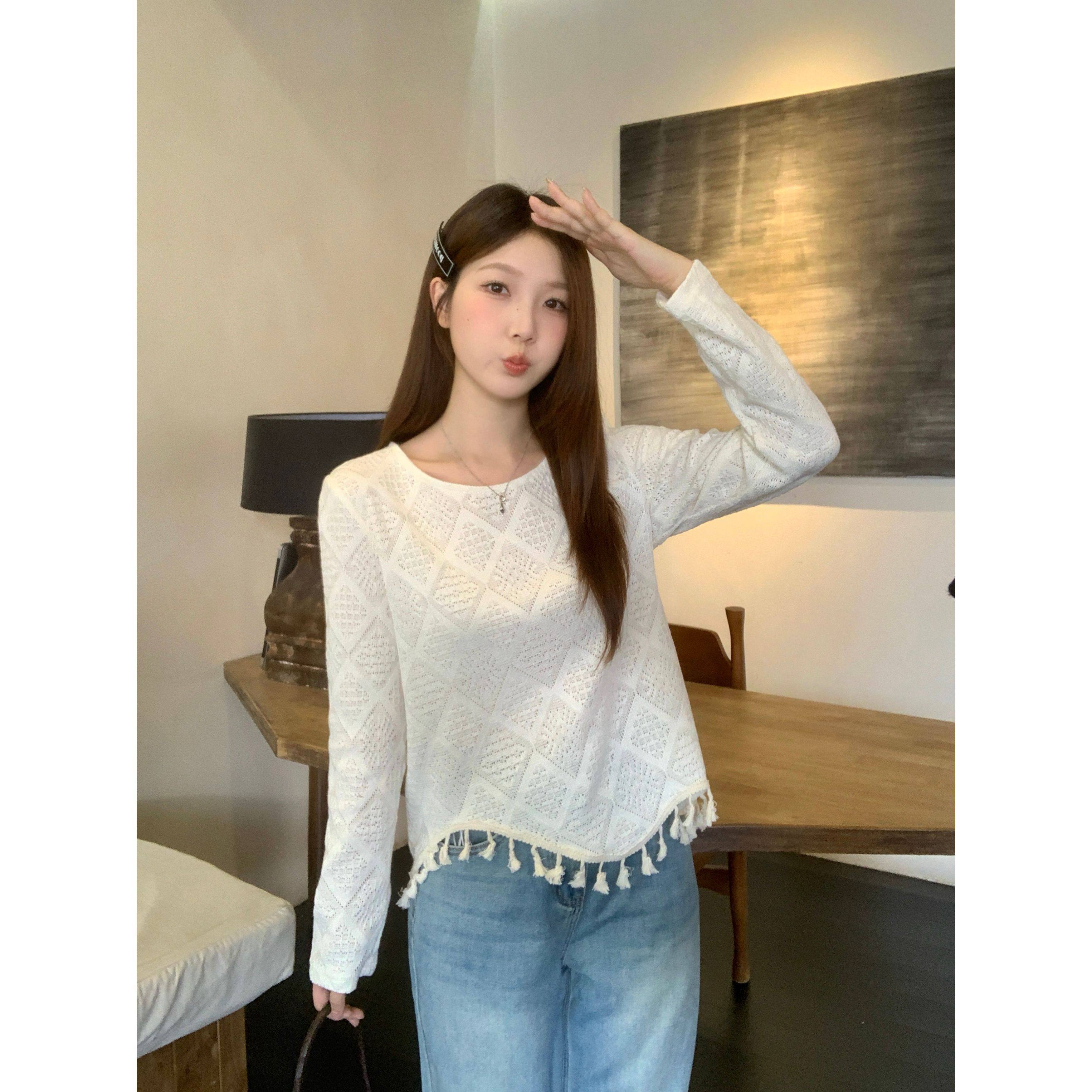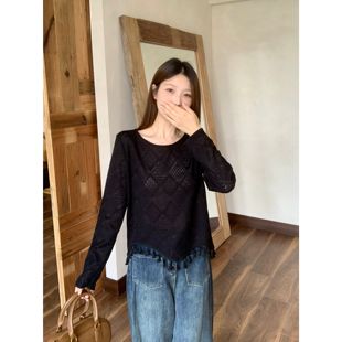 针织衫 设计感流苏上衣别致小衫 女春秋款 胖mm短款 大码 菱格镂空长袖
