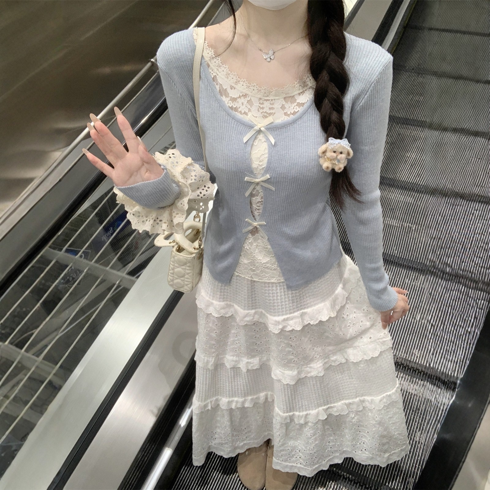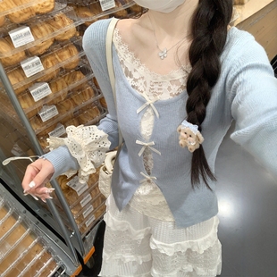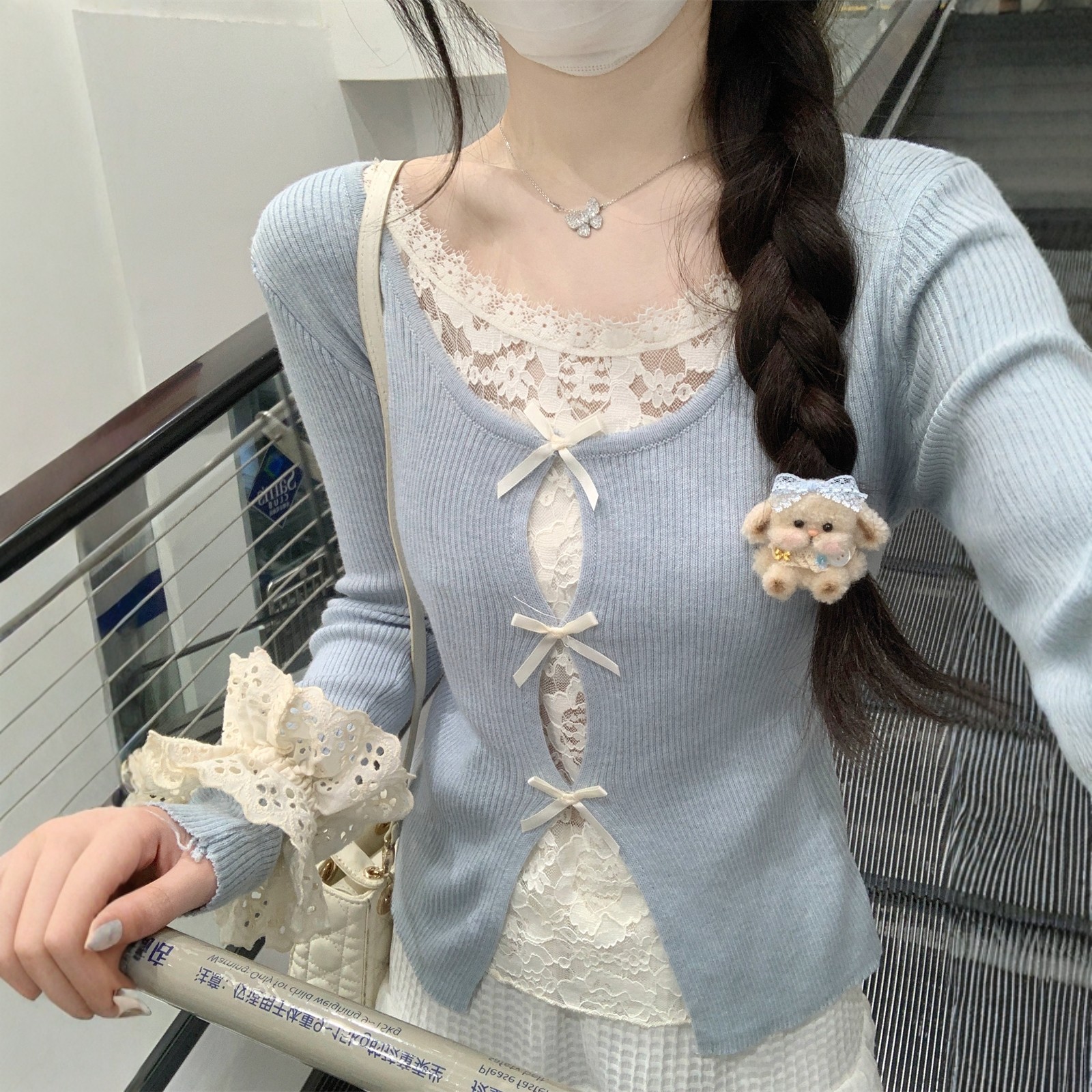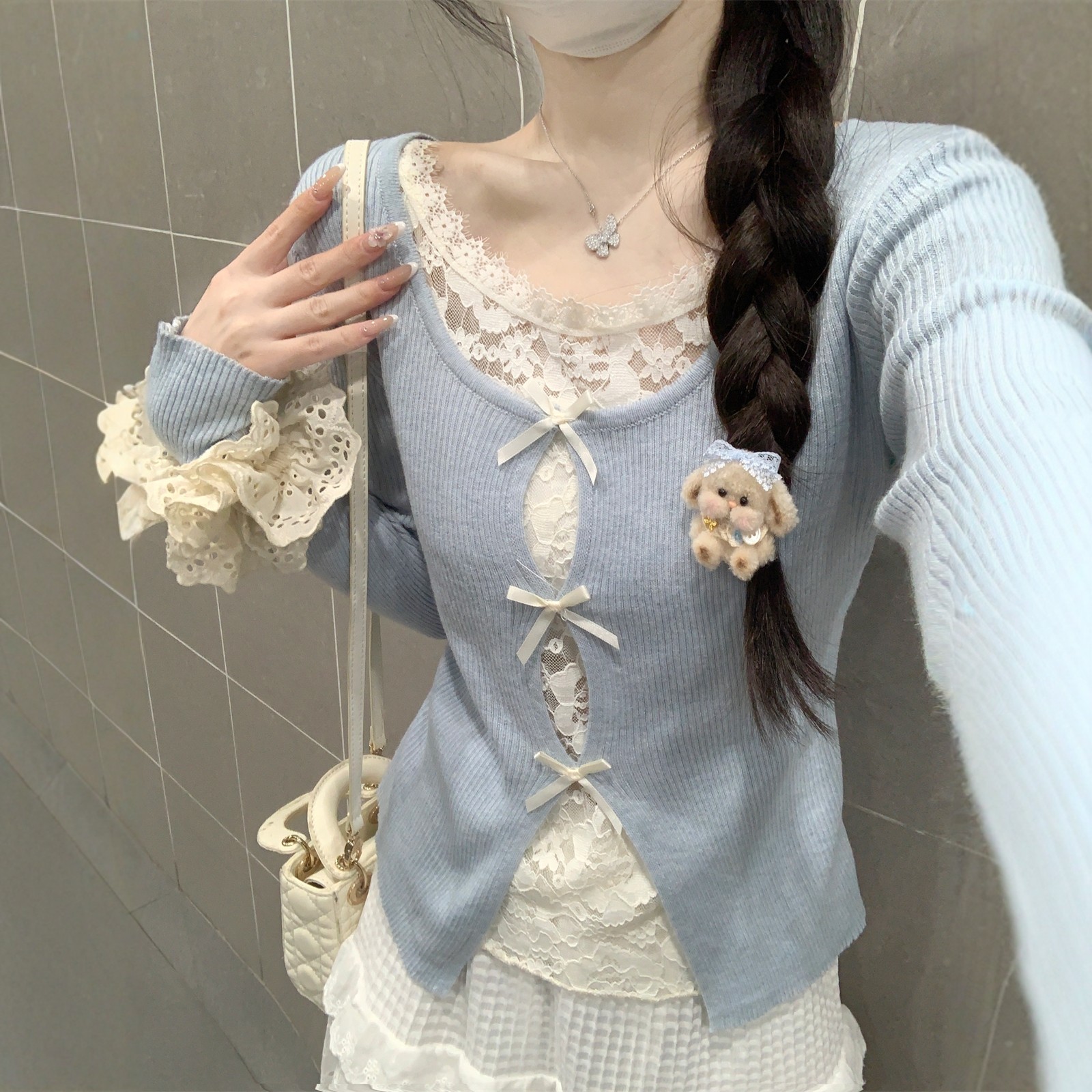 温柔甜美风蝴蝶结假两件蕾丝拼接针织衫 开叉打底内搭上衣秋 女修身