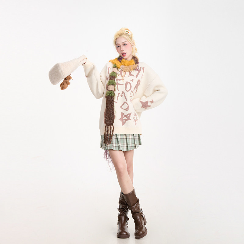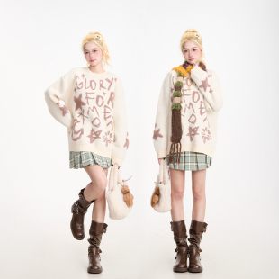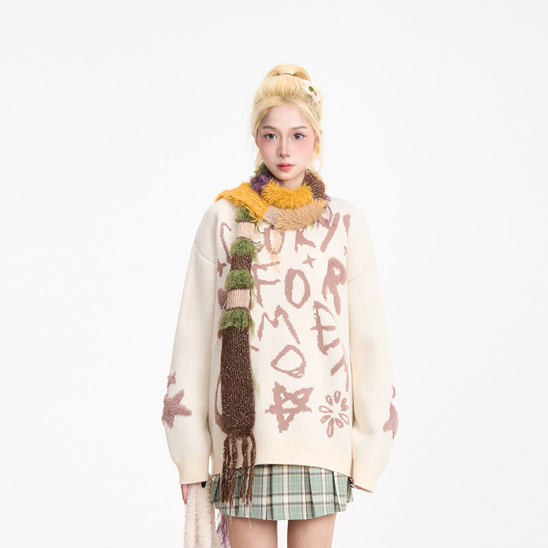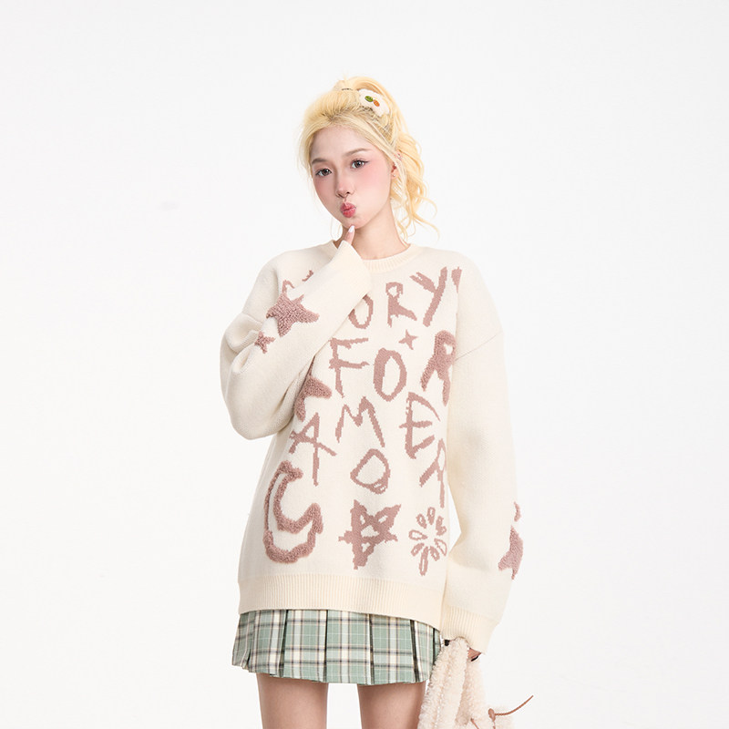 NERESUM美式 字母提花套头毛衣女秋冬复古慵懒百搭通勤针织上衣