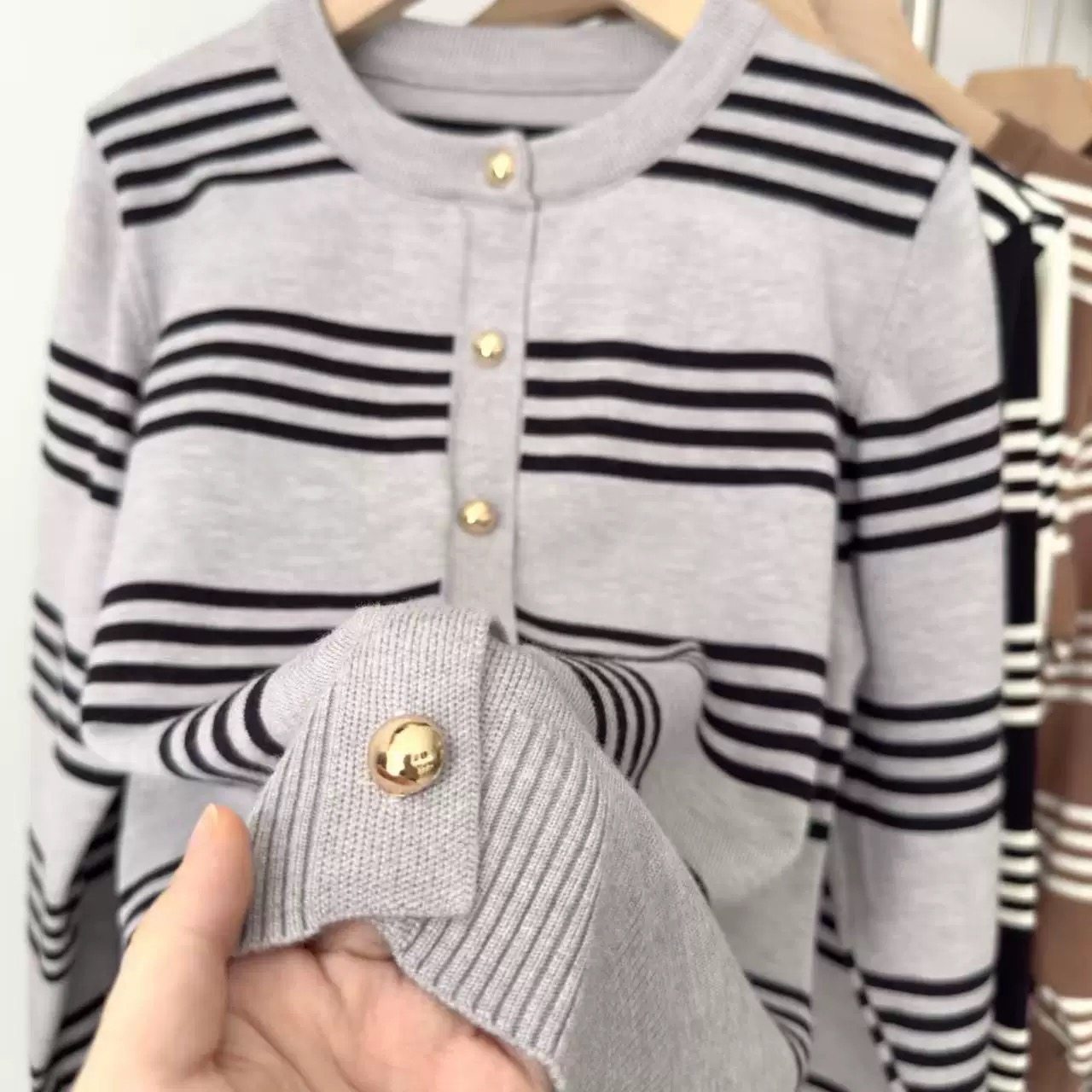 小四粉丝专享 开衫 D394条纹针织衫 圆领长袖 毛衣外套 女秋冬新款