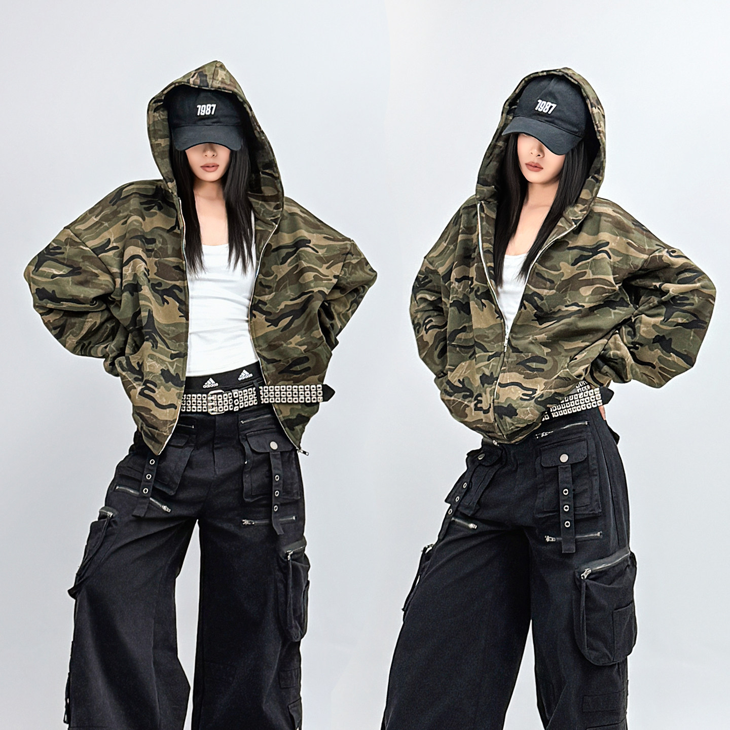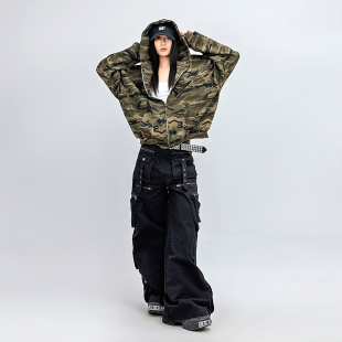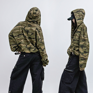 慵懒开衫 SUN90 短外套女情侣款 复古宽松迷彩帽衫 拉链连帽卫衣 美式