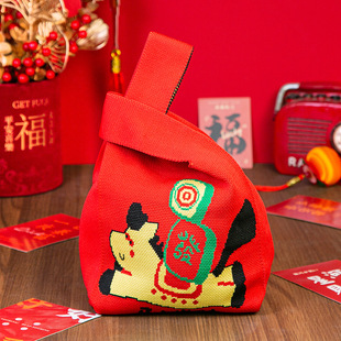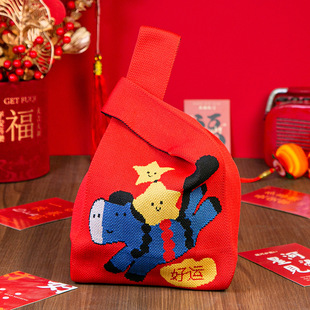 新年红色手提针织包年货糖果礼品收纳袋卡通小马包装 手拎包
