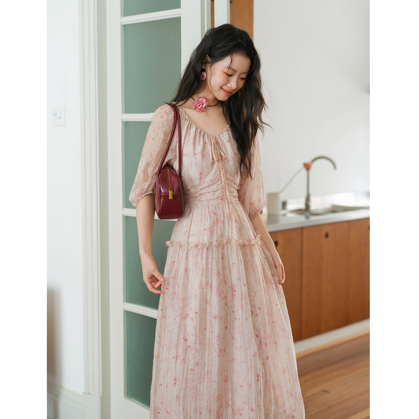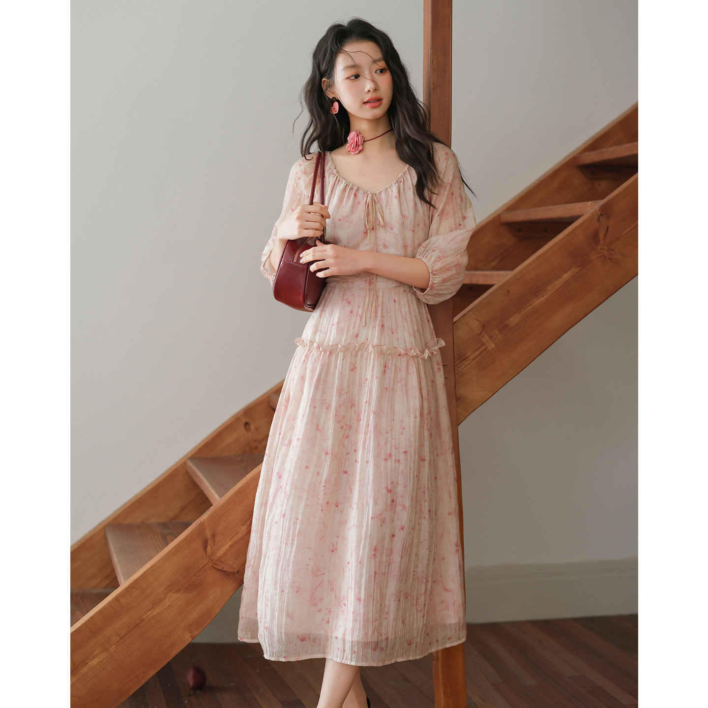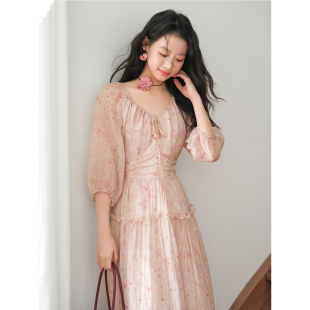 抽绳一字肩泡泡袖 谜秀 韩版 女2025早秋新款 收腰长裙MXE41L2479 柔雾粉洋装