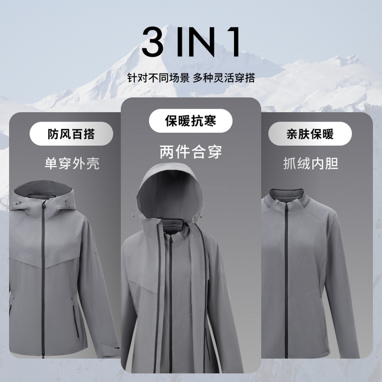 迪桑特女士防风防泼水透湿抓绒内胆三合一夹克上衣保暖两件套