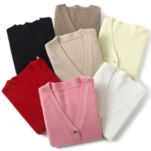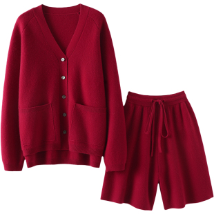 圈 套装 加厚V领羊绒开衫 休闲五分裤 女纯羊绒针织外套短裤 时尚