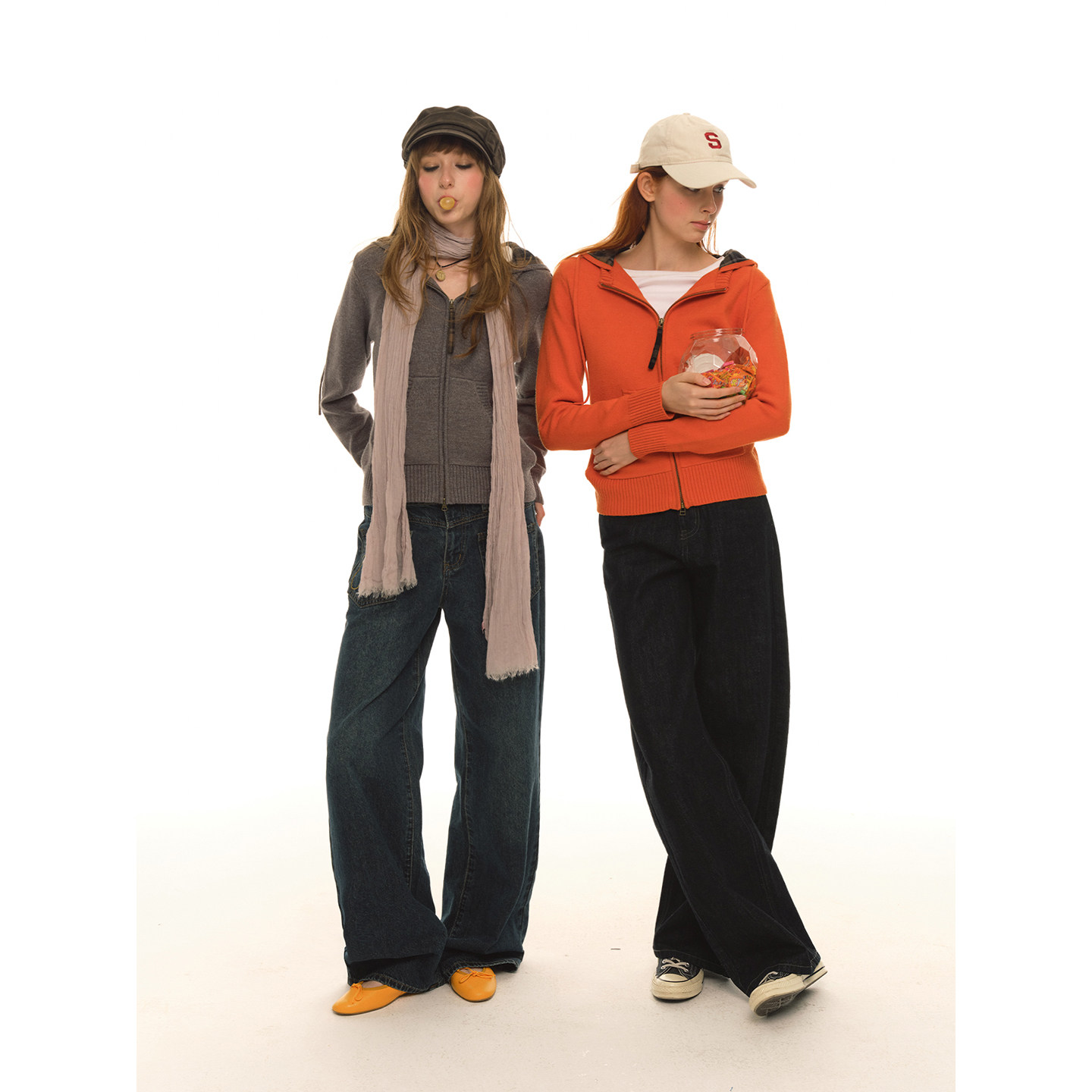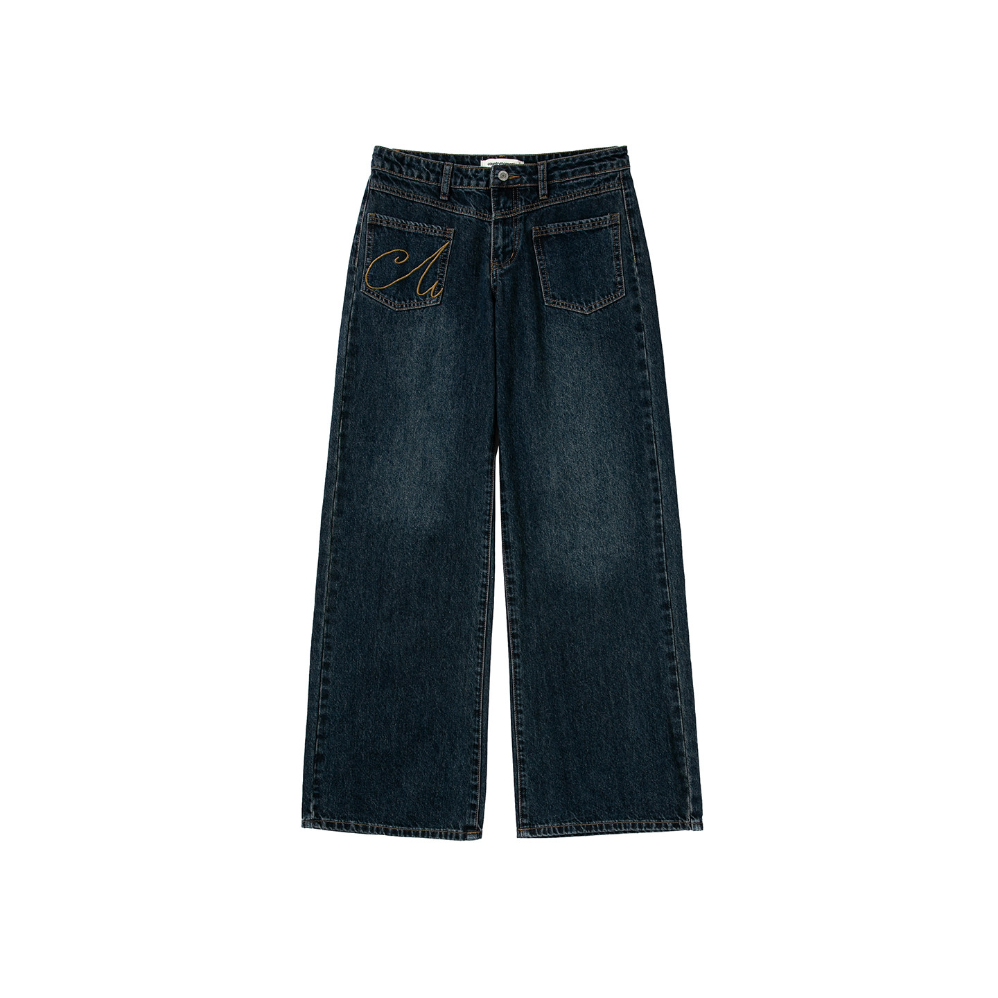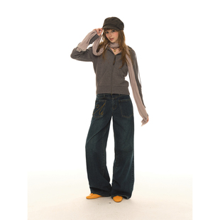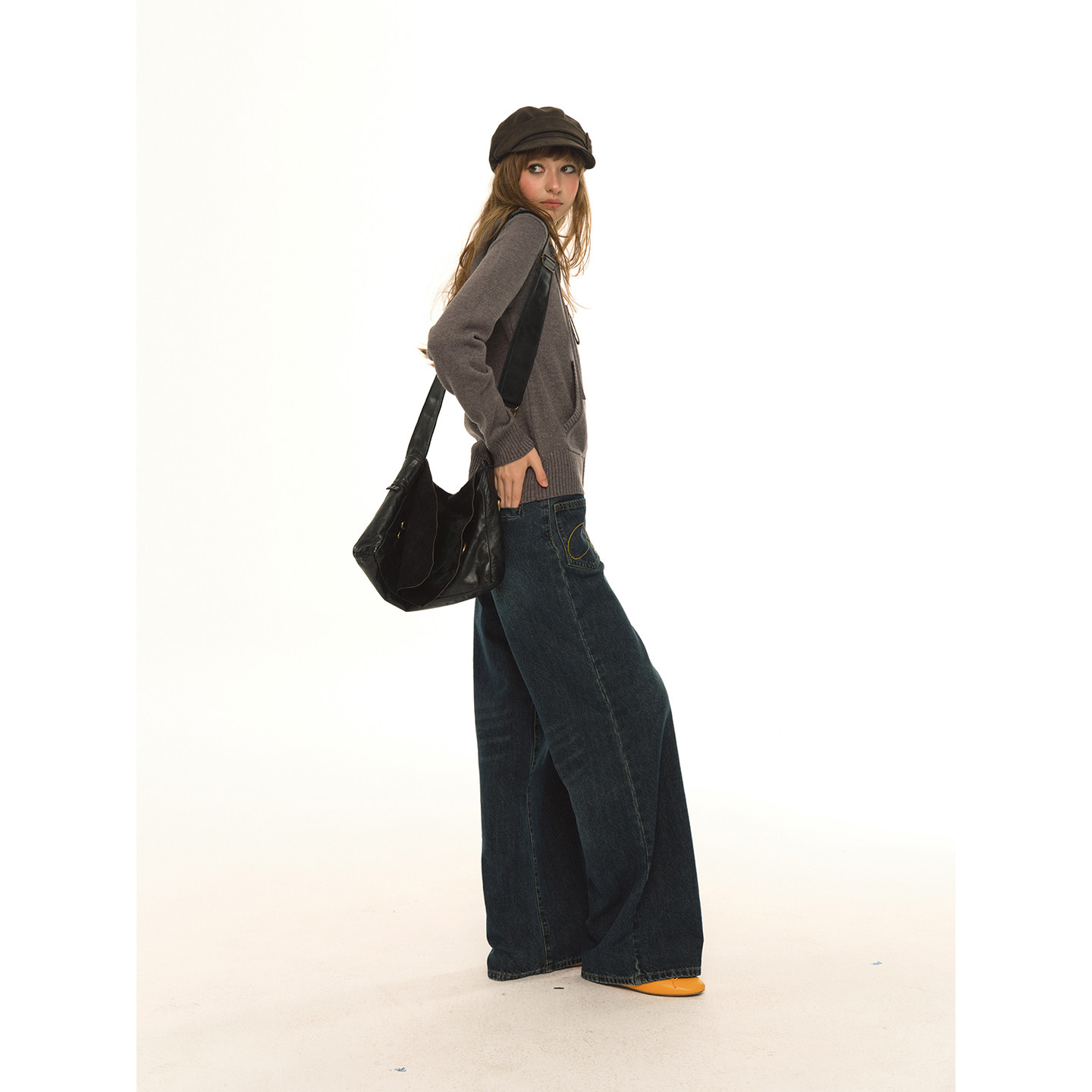 深蓝色高腰宽松阔腿长裤 女秋冬新款 原色设计感直筒牛仔裤 UNRETRO
