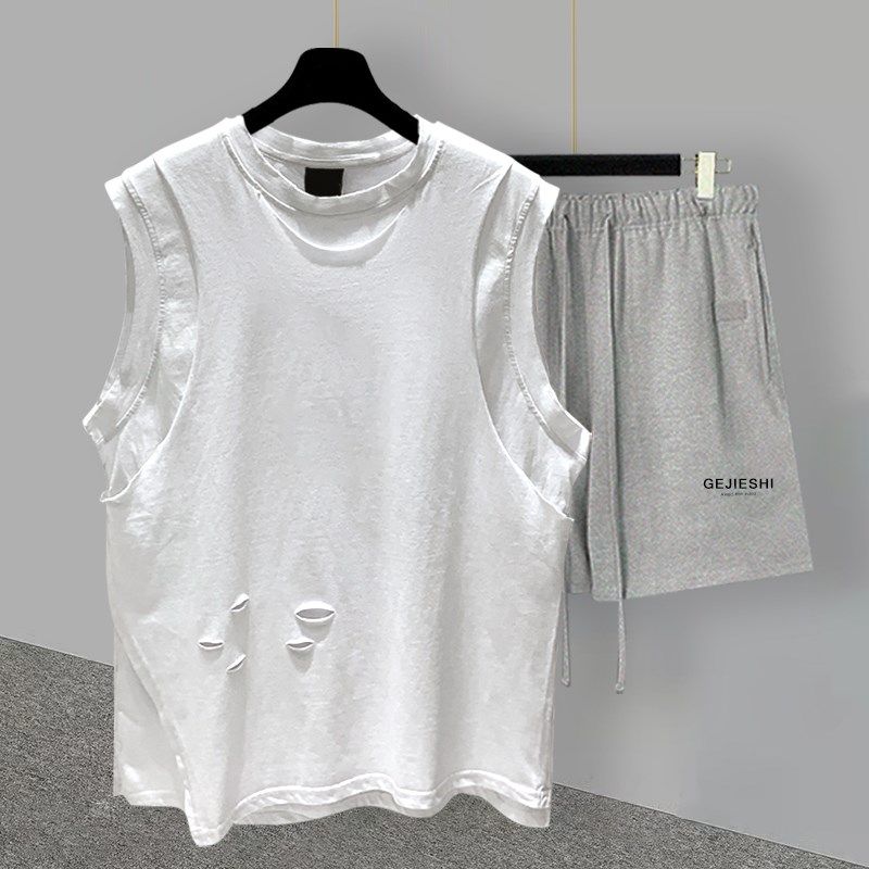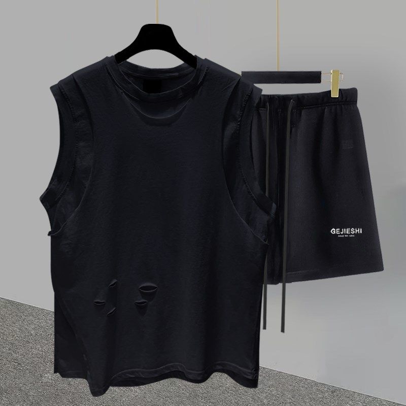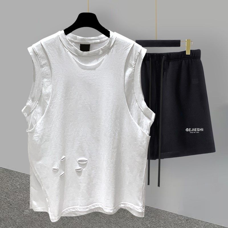 t恤套装 五分裤 男夏季 潮流百搭帅气学生宽松直筒裤 韩版 假两件无袖