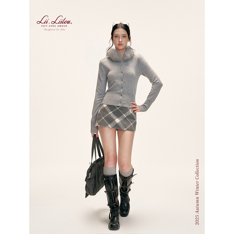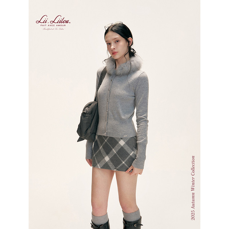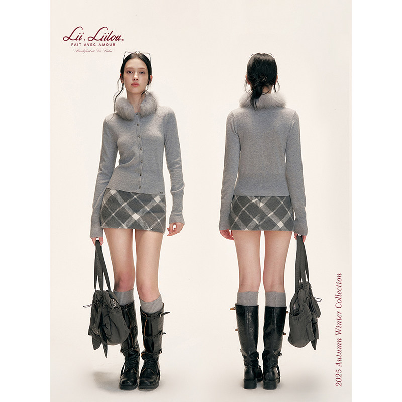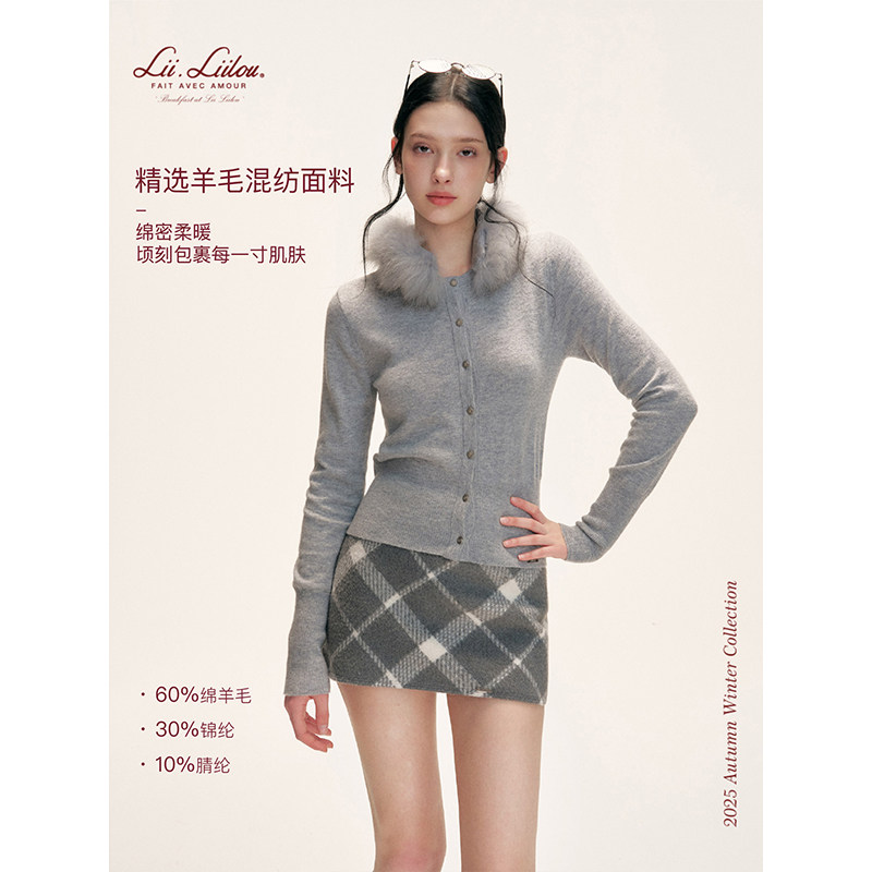 针织打底衫 卢昱晓同款 羊毛混纺正肩修身 可拆卸100狐狸毛 Liilou