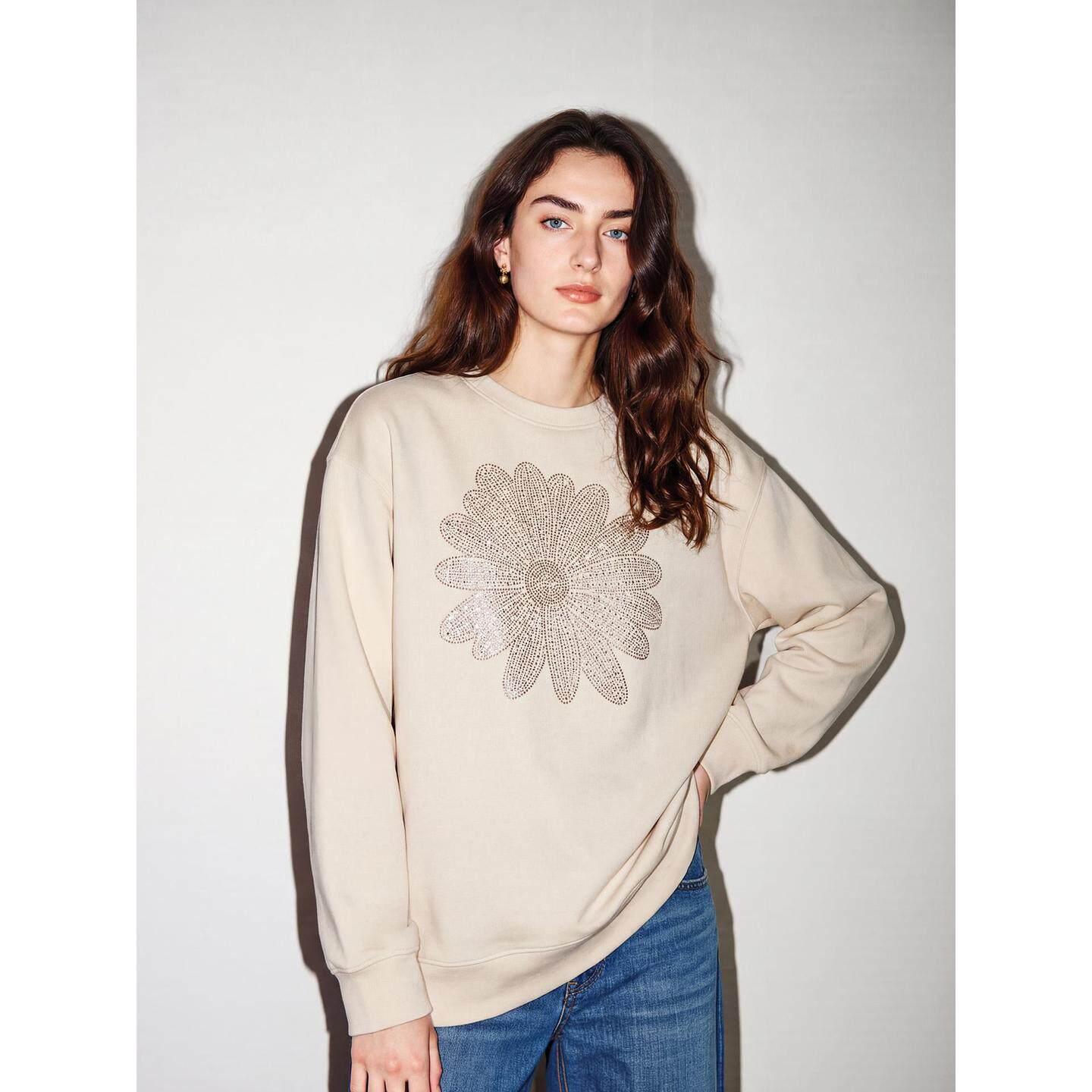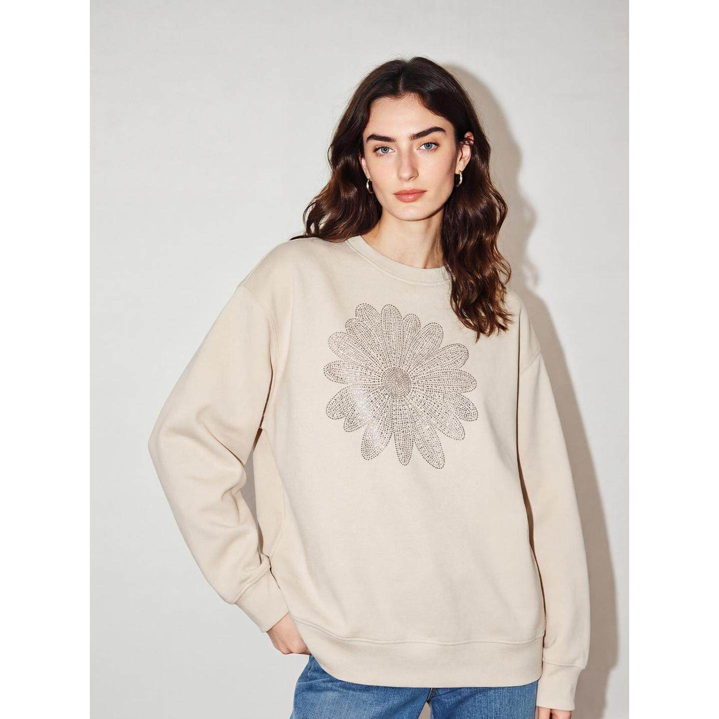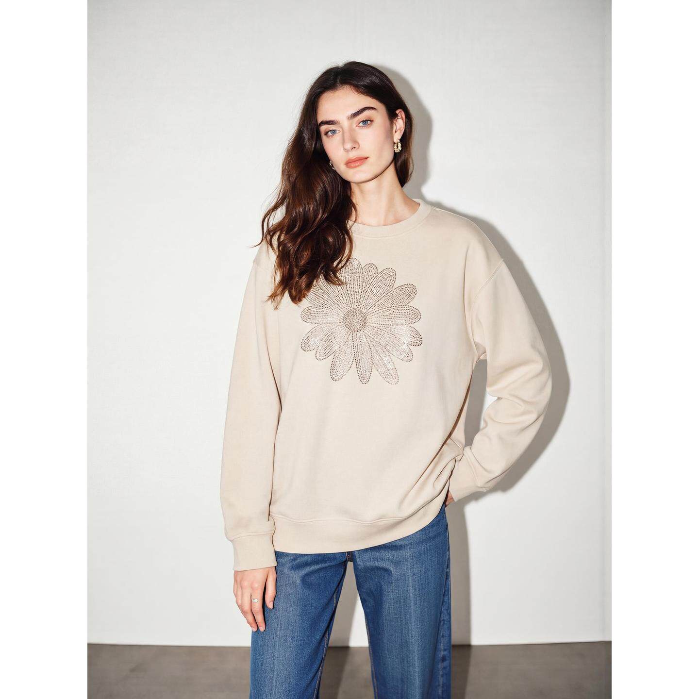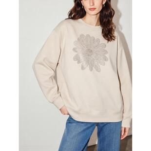 新款 百家好杏色花卉烫钻圆领卫衣女2026春季 慵懒上衣 House Basic