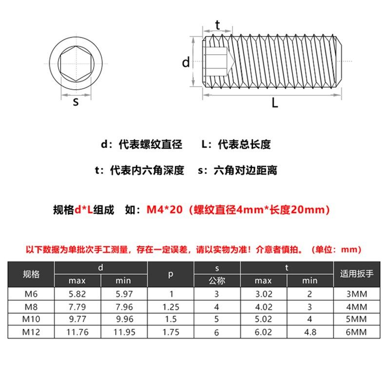 12.9机米顶丝止付内六角紧定螺丝高强度凹端尖头无头螺钉M2M3M4M8