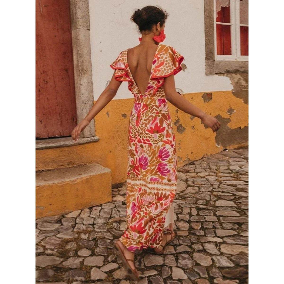 neck dress ruffled backless V领荷叶边开衩露背连衣裙女 slit
