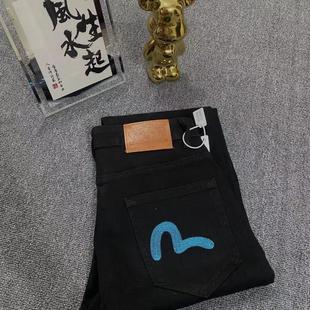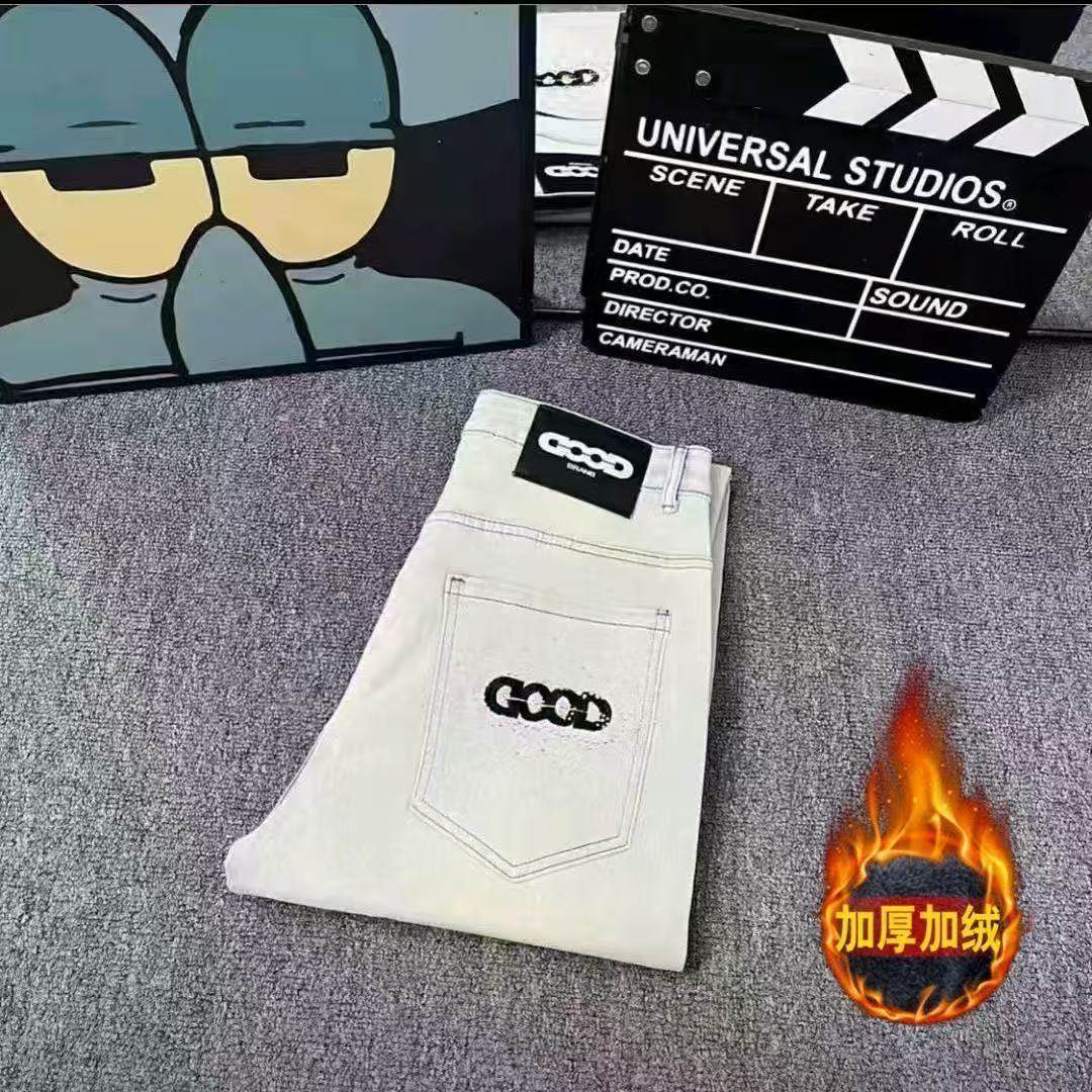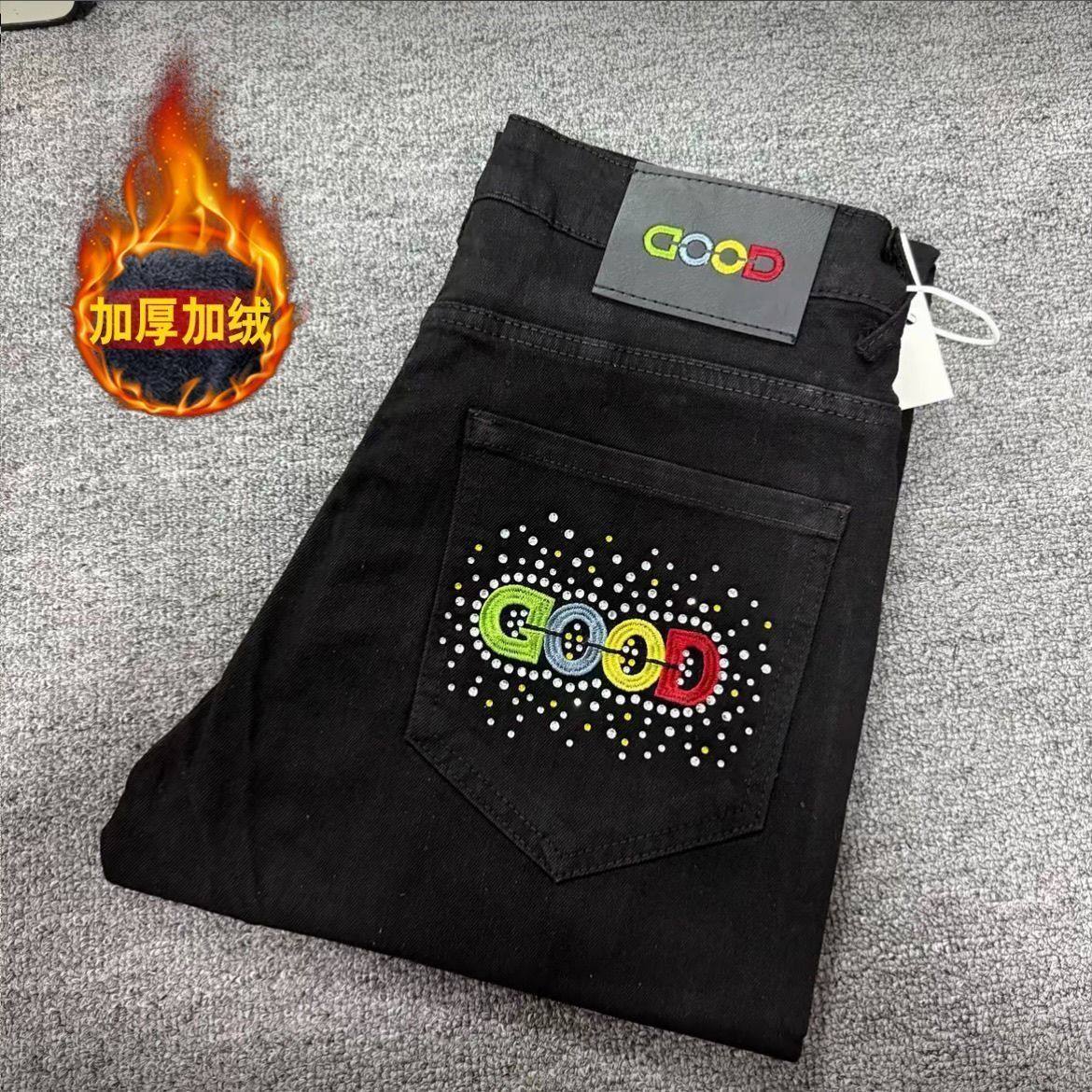 显瘦长裤 男女加绒加厚修身 男 潮牌彩色GOOD刺绣烫钻牛仔裤 秋冬季