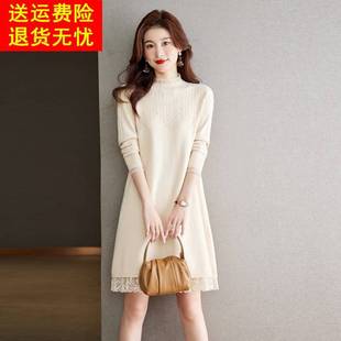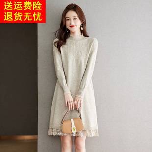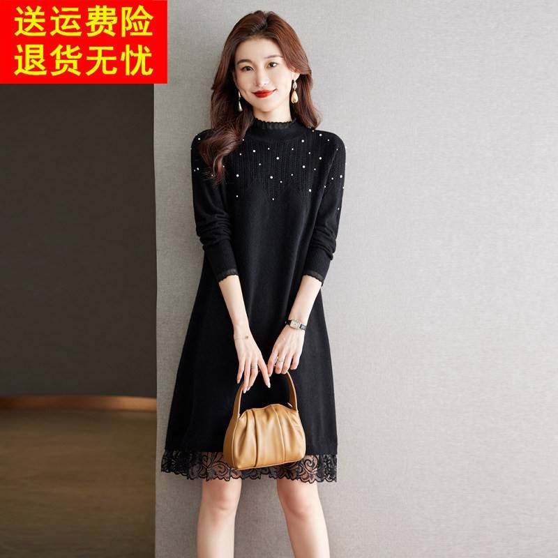 打底衫 蕾丝针织连衣裙毛衣女秋冬中长款 羊毛衫 女装 钉珠裙宽松大码