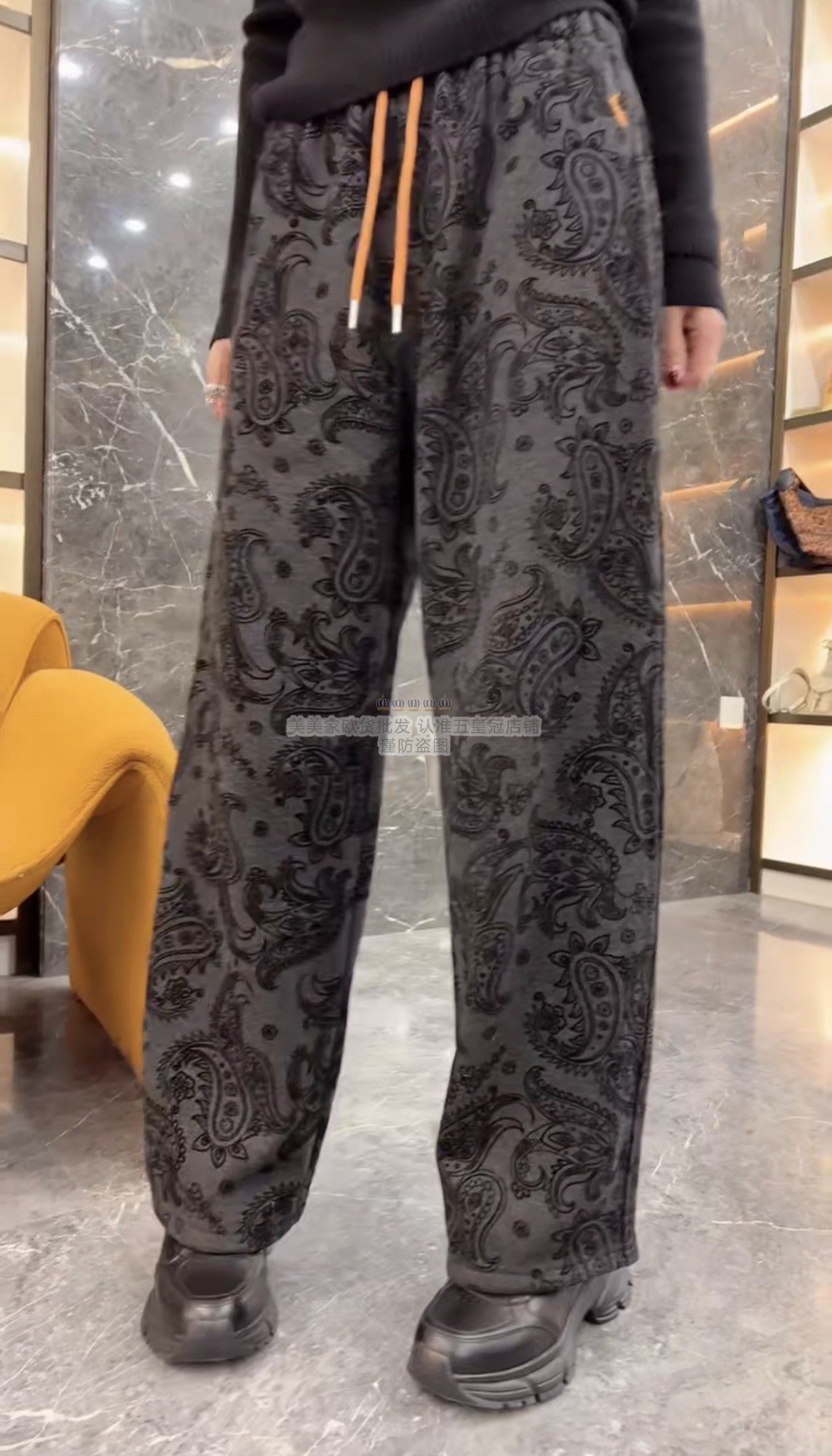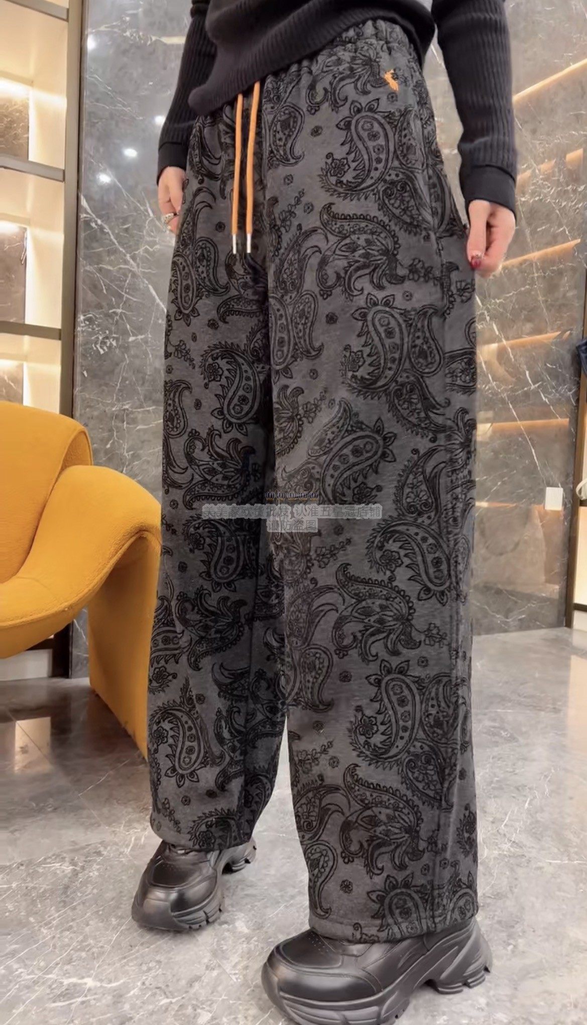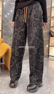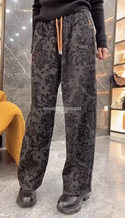 松紧腰抽绳加绒显瘦裤 腰果花提花休闲阔腿裤 子 新款 欧洲站2025冬季