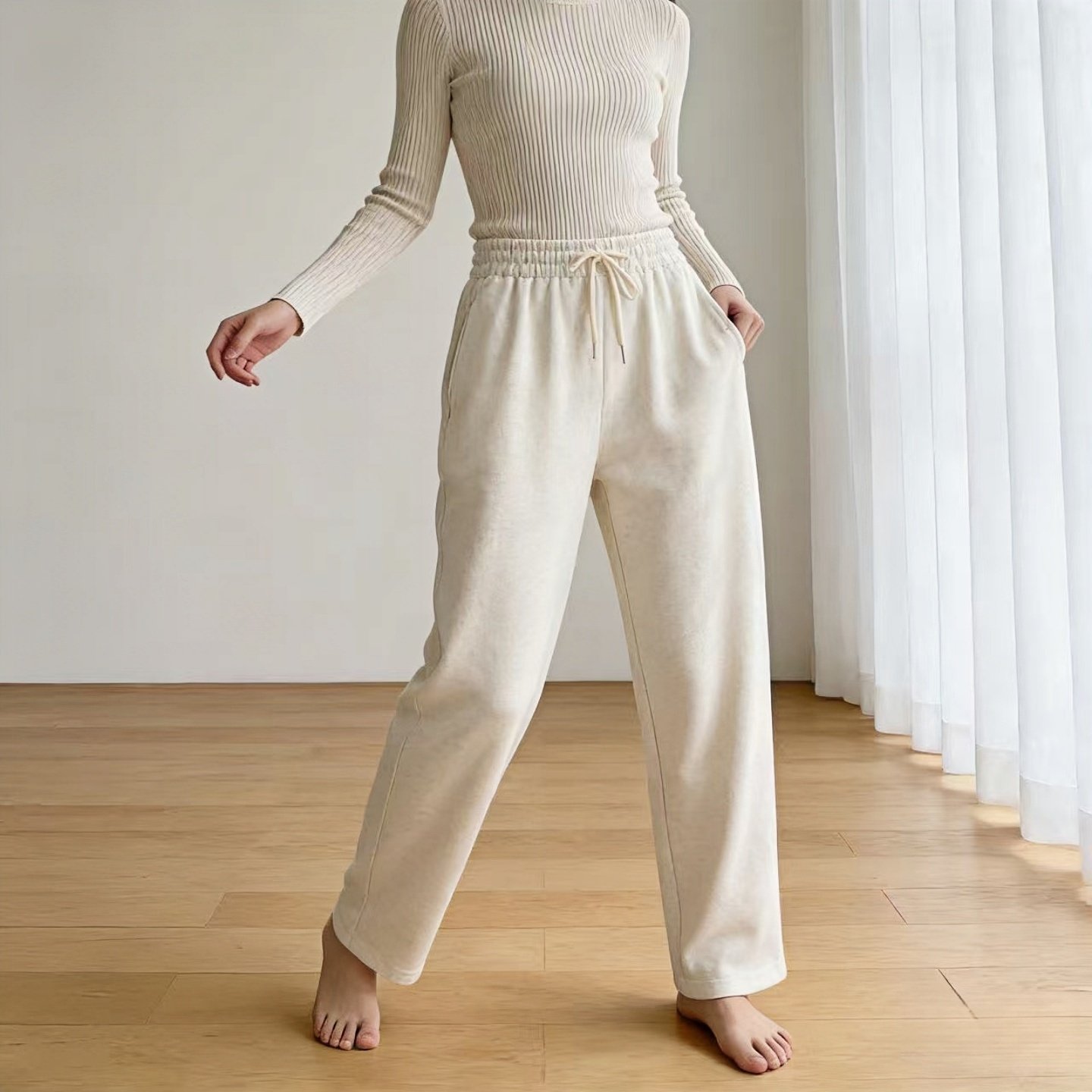 运动直筒高级感垂感羊羔绒加厚棉裤 毛呢卫裤 子女秋冬季 白色加绒裤