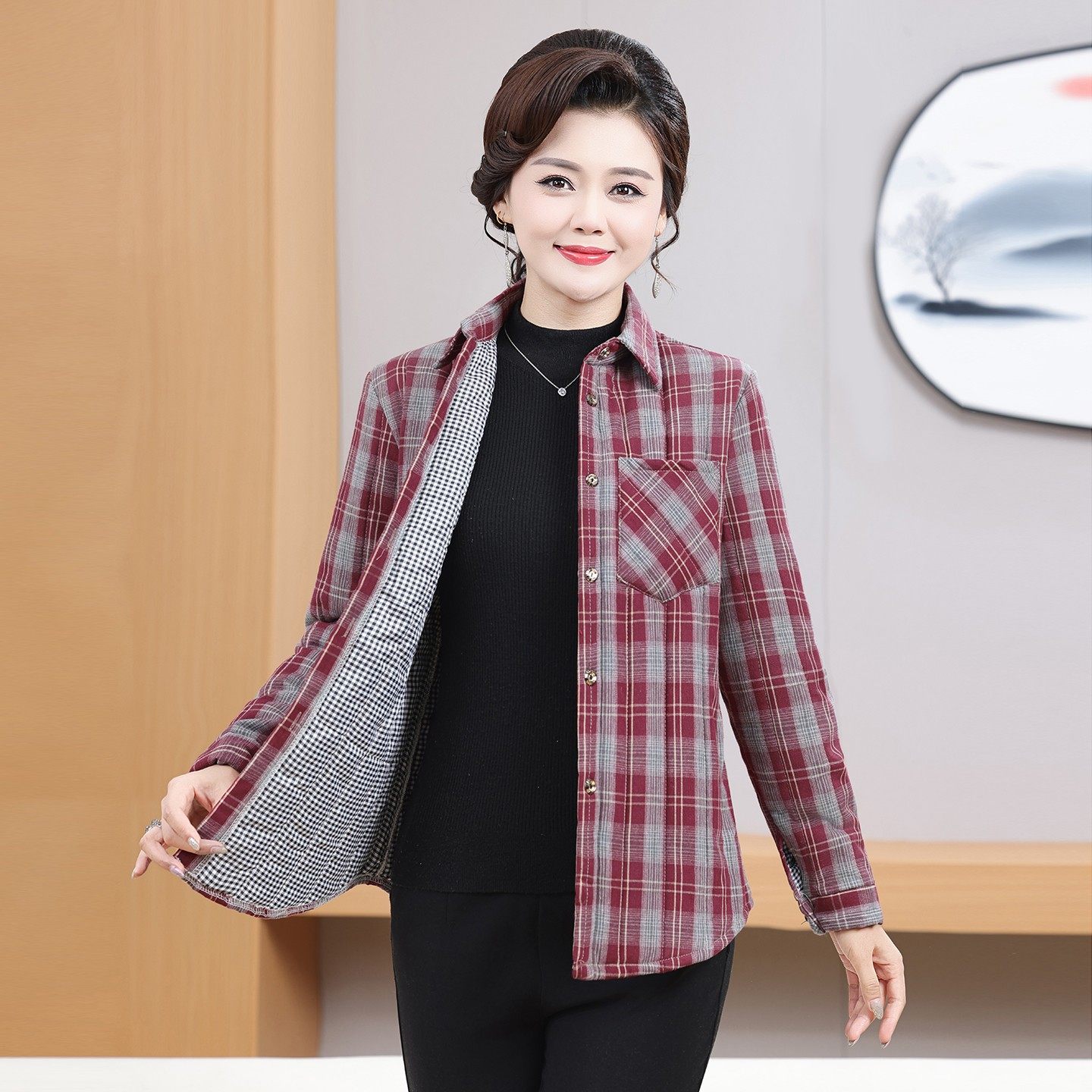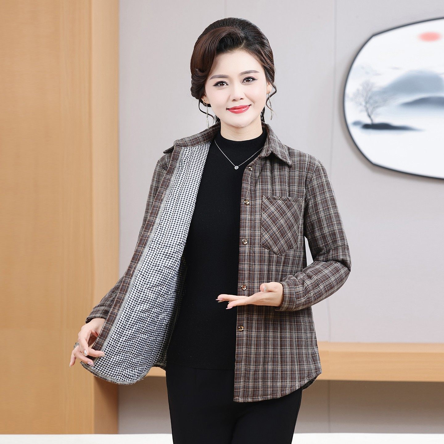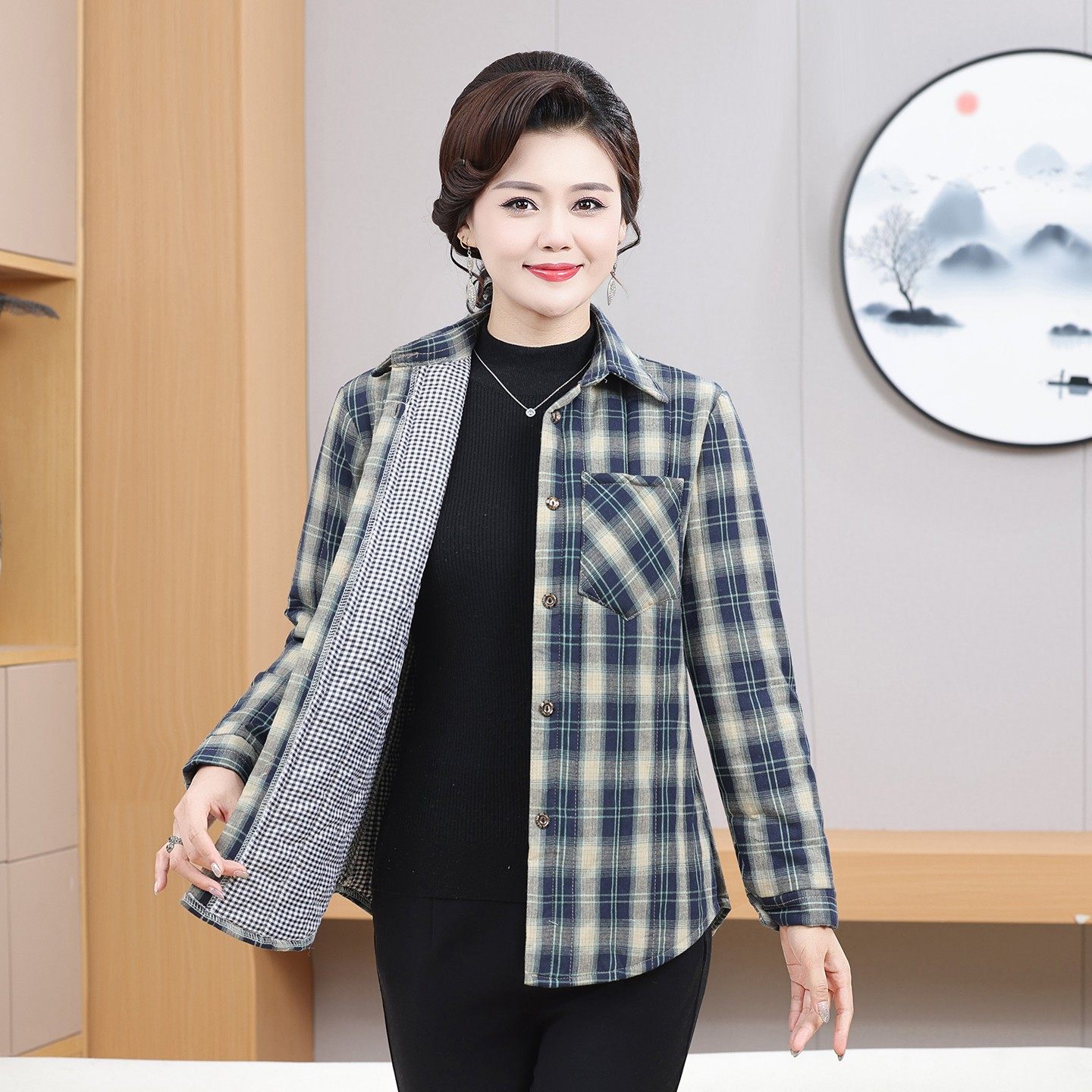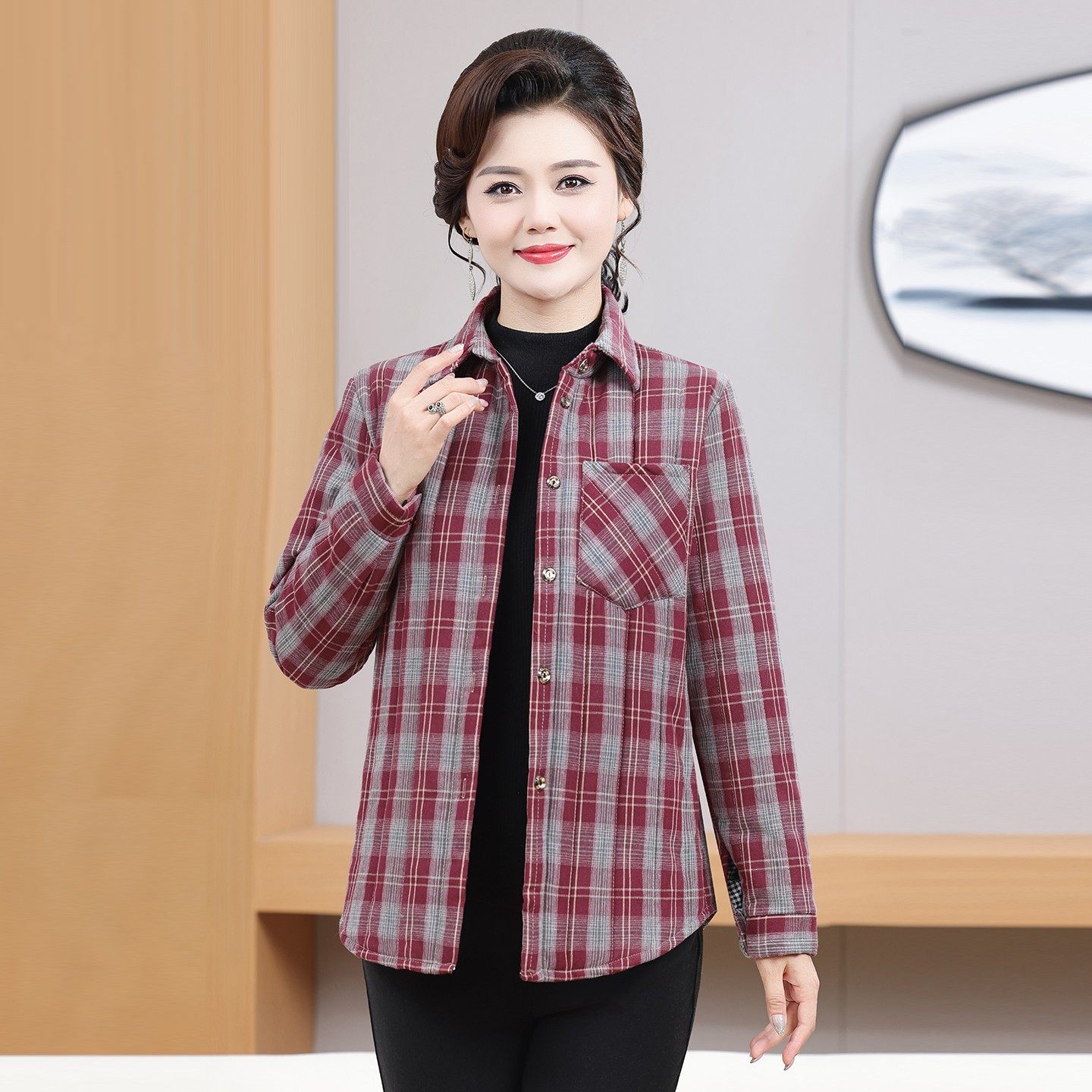 中老年洋气加厚保暖衬衣休闲 新款 妈妈秋冬格子夹棉衬衫 外套长袖