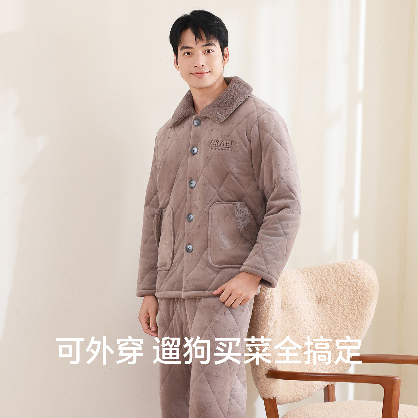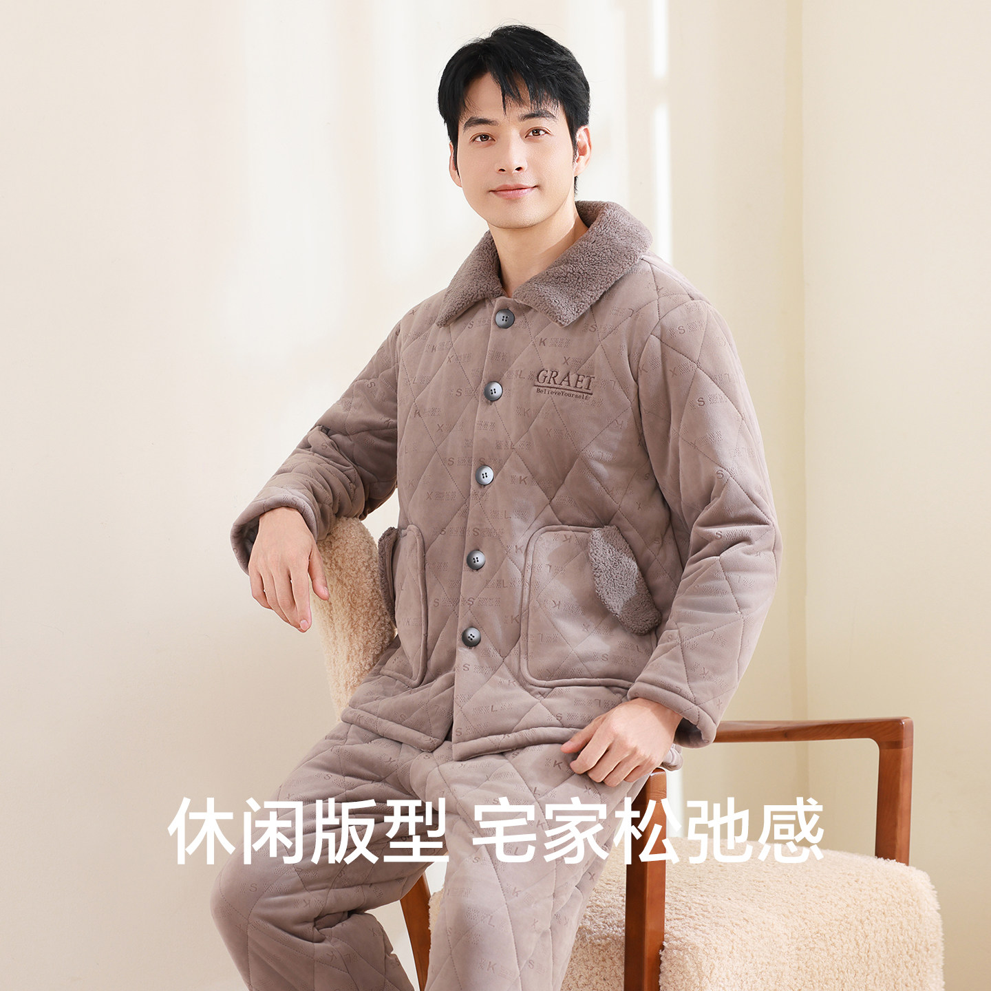 开衫 家居服套装 加厚加绒保暖可外穿珊瑚绒大码 颗粒绒睡衣男秋冬季