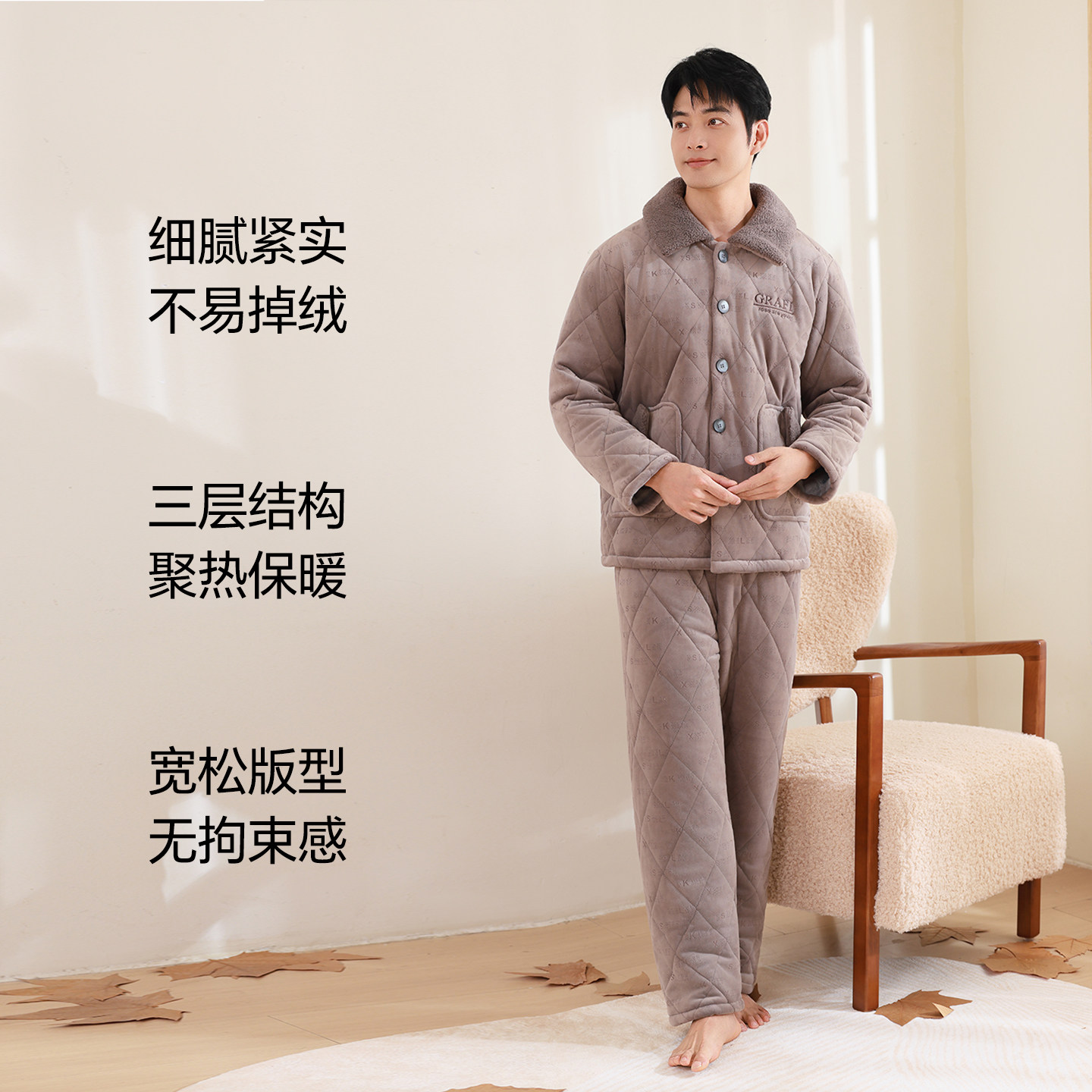开襟超柔软家居服套装 简约长袖 可外穿 秋冬新款 三枪纯棉睡衣男士