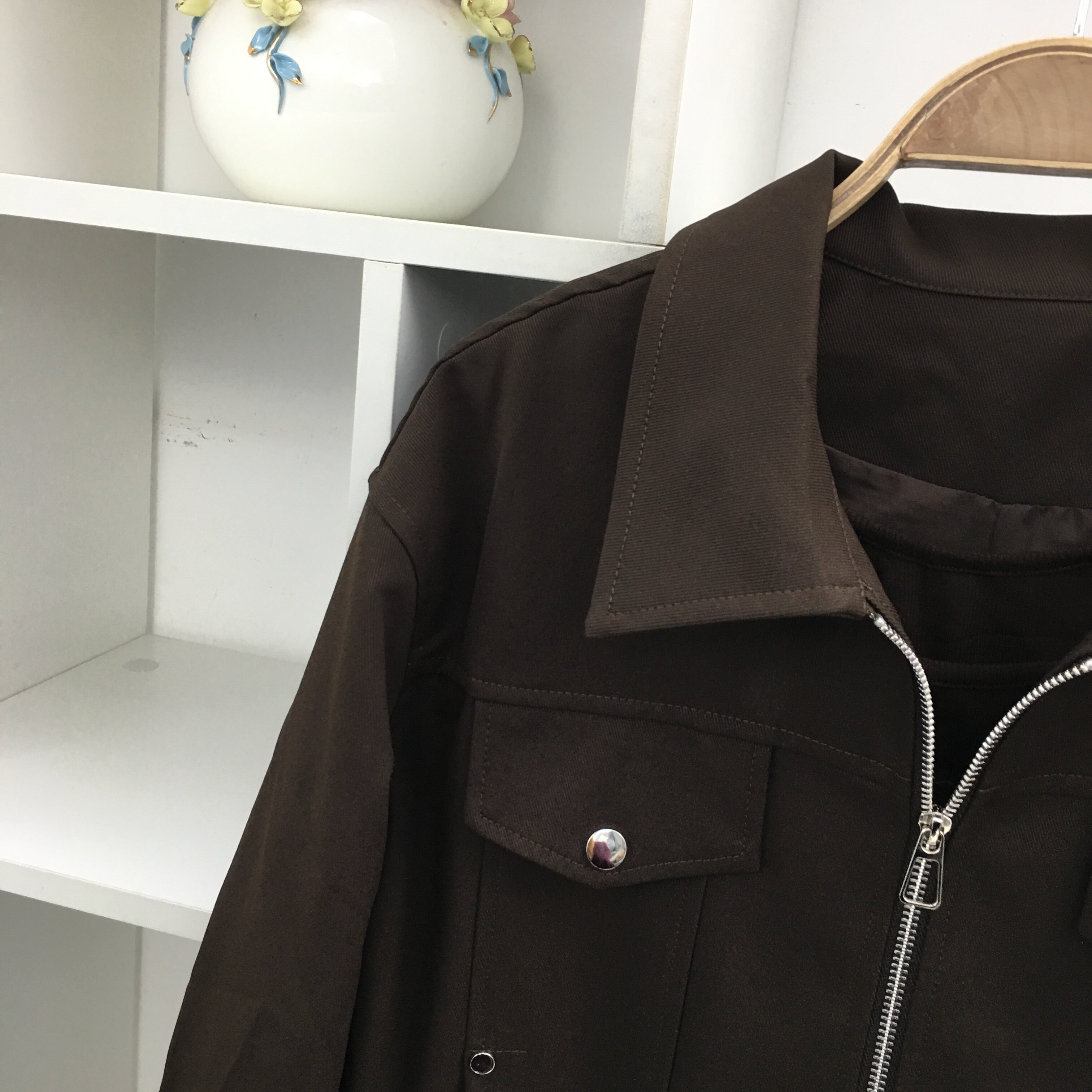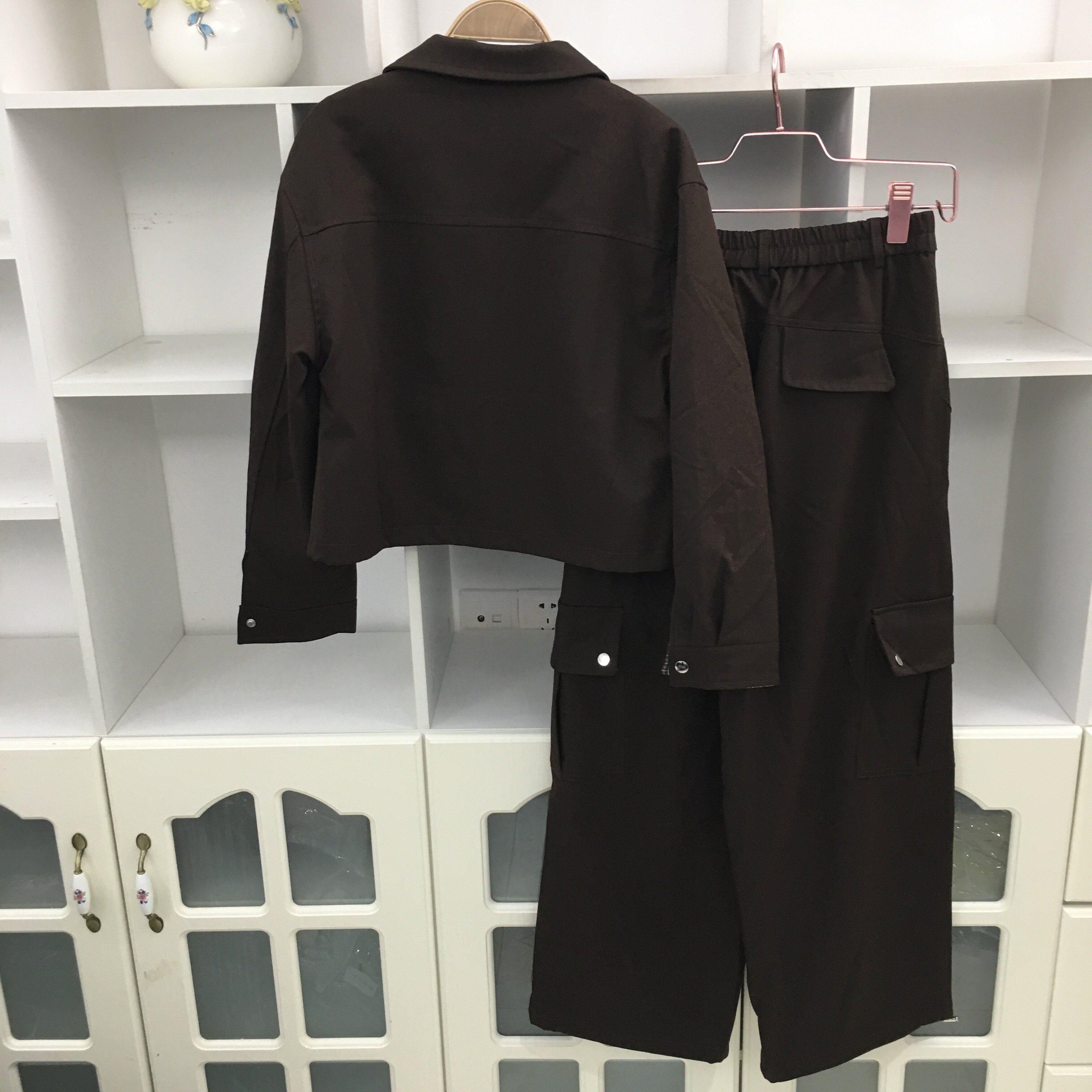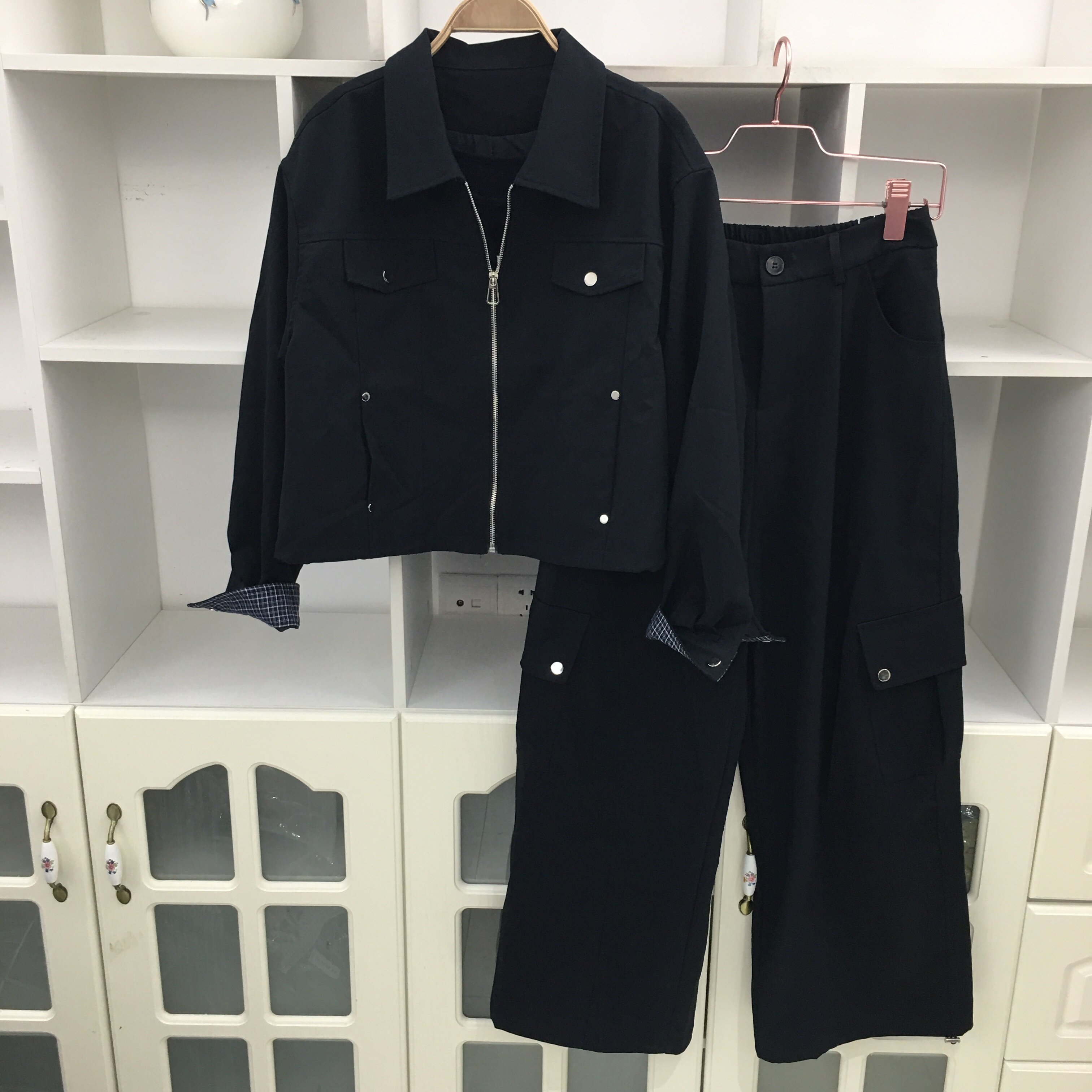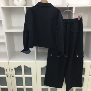 拉链款 翻领长袖 工装 短外套夹克开衫 春秋季 高腰阔腿裤 两件套套装