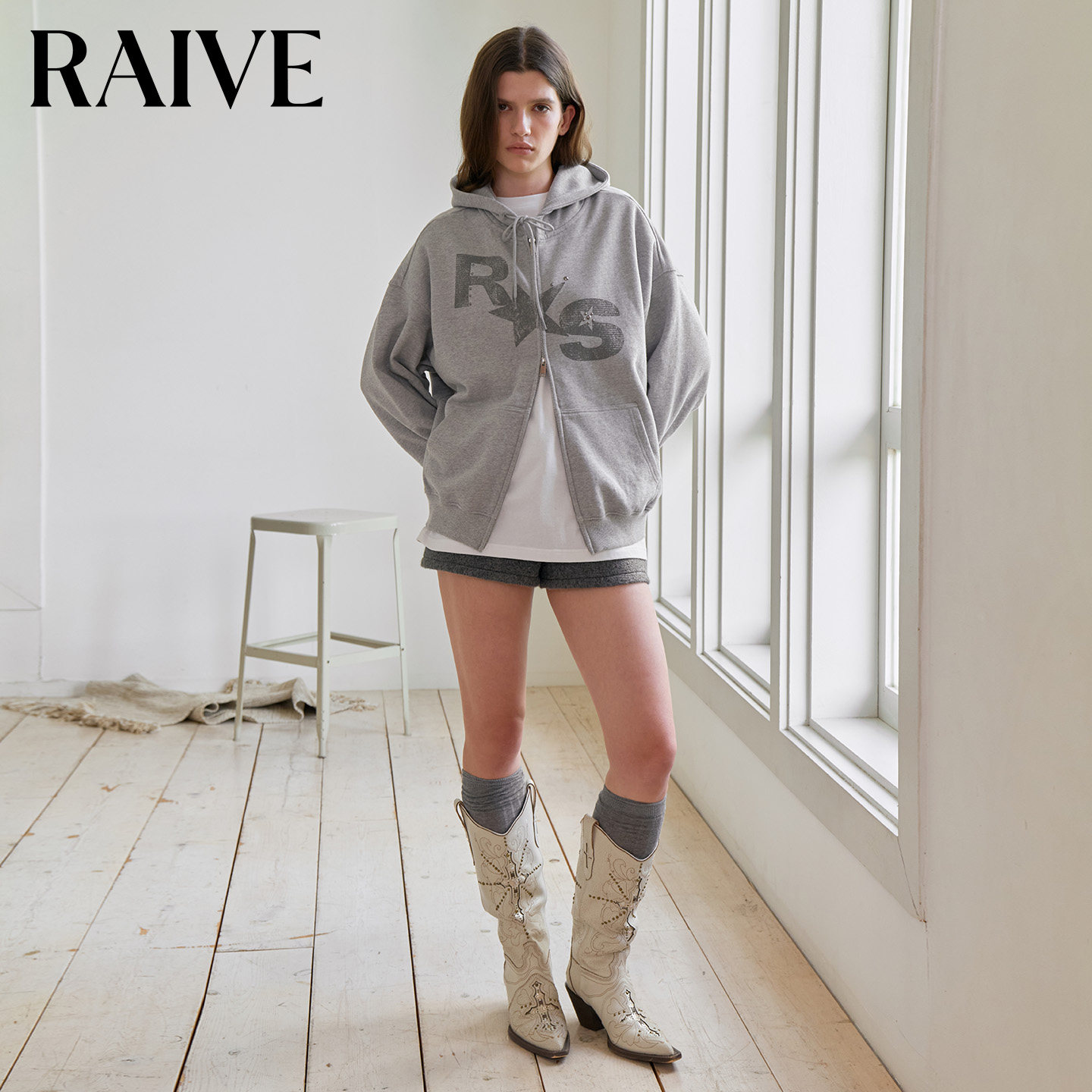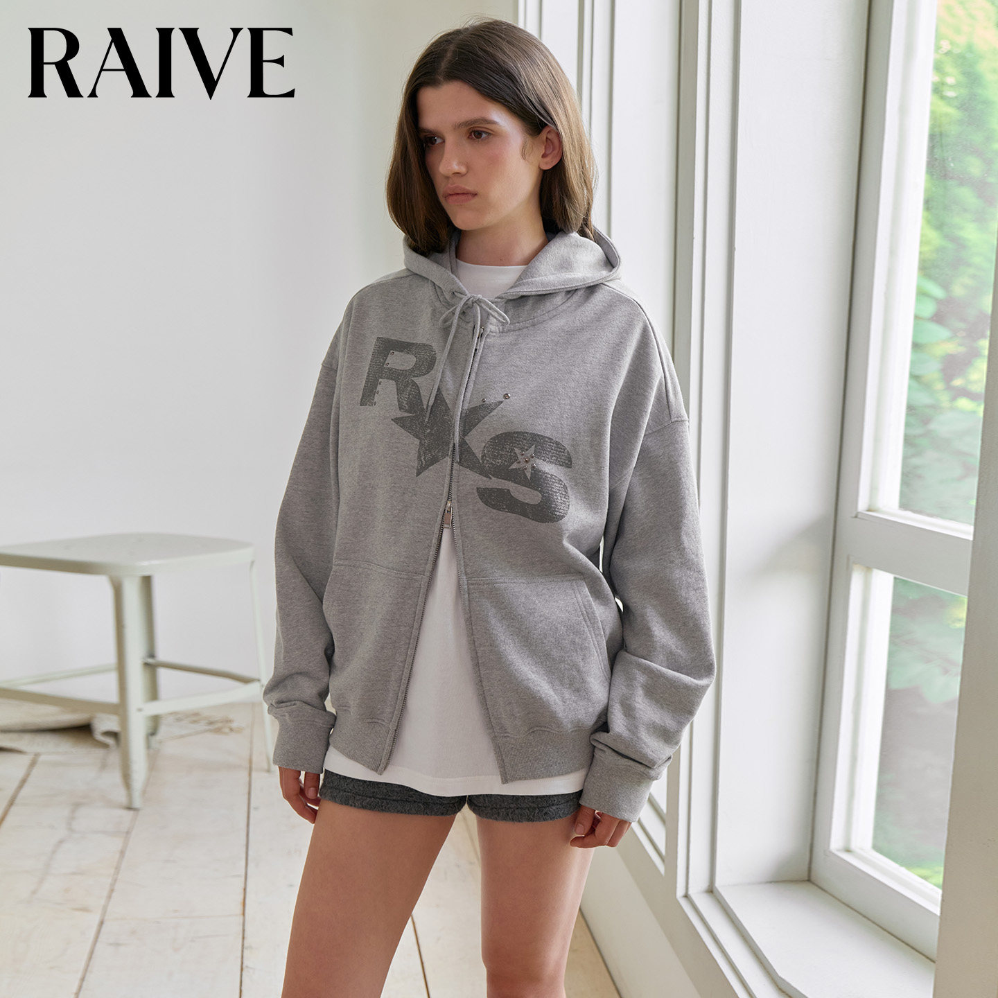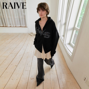 RAIVE2026春季 女上衣星星印花铆钉纯色双拉链连帽卫衣短外套