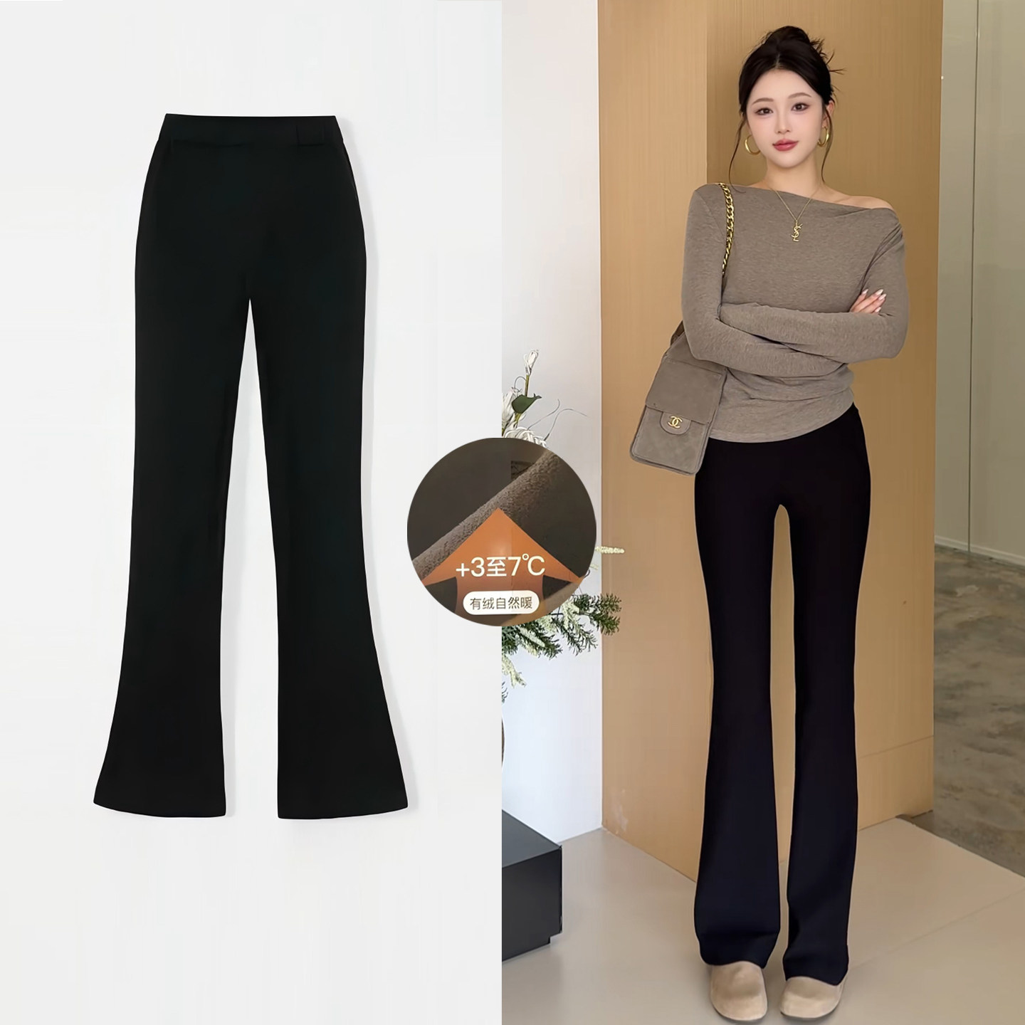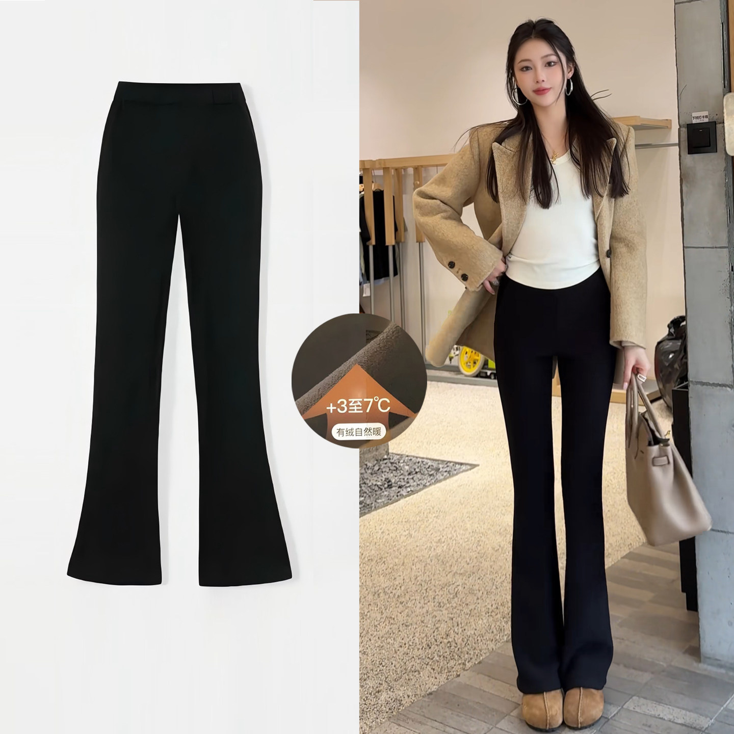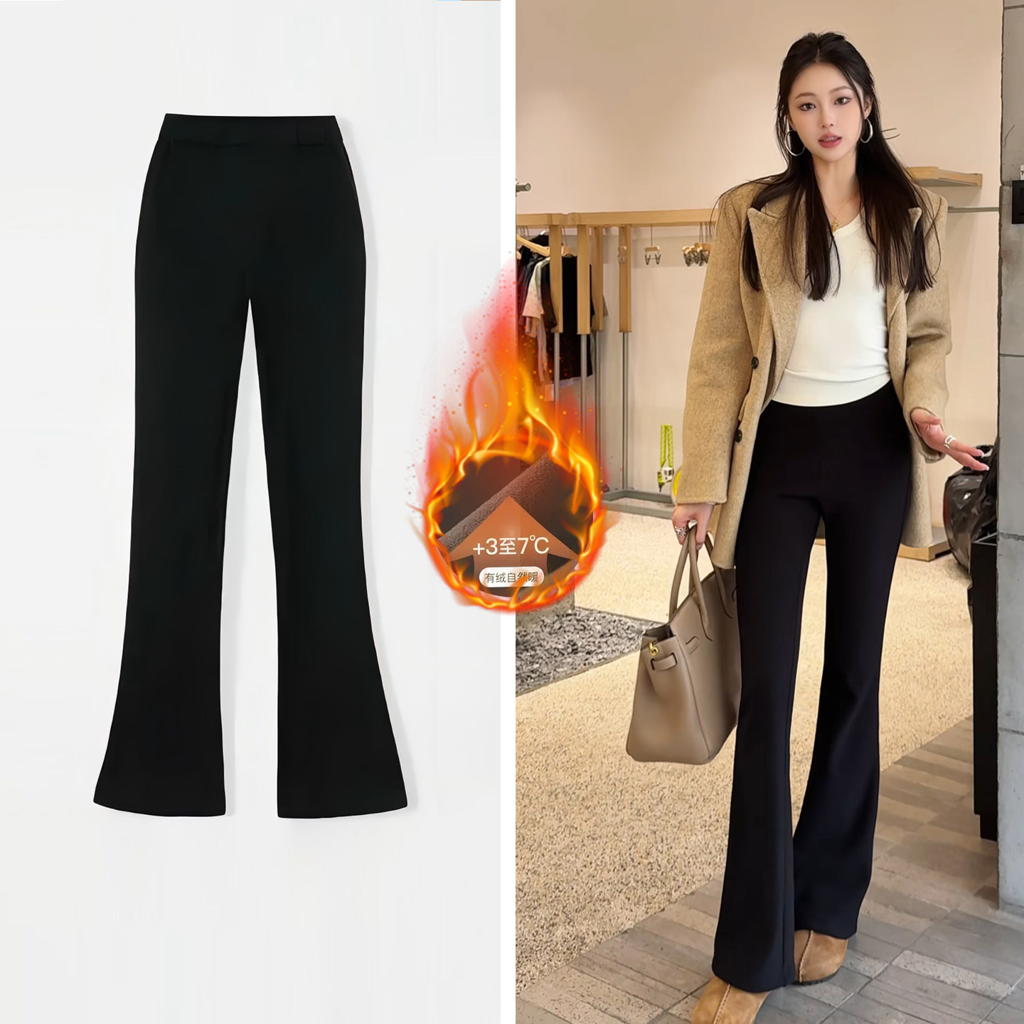 马蹄喇叭裤 小个子保暖显瘦西装 女2025秋冬新款 加绒加厚黑色微喇裤