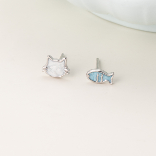 猫蛰S999足银猫与鱼耳钉清纯甜美可爱女纯银耳饰品精致小众设计感
