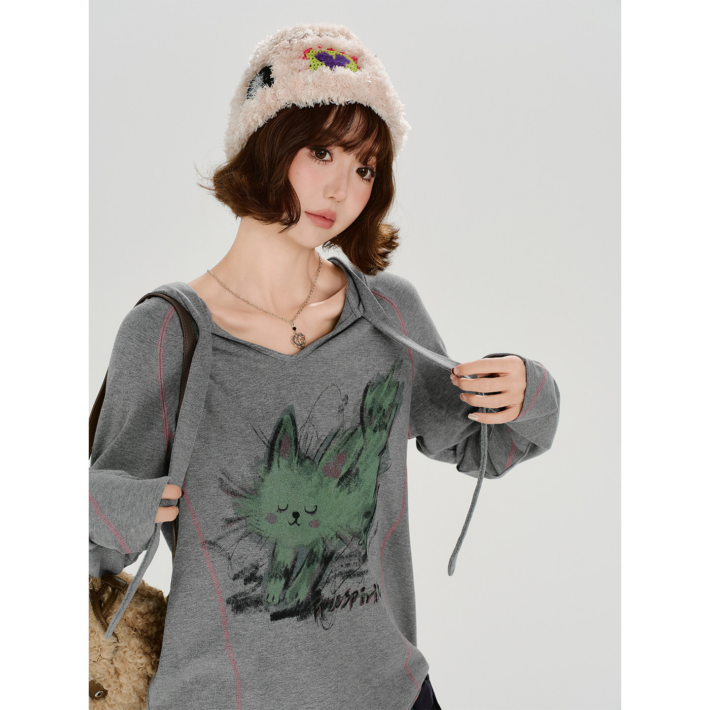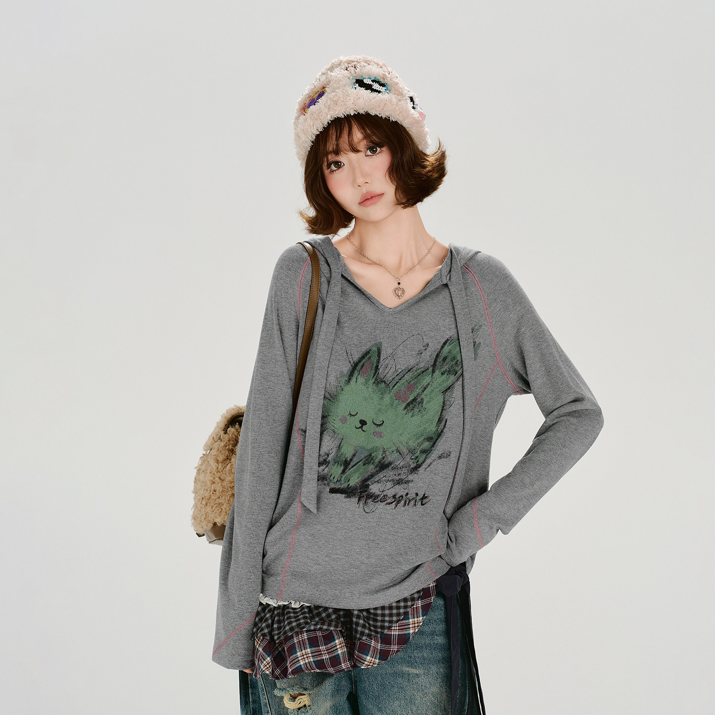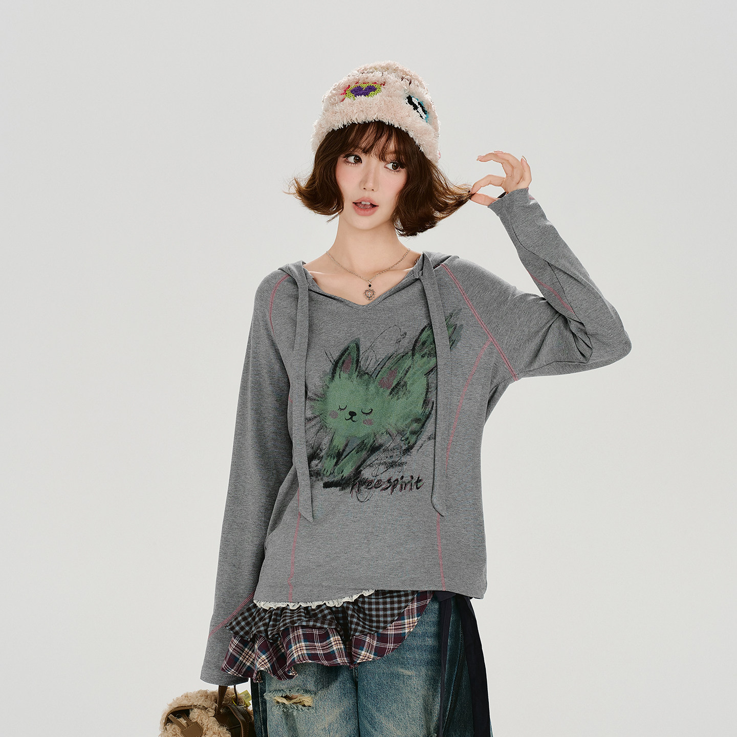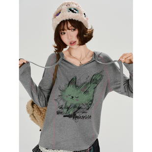 新款 t恤女秋季 设计感宽松休闲上衣 复古印花连帽长袖 Girlyhalo美式