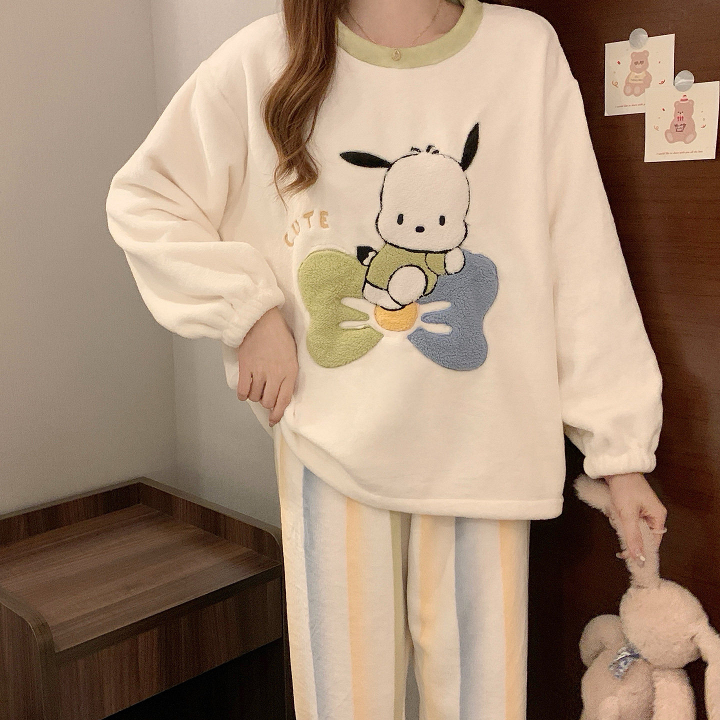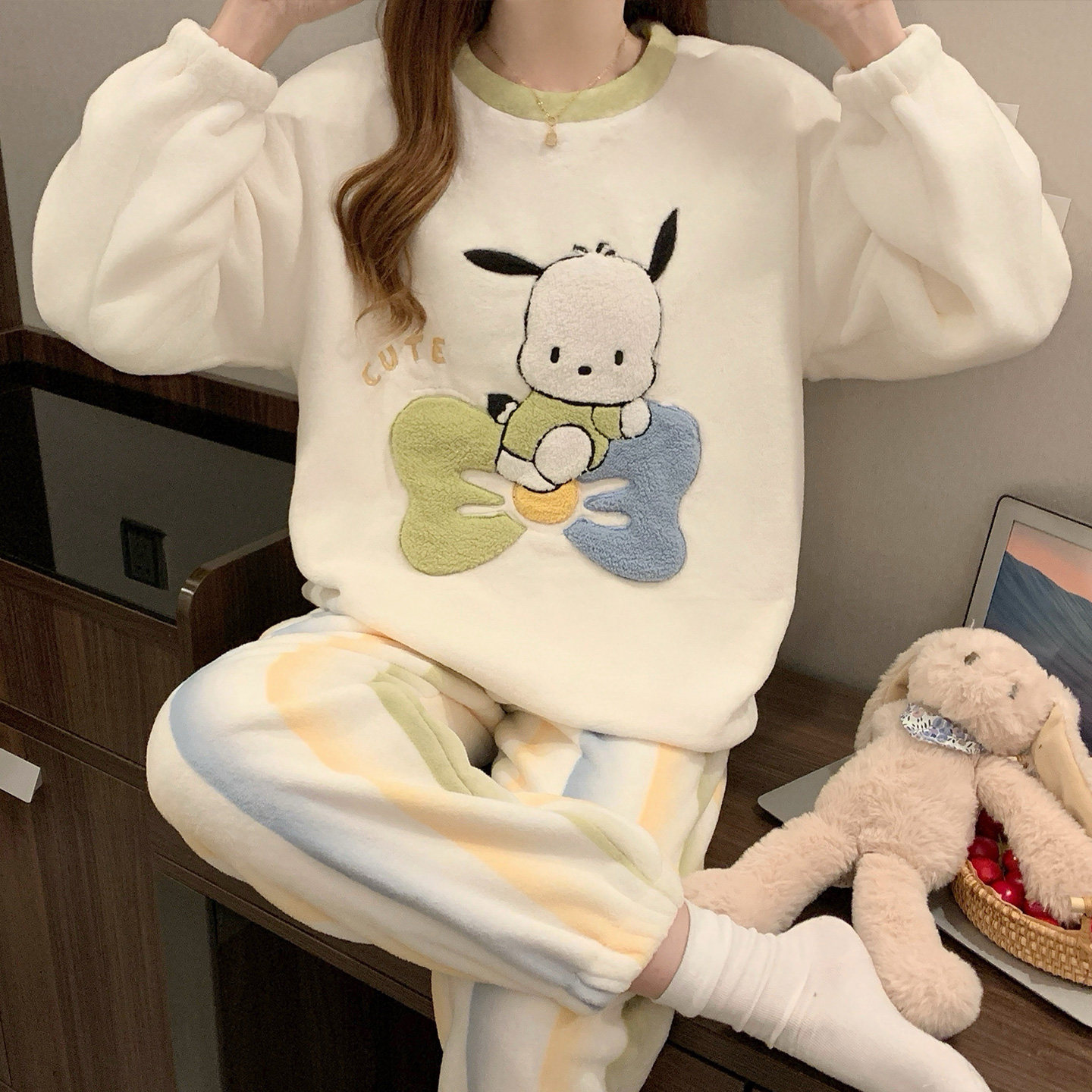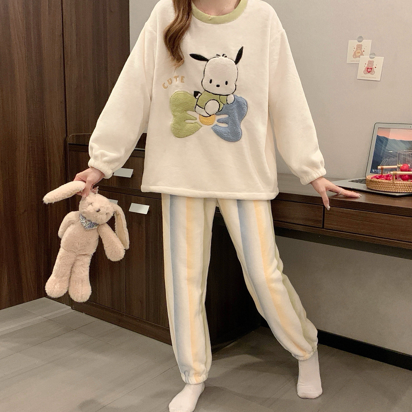 可外穿薄款 珊瑚绒圆领长袖 家居服 甜美卡通套装 法兰绒睡衣女秋冬季