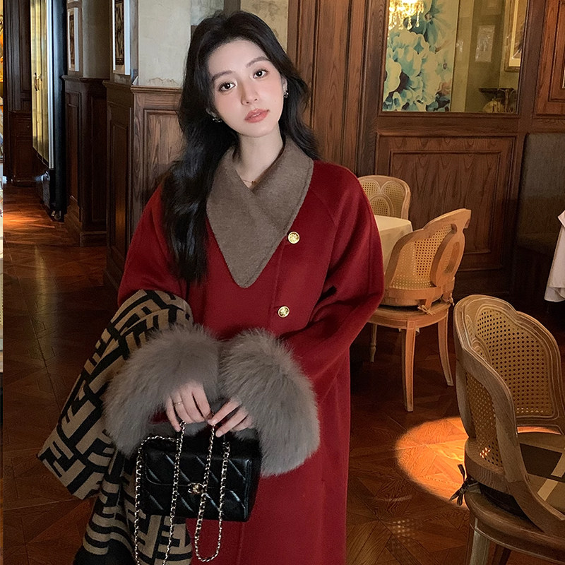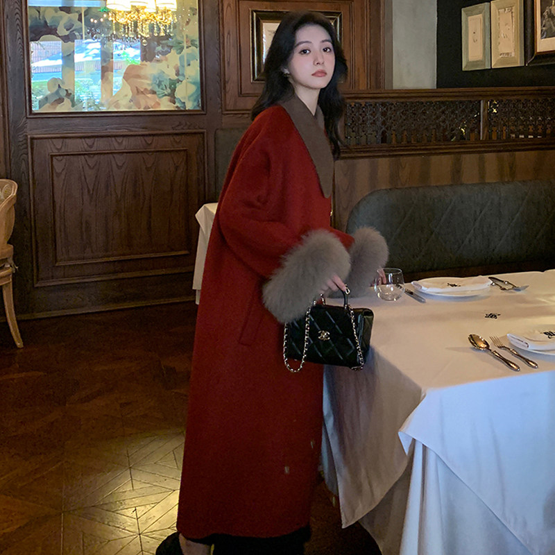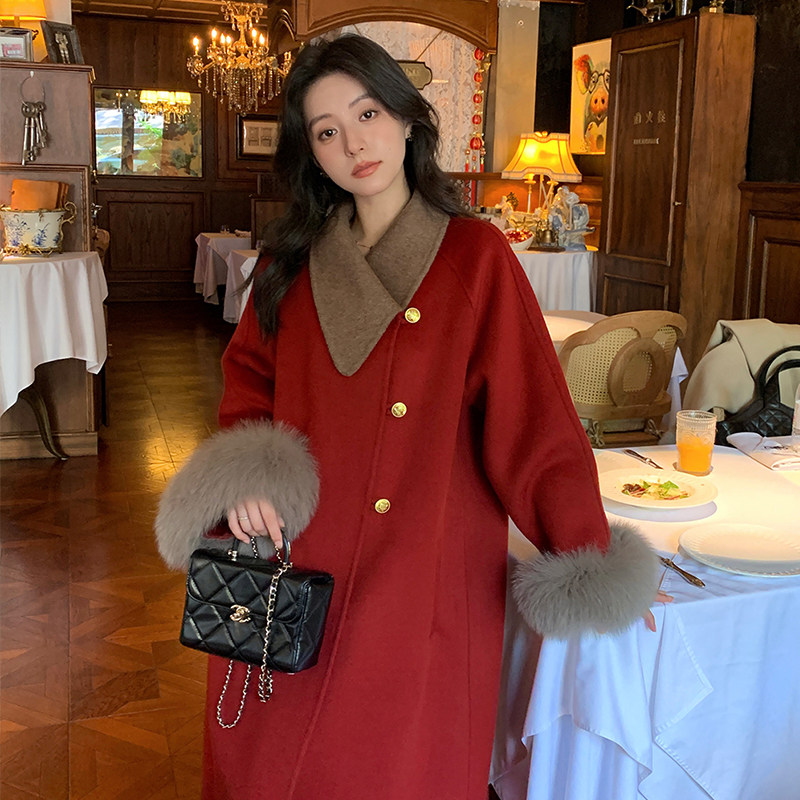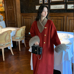 新款 秋冬季 狐狸毛新年圣诞节毛呢外套 双面羊毛大衣女中长款 新中式