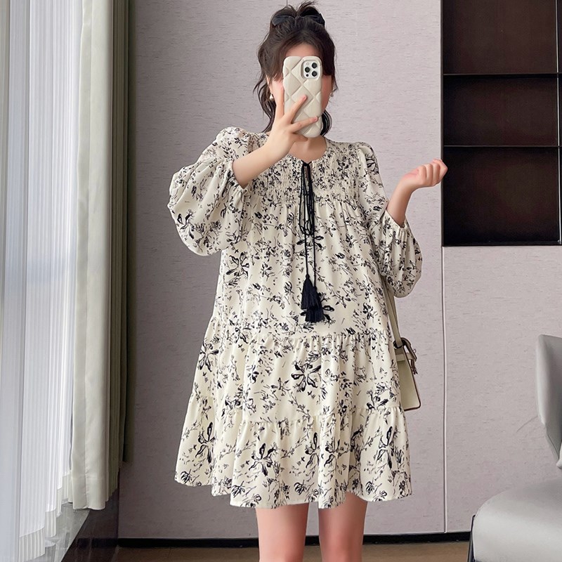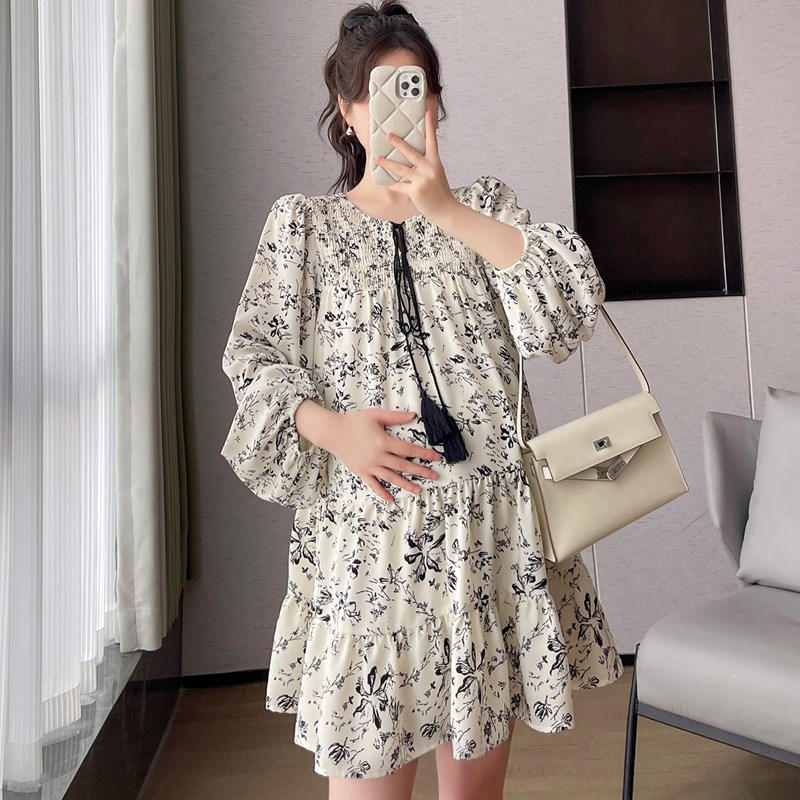春装 休闲裙子春季 时尚 碎花雪纺连衣裙宽松大码 A字裙春 长袖 孕妇装