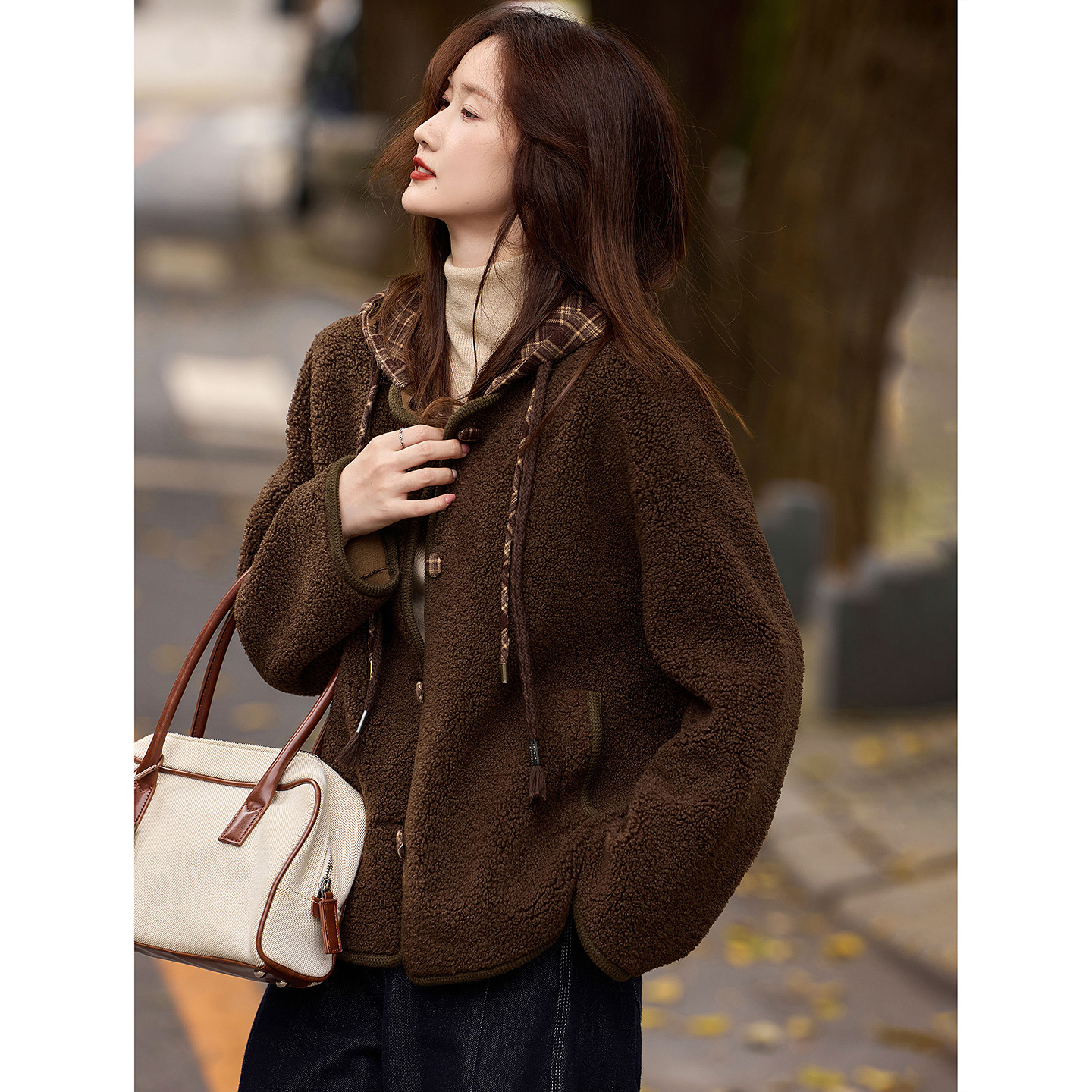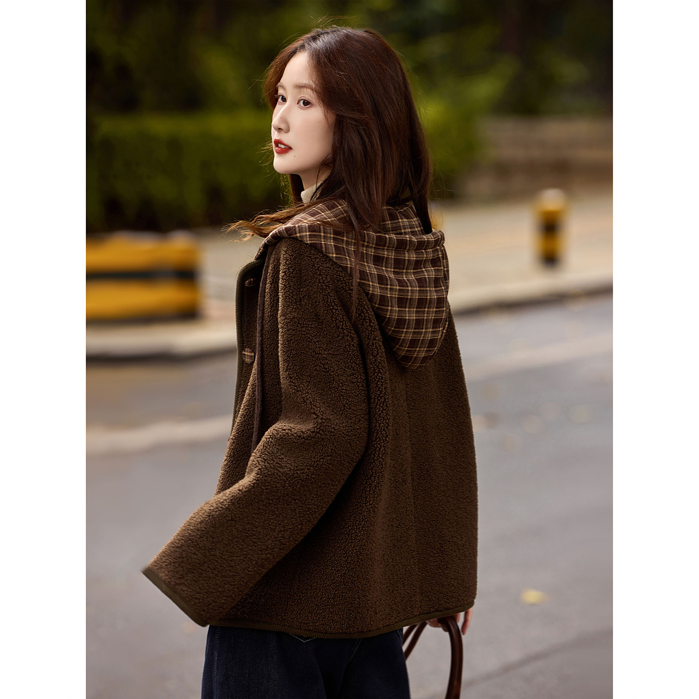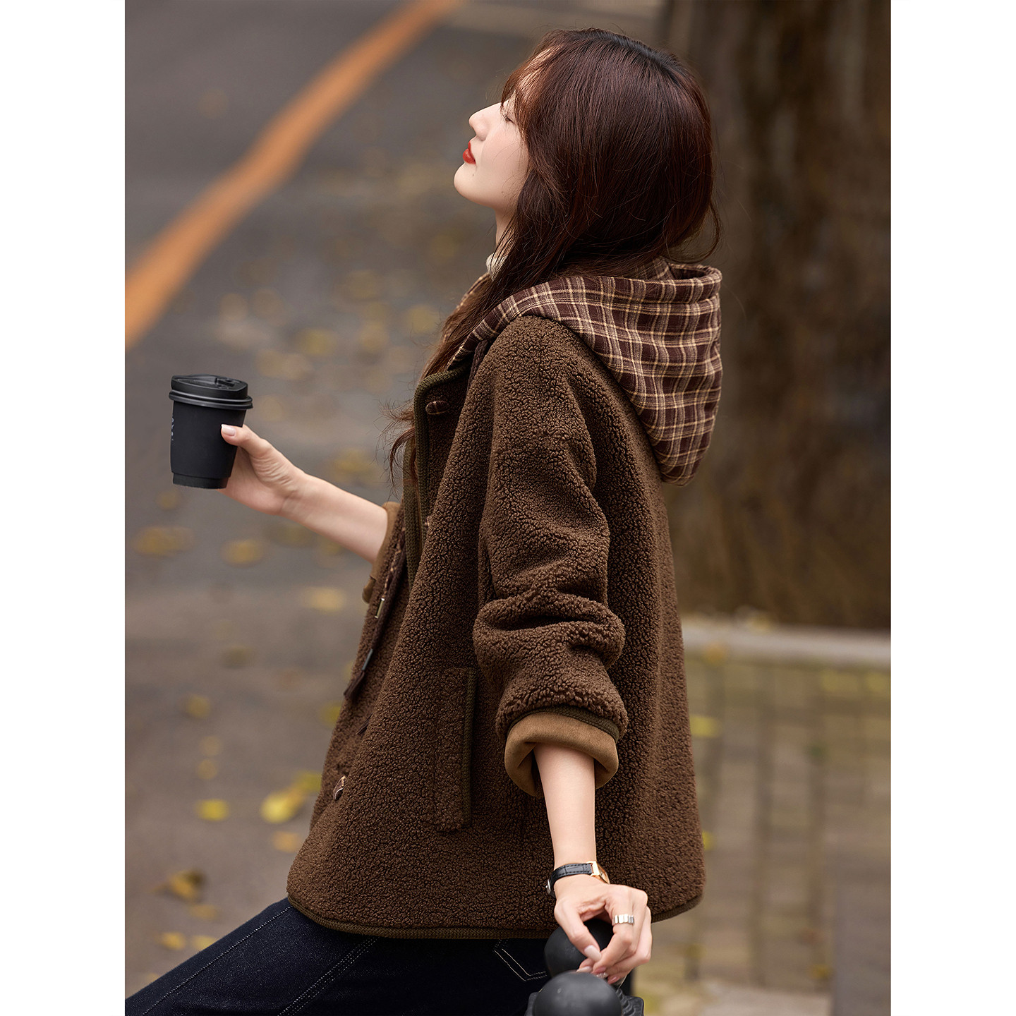 时尚 苏醒 冬季 摇粒绒毛毛厚款 格子连帽仿羊羔毛皮草外套 乐园新品