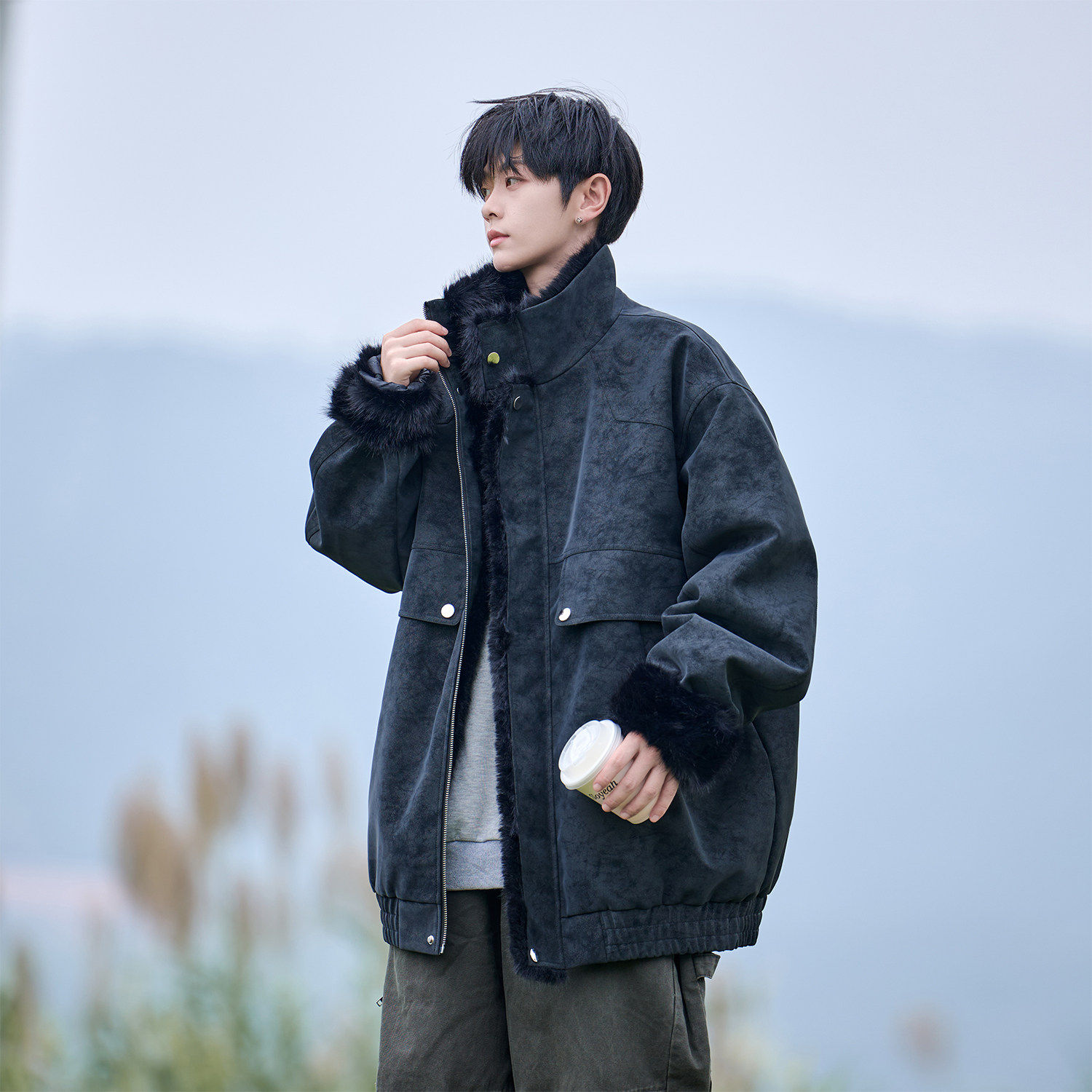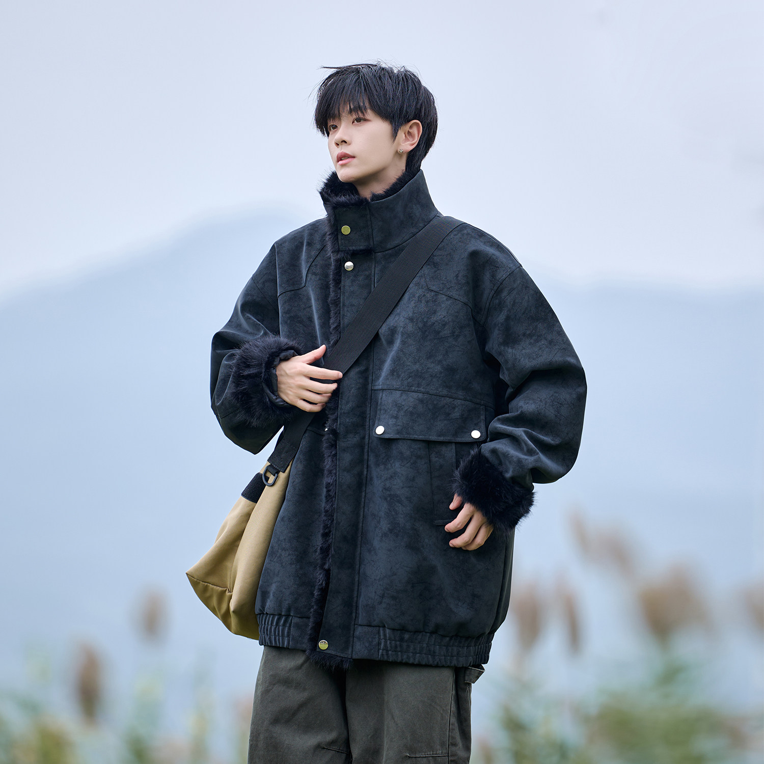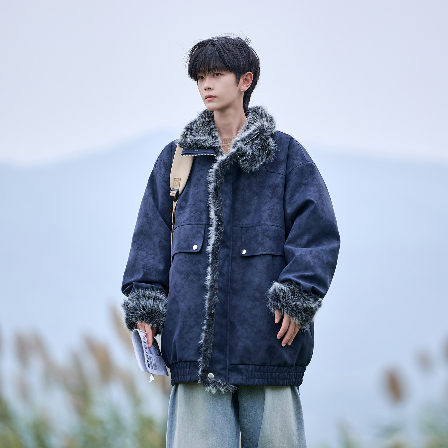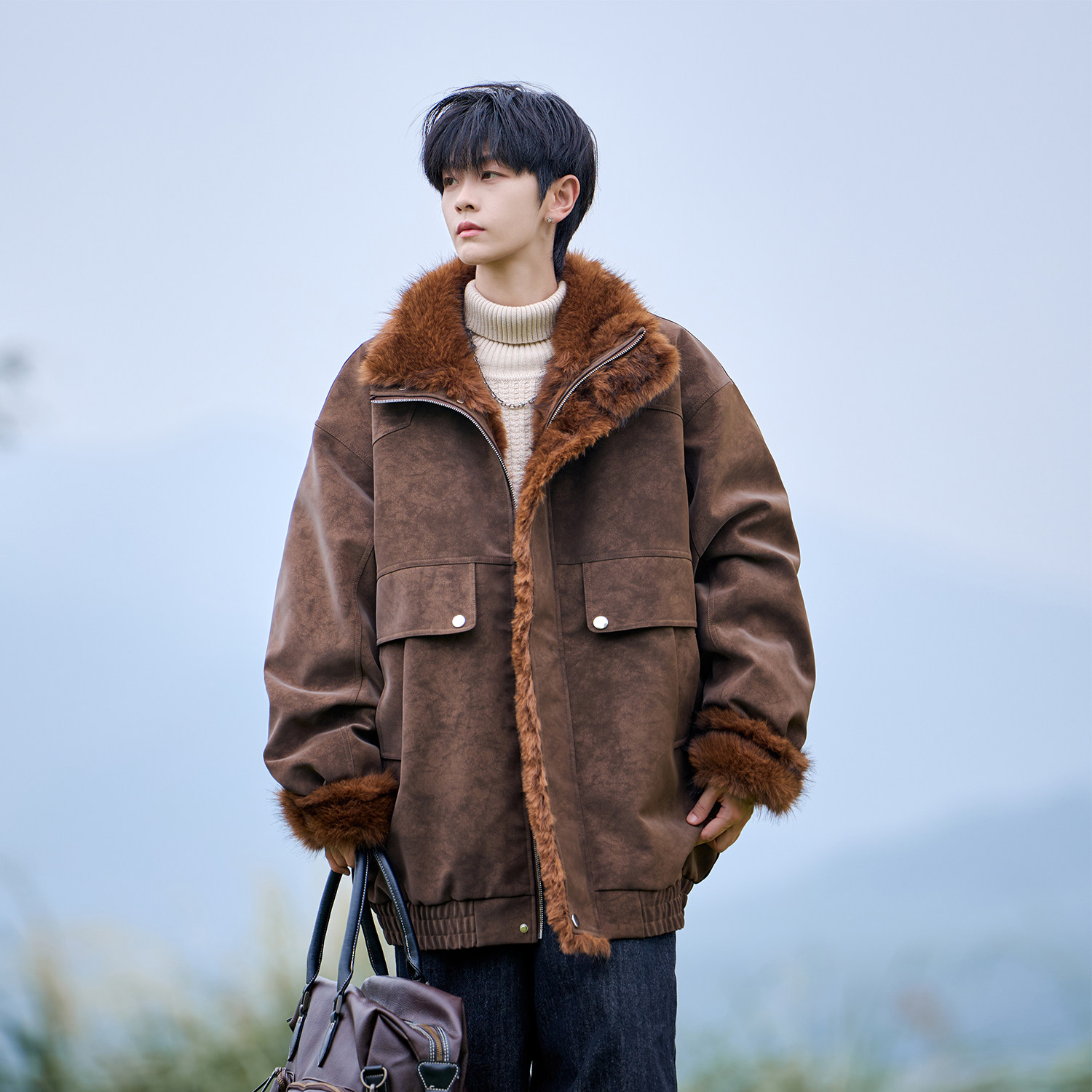 男运动健身PU皮棉服男 保暖皮夹克棉衣外套冬装 鹿家门新款 宽松大码